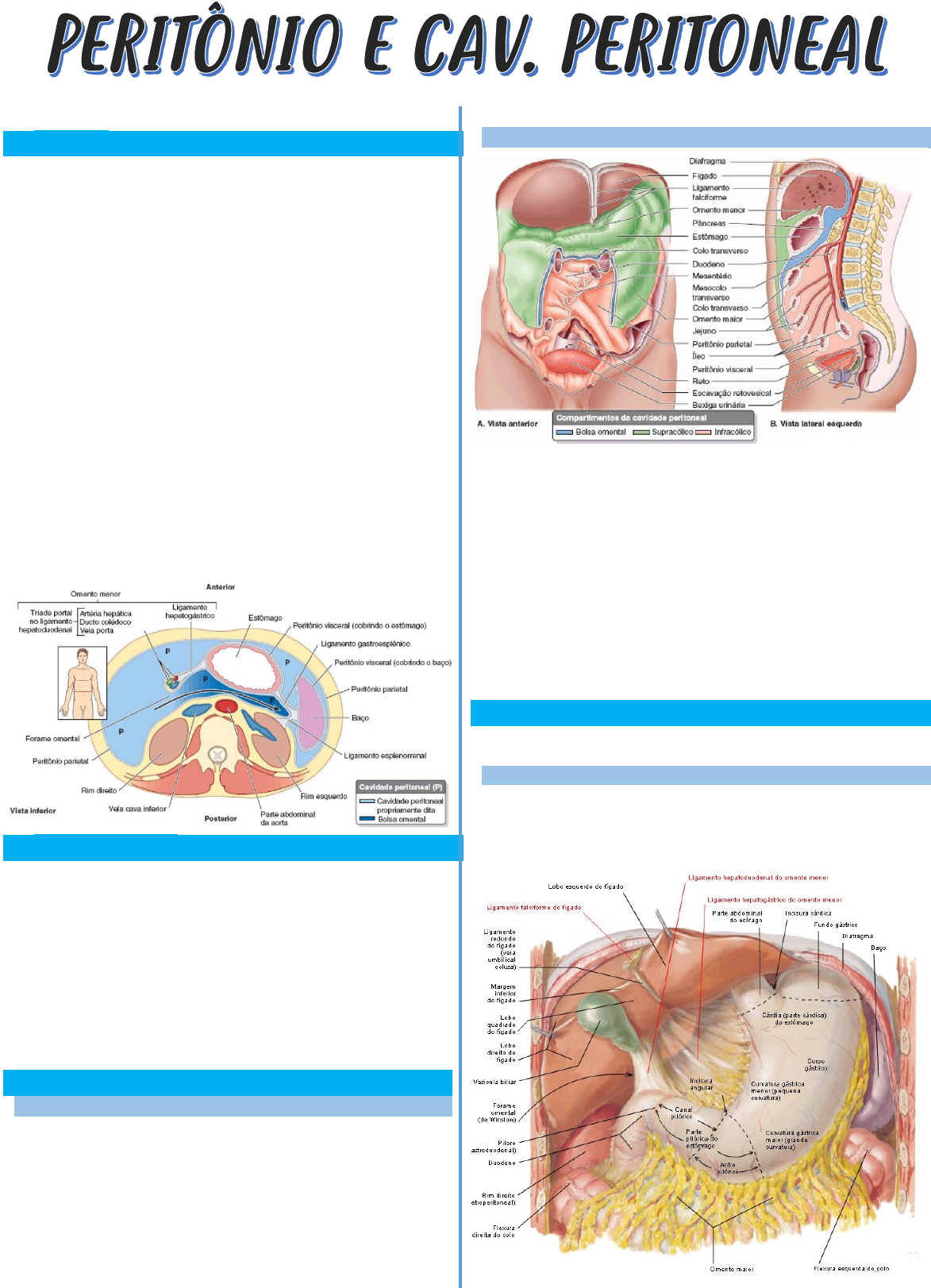 1. Introdução Túnica serosa transparente, contínua, brilhante e deslizante; Reveste a cavidade abdominopélvica e recobre as vísceras; Duas lâminas contínuas: Peritônio visceral: Vascularização e inervação (somática) igual à da parede da região que o reveste. Sensível a pressão, dor, calor, frio e laceração. Dor mal localizada. Peritônio parietal: Vascularização e inervação (visceral) igual à da parede da região que o reveste. Insensível a toque, calor, frio e laceração. Dor bem localizada. Exceção: Face inferior da parte central do diafragma inervada pelos nervos frênicos. Órgãos intraperitoneais: Órgãos quase completamente revestidos pelo peritônio visceral. Órgãos extra, retro e subperitoneais: Cobertos apenas parcialmente. 2. CAVIDADE PERITONEAL Continua inferiormente até a cavidade pélvica; Contém uma fina película de líquido peritoneal: Lubrificação; Diminuição do atrito no movimento entre vísceras. Contém leucócitos e anticorpos que combatem a infecção. Absorvido pelos vasos linfáticos da face inferior Diafragmática Abriga uma grande extensão de intestino. Área de superfície muito maior do que a pele externa do corpo. 3. FORMAÇÕES PERITONEAIS 3.1. Mesentério Lâmina dupla de peritônio; Invaginação do peritônio e continuação dos peritônios visceral e parietal; Comunicação neurovascular entre o órgão e a parede. Une um órgão intraperitoneal à parede do corpo. Possui tecido conjuntivo com sangue e vasos linfáticos, nervos, linfonodos e gordura. 3.2. Omento Extensão ou prega de peritônio em duas camadas. Omento maior: Quatro camadas “avental” Pende a partir da curvatura maior do estômago e da parte proximal do duodeno. Dobra-se de volta para fixar-se na face anterior do colo transverso. Omento menor: Duas camadas Curvatura menor do estômago e parte proximal do duodeno. Finaliza no fígado. 4. LIGAMENTOS PERITONIAIS Dupla camada de peritônio; Une o órgão a outro ou à parede do abdome; 4.1. Ligamentos peritoneais do fígado Ligamento falciforme ligado à parede anterior. Ligamento hepatogástrico ligado ao estômago. Ligamento hepatoduodenal ligado ao duodeno. Dá passagem à tríade portal. 4.2. Ligamentos peritoneais do estômago Ligamento gastrofrênico ligado à face inferior do diafragma Ligamento gastroesplênico ligado ao baço. Ligamento gastrocólico ligado ao colo transverso 5. SUBDIVISÕES DA CAVIDADE PERITONEAL Cavidade peritoneal dividida em sacos peritoneais. 5.1. Mescolo transverso Ponto de referência divide a cavidade peritoneal C. SUPRACÓLICO C. INFRACÓLICO Estômago Fígado Baço Intestino delgado Colo ascendente Colo descendente. O compartimento infracólico está atrás do omento maior. Divide-se, pelo mesentério do Intestino delgado em espaços infracólicos direito e esquerdo. Sulcos paracólicos comunicação. 5.2. Bolsa omental Cavidade em forma de saco. Situada posteriormente ao estômago, omento menor e estruturas adjacentes. Recesso superior: Limitado pelo diafragma e camadas posteriores do ligamento coronário do fígado. Recesso inferior: Entre as partes superiores das camadas do omento maior Permite o livre movimento do estômago. Forame omental: Comunicação entre a cav. Peritoneal e a bolsa omental Limites: Superior: fígado, com peritônio visceral Inferior: parte superior do duodeno Posterior: VCI e pilar direito do diafragma Anterior: ligamento hepatoduodenal