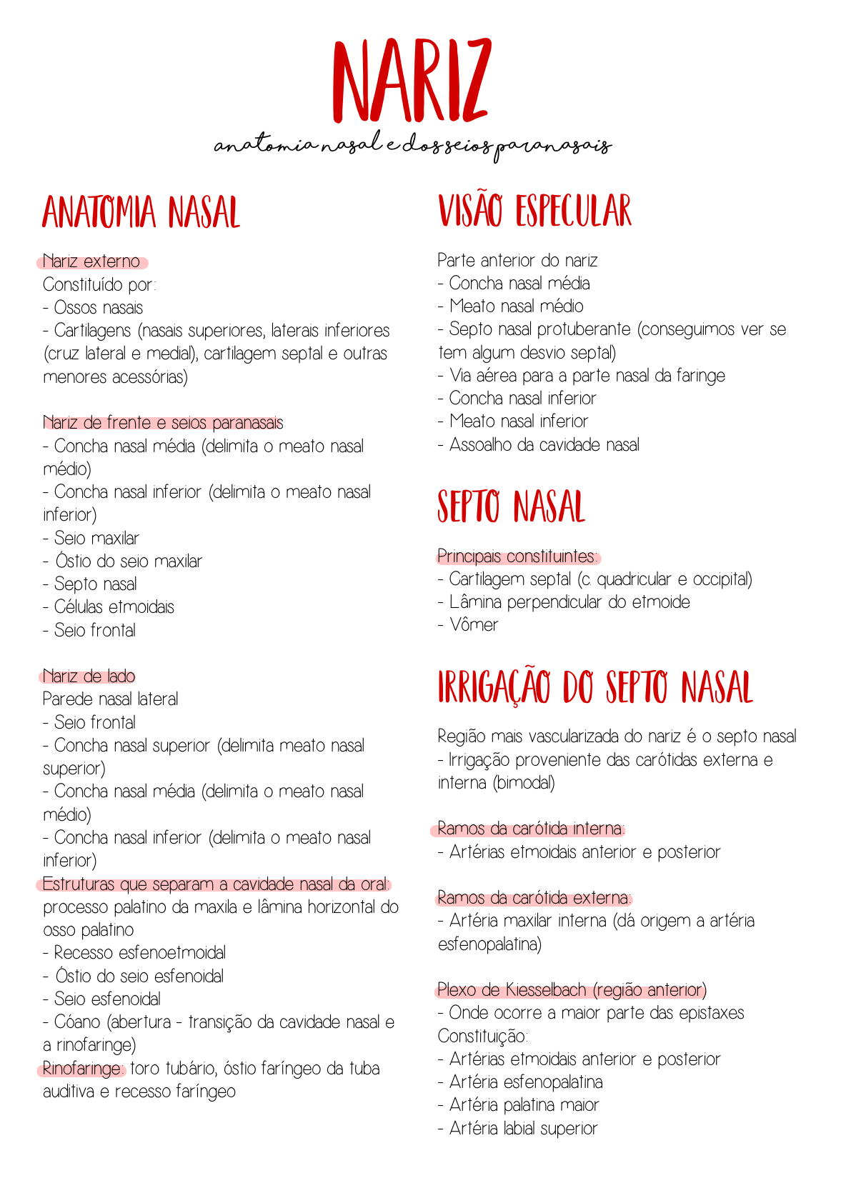 Nariz Anatomia nasal e dos seios paranasais Anatomia nasal Nariz externo Constituído por: - Ossos nasais - Cartilagens (nasais superiores, laterais inferiores (cruz lateral e medial), cartilagem septal e outras menores acessórias) Nariz de frente e seios paranasais - Concha nasal média (delimita o meato nasal médio) - Concha nasal inferior (delimita o meato nasal inferior) - Seio maxilar - Óstio do seio maxilar - Septo nasal - Células etmoidais - Seio frontal Nariz de lado Parede nasal lateral - Seio frontal - Concha nasal superior (delimita meato nasal superior) - Concha nasal média (delimita o meato nasal médio) - Concha nasal inferior (delimita o meato nasal inferior) Estruturas que separam a cavidade nasal da oral: processo palatino da maxila e lâmina horizontal do osso palatino - Recesso esfenoetmoidal - Óstio do seio esfenoidal - Seio esfenoidal - Cóano (abertura - transição da cavidade nasal e a rinofaringe) Rinofaringe: toro tubário, óstio faríngeo da tuba auditiva e recesso faríngeo Estruturas que separam a cavidade nasal da oral: processo palatino da maxila e lâmina horizontal do osso palatino - Recesso esfenoetmoidal - Óstio do seio esfenoidal - Seio esfenoidal - Cóano (abertura - transição da cavidade nasal e a rinofaringe) Rinofaringe: toro tubário, óstio faríngeo da tuba auditiva e recesso faríngeo Visão especular Parte anterior do nariz - Concha nasal média - Meato nasal médio - Septo nasal protuberante (conseguimos ver se tem algum desvio septal) - Via aérea para a parte nasal da faringe - Concha nasal inferior - Meato nasal inferior - Assoalho da cavidade nasal Septo nasal Principais constituintes: - Cartilagem septal (c. quadricular e occipital) - Lâmina perpendicular do etmoide - Vômer Irrigação do septo nasal Região mais vascularizada do nariz é o septo nasal - Irrigação proveniente das carótidas externa e interna (bimodal) Ramos da carótida interna: - Artérias etmoidais anterior e posterior Ramos da carótida externa: - Artéria maxilar interna (dá origem a artéria esfenopalatina) Plexo de Kiesselbach (região anterior) - Onde ocorre a maior parte das epistaxes Constituição: - Artérias etmoidais anterior e posterior - Artéria esfenopalatina - Artéria palatina maior - Artéria labial superior Artéria esfenopalatina Principal artéria que irriga a cavidade nasal - Ramo da artéria maxilar interna Ramos da esfenopalatina: - Artéria septal (parede medial) - Artéria nasal lateral posterior (parede lateral) Origem na fossa pteriogopalatina Inervação do nariz Pelo nervo maxilar (2º ramo do trigêmeo) Origem na fossa pteriogopalatina Seios paranasais 4 seios paranasais: - Seio esfenoidal (P) - Seio etmoidal (anterior e posterior) - Seio maxilar (A) - Seio frontal (A) Todos bilaterais Seio frontal - Inicia aos 4 anos (radiologicamente aos 6 anos) - Tamanho adulto até os 20 anos - Ausente em 10% das pessoas Seio maxilar - Inicia aos 3 meses de gestação - Crescimento nos 3 e 18 anos - Associação com desenvolvimento dentário Seio Etmoidal Constituído pelas células etmoidais - Início aos 5 meses de gestação - Tamanho adulto aos 12 a 15 anos 5 lamelas: - Processo uncinado - Bula etmoidal - Lamela nasal da concha média - Concha superior - Concha suprema Fazem parte do labirinto etmoidal Seio esfenoidal - Atinge o tamanho adulto entre 12 a 18 anos Estruturas próximas: - Hipófise - Nervo óptico - Artéria carótida interna - Nervo maxilar - Nervo vidiano Propedêutica - Ectoscopia - Inspeção - Rinoscopia - Endoscopia nasal - RX - Tomografia computadorizada Inspeção - Consegue ver a porção anterior Porção posterior (adenoides) só consegue ver com endoscopia nasal Rinoscopia - Avalia corneto inferior e corneto médio Vê corneto inferior, corneto médio e septo nasal (estruturas da parede lateral e medial) Parede medial: septo nasal Parede lateral: cornetos e meatos Meatos: importantes para saber curva aérea *Meato inferior e médio dão mais secreção nasal Meato médio: drena para os seios da face Hipertrofia dos cornetos nasais: obstrução do ar e congestão nasal Endoscopia nasal - Consegue ver a porção posterior do nariz Etmoide anterior Etmoide anterior RX - Principalmente para fraturas Ex: fratura de adenoide (trata com corticoide ou cirurgia) Tomografia computadorizada - Padrão ouro para rinossinusites - Só se vê seios da face com tomografia Menor que 5 anos não tem sinusite, tem etmoidite Epistaxes Anterior (+ comum) - 80% das vezes - Plexo de Kiesselbach (principalmente a esfenopalatina) - Bem sintomático Posterior - 20% das vezes - Plexo de Woodruff - Menos sintomático Ex: rinossinusites, trauma, AAS, AINES, plaquetopenia.... Imagens Nariz externo Nariz de frente e seios paranasais Nariz de lado Visão especular (cornetos) Seios paranasais Plexo de Kiesselbach