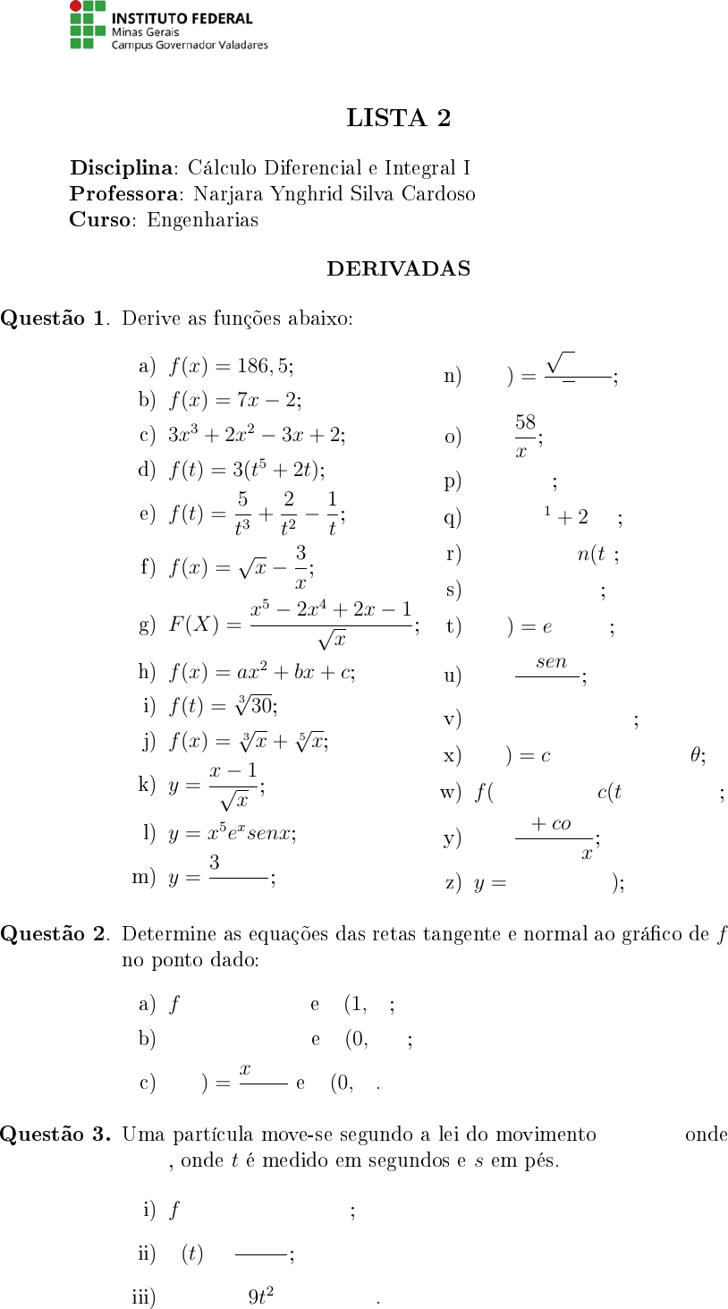 LISTA 2 Disciplina: Cálculo Diferencial e Integral I Professora: Narjara Ynghrid Silva Cardoso Curso: Engenharias DERIVADAS Questão 1. Derive as funções abaixo: a) f(x) = 186, 5; b) f(x) = 7x− 2; c) 3x3 + 2x2 − 3x+ 2; d) f(t) = 3(t5 + 2t); e) f(t) = 5 t3 + 2 t2 − 1 t ; f) f(x) = √ x− 3 x ; g) F (X) = x5 − 2x4 + 2x− 1√ x ; h) f(x) = ax2 + bx+ c; i) f(t) = 3 √ 30; j) f(x) = 3 √ x+ 5 √ x; k) y = x− 1√ x ; l) y = x5exsenx; m) y = 3x− 1 5− 2x ; n) f(x) = √ x− 1√ x+ 1 ; o) y = 58 x4 ; p) y = 2x+2; q) y = 3x+1 + 2x−1; r) f(t) = t3etln(t); s) y = log(100x); t) f(x) = exln(x); u) y = x2senx ex ; v) y = senx+ 10tgx; x) f(θ) = cossecθ + eθcotgθ; w) f(t) = 2cossec(t)− 2sec(t); y) y = 1 + cosx x+ secx ; z) y = sec(α)tg(α); Questão 2. Determine as equações das retas tangente e normal ao grá�co de f no ponto dado: a) f(x) = x3 + x2 e P (1, 2); b) f(x) = xex − 1 e P (0,−1); c) f(x) = x− 1 x+ 2 e P (0, 1). Questão 3. Uma partícula move-se segundo a lei do movimento s = f(t) onde t ≥ 0, onde t é medido em segundos e s em pés. i) f(t) = t2 − 10t+ 12; ii) f(t) = t t2 + 1 ; iii) s = t3 − 9t2 + 15t+ 10. a) Encontre a velocidade no instante t. b) Qual a velocidade após 3s? c) Quando a partícula está em repouso? Questão 4. Se um tanque mantém 5000 galões de água que escoa pelo fundo em 40min, então a lei de Torricelli dá o volume de água que restou no tanque depois de t min, como V = 5000 ( 1− t 40 )2 0 ≤ t ≤ 40. Encontre a taxa segundo a qual está escoando no tanque após 5min, 10min, 20min e 40min? Em que instante o �uxo é mais rápido? Mais vagaroso? Questão 5. Escreva cada função na forma f(g(x)) e use a regra da cadeia para obter as derivadas abaixo: a) y = sen(20x); b) y = tg(10x+ 5); c) y = √ 4 + 3x; d) y = e √ x; e) y = tg(senx); f) y = (x3 + 4x)7; g) y = 4 √ 1 + 2x+ x2; h) y = sec(πx); h) y = ln(cosx). Questão 6. Use a regra da cadeia para obter a derivada. a) f(x) = ecosx; b) f(x) = tg(senx); c) f(t) = e−3tcos(3t); d) y = 101−x 2 ; e) y = e2u eu + e−u ; f) f(θ) = cos2(θ); g) f(x) = sec4(x); h) y = tg3(5x); i) y = ln(sen(5x)); j) y = √ x+ √ x; k) y = ln(ln(lnx)); l) y == sen(sen(senx)); m) f(x) = √ x+ √ x+ √ x; n) f(t) = e3t sen2(5t) ; o) y = ln ( x− 1 x+ 2 ) ; p) f(x) = ln( 3 √ x5); q y = ln(secx+ tgx); r) y = e4xsen(5x) (5x− 1)3 . Questão 7. Determine a equação da reta que tangencia o grá�co de y = x2 e é paralela à reta de equação 4x− y + 2 = 0. Questão 8. Determine y ′ em cada caso sabendo que y = f(x) está implícita nas equações abaico. a) y3 + x2y = x+ 4; b) xy + y3 = x; c) y + ln(x2 + y2) = 4; d) tg(x− y) = y 1 + x2 ; e) 5y + cos(xy) = x y ; f) x2y + xy2 = 2x− 3y; Questão 9. Determine a equação da reta que tangencia a elipse de equação x2 + 2y2 = 3 no ponto (1, 1). Questão 10. Determine a derivada das funções abaixo: a) y = x arctgx; b) y = arcsen(x3); c) y = 5arctg(3x− 1); d) y = e3xarcsen(2x); e) y = arctg(e7x); f) y = sen(3x) arctg(4x) Questão 11. Determine as derivadas que se pede em cada item; a) y = x4 + 6x2 − 7x, d 3y dx3 e d5y dx5 ; b) y = cos(θ), d2y dθ2 e d3y dθ3 ; c) y = (1− 7t)5, d 3y dt3 e d2y dt2 ; b) y = √ x2 − 1, y′′ e y′′′ ; b) y = xe7x, y ′′ e y ′′′ ; b) f(t) = tcos(t), f ′′′ (0); b) g(x) = √ 5− 2x, g′′(2), g′′′(0). BONS ESTUDOS!!!