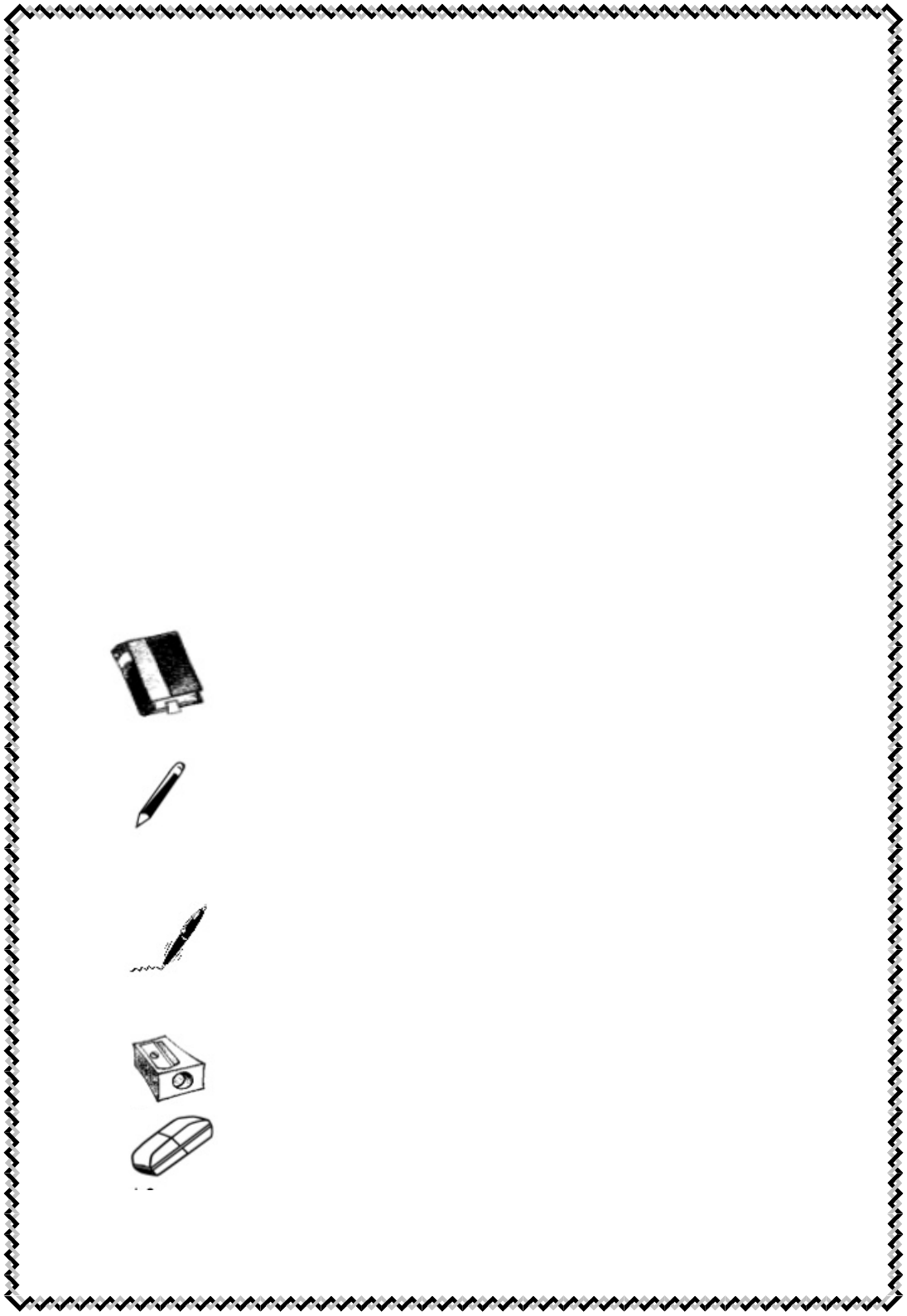 ATIVIDADE DE INGLÊS 1) Escreva a tradução de cada SCHOOL OBJECTS abaixo. a) Eraser b) Board c) Ruler d) Book e) Notebook f) Glue g) Pencil h) Pen i) School chair j) Board eraser k) Schoolbag l) Colored pencil 2) Complete com os nomes dos SCHOOL OBJECTS em Inglês. a) What is this? _ _______________________________________________________ b) What is this? _______________________________________________________ c) What is this? _______________________________________________________ d) What is this? _______________________________________________________ e) What is this? 3) Relacione a primeira coluna com a segunda. (A) BOOK (B) PEN (C) ERASER (D) SHARPENER (E) DESK (F) PENCIL (G) NOTEBOOK (H) RULER ( I ) SCHOOLBAG (J) BOARD ( ) mesa ( ) régua ( ) lápis ( ) livro ( ) mochila escolar ( ) borracha ( ) quadro ( ) caderno ( ) caneta ( ) apontador 4) Traduza as frases abaixo. a) This is my ruler. b) This is a book. c) This is a board. d) This is my notebook. e) This is my pencil. f) This is a pen. g) These are colored pencils. h) These are my books. i) These are my rulers. j) This is my School. k) This is my schoolbag.