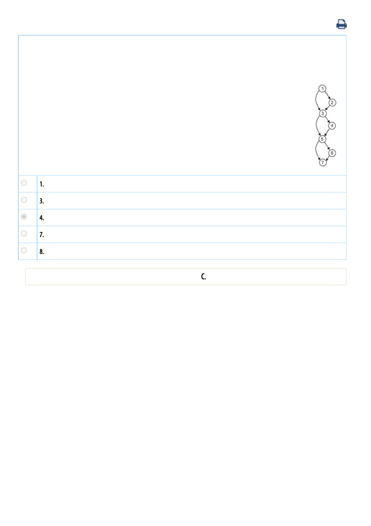 16/03/2021 Universidade Paulista - UNIP : Disciplina On-line. https://unip.br/aluno/central/sistemas/acesso/138 1/1 Ao longo de todo o desenvolvimento do software, devem ser aplicadas atividades de garantia de qualidade de software (GQS), entre as quais se encontra a atividade de teste. Um dos critérios de teste utilizados para gerar casos de teste é o denominado critério dos caminhos básicos, cujo número de caminhos pode ser determinado com base na complexidade ciclomática. Considerando-se o grafo de �uxo de controle apresentado na �gura ao lado, no qual os nós representam os blocos de comandos e as arestas representam a transferência de controle, qual a quantidade de caminhos básicos que devem ser testados no programa associado a esse grafo de �uxo de controle, sabendo-se que essa quantidade é igual à complexidade ciclomática mais um ? A 1. B 3. C 4. D 7. E 8. Você já respondeu e acertou esse exercício. A resposta correta é: C.