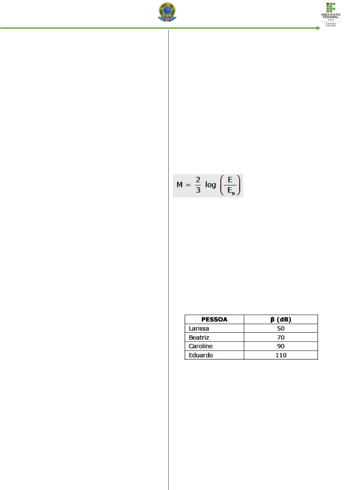 FÍSICA MINISTÉRIO DA EDUCAÇÃO Atividade de Física 2 – 4ºBim. Aluno(a): Turma: 1 - O caráter ondulatório do som pode ser utilizado para eliminação, total ou parcial, de ruídos indesejáveis. Para isso, microfones captam o ruído do ambiente e o enviam a um computador, programado para analisá-lo e para emitir uma onda que anule o ruído original inde- sejável. O fenômeno ondulatório no qual se fundamen- ta essa tecnologia é a: a) polarização b) interferência c) difração d) reflexão e) refração 2 - Quando um terremoto acontece em uma cidade, os prédios se sacodem verticalmente e horizontalmente por causa de movimentos do solo provocados pela propagação de ondas mecânicas, geradas por deslo- camentos súbitos de grande quantidade de massa na crosta terrestre (ondas sísmicas). Ondas sísmicas tam- bém sáo geradas pêlos cientistas que estudam sua propagação nas camadas geológicas. Neste caso, uma fonte para as ondas é uma carga de explosivos enter- rados na área em estudo. Outra onda mecânica impor- tante são as ondas sonoras que se propagam no ar e chegam aos nossos ouvidos. Analise as seguintes afirmativas: I Tanto no som que ouvimos quanto nos terremotos, as ondas propagam variações na pressão do meio em que se deslocam. II Se as ondas sísmicas e as sonoras fossem idênticas, os prédios só seriam sacudidos na vertical. III Só após o cientista ouvir a explosão de sua fonte é que os instrumentos registram a chegada da onda sís- mica. Está(ão) correta(s) apenas a(s) afirmativa(s): a) I b) I e III c) I, II e III d) II e) II e III 3 - O som audível apresenta frequências variando entre 20Hz e 20000Hz, sendo a velocidade do som no ar igual a 340m/s. Considerando-se a onda sonora, é correio afirmar que: a)quando eia passa de um meio para outro sua fre- quência se altera. b)quando ela passa de um meio para outro seu com- primento de onda permanece constante. c)a qualidade fisiológica que permite distinguir um som forte de um fraco é o timbre. d)a qualidade fisiológica que permite distinguir dois sons, de mesma altura, emitidos por fontes sonoras diferentes é a amplitude. e)o comprimento de onda do som de menor frequência, no ar, é igual a 17m. 4 - O processo de envelhecimento do ser humano pro- voca diversas modificações no organismo. No aparelho auditivo, algumas células não se renovam e vão ficando cada vez mais danificadas, tornando difícil ouvir sons agudos. Mundo Estranho, n° 51, set./2009, p. 36, (com adapta- ções). Com base nessas informações, nesse estágio da vida, o ser humano percebe melhor os sons de: a) maior comprimento de onda. b) menor intensidade. c) maior frequência. d) menor amplitude. e) maior altura. 5 - A magnitude M de um terremoto é medida pela es- cala Richter, criada pelo sismólogo americano Charles Francis Richter, em 1935. Nessa escala, a magnitude do terremoto pode ser determinada por meio da ex- pressão, em que E é a energia liberada no terremoto em kWh e Eo = 7,0 x 10 –3 kWh. Se a energia produzida por um terremoto de magnitude 6 pudesse ser armazenada, o número de anos que essa energia poderia abastecer uma residência que tenha consumo anual de 3500 kWh é: a) 500 b) 1000 c) 1500 d) 2000 e) 2500 6 - O quadro abaixo apresenta valores mínimos para o nível de intensidade sonora, β, que pode ser ouvido por cada uma das quatro pessoas que têm problemas de surdez. Um alto-falante que produz ondas sonoras de intensi- dade igual a 10 –4 W/m 2 é posicionado a uma mesma distância das quatro pessoas. Sendo I0 = 10 –12 W/m 2 o limiar de audibilidade, isto é, a menor intensidade sono- ra que o ouvido humano pode perceber. Nesse sentido, é correto afirmar que: a) Larissa e Beatriz não conseguirão ouvir o som pro- veniente do alto-falante. b) Larissa conseguirá ouvir o som proveniente do alto- falante, mas Caroline não. c) Beatriz e Caroline conseguirão ouvir o som proveni- ente do alto-falante. d) Beatriz não conseguirá ouvir o som proveniente do alto-falante, mas Eduardo sim. e) Caroline e Eduardo conseguirão ouvir o som prove- niente do alto-falante. FÍSICA MINISTÉRIO DA EDUCAÇÃO 7- (Puc-rio) Um aparelho eletrônico emite uma onda eletromagnética de frequência f = 900 MHz. A veloci- dade da onda é a mesma da luz, ou seja, c=3,0×10 8 m/s. O comprimento de onda vale: a) 140 mm b) 33 cm c) 140 cm d) 33 m e) 140 m 8 - (Fatec) Certa onda de rádio, de frequência 1,5.10 6 Hz, propaga-se no ar com velocidade 3,0.10 8 m/s. O seu comprimento de onda, em metros, é a) 2,0 × 10 2 b) 1,5 × 10 2 c) 9,0 × 10 d) 5,0 × 10 e) 2,0 × 10 9 - (Fuvest) Considerando o fenômeno de ressonância, o ouvido humano deveria ser mais sensível a ondas sonoras com comprimentos de onda cerca de quatro vezes o comprimento do canal auditivo externo, que mede, em média, 2,5cm. Segundo esse modelo, no ar, onde a velocidade de propagação do som é 340m/s, o ouvido humano seria mais sensível a sons com fre- quências em torno de a) 34 Hz b) 1320 Hz c) 1700 Hz d) 3400Hz e) 6800 Hz 10 - (Puc-rio) As ondas, num certo lago, elevam uma canoa duas vezes por segundo. O comprimento de onda é de 4m. Quanto vale a velocidade destas ondas em m/s? a) 1/4 b) 1/2 c) 2 d) 4 e) 8 11 - (Puccamp) O menor comprimento de onda das vibrações emitidas por um morcego é de 3,3mm. A velocidade dessas ondas no ar é de 330m/s. A fre- quência correspondente é, em Hz, a) 1,0.10 2 b) 1,0.10 3 c) 1,0.10 4 d) 1,0.10 5 e) 1,0.10 6 12 - (Puccamp) A cor do mar e do céu é azul porque o ar atmosférico difunde principalmente a componente azul da luz solar. O comprimento de onda de certa cor azul é 4,5 . 10 -7 m e ela se propaga no ar com veloci- dade de 3,0 . 10 8 m/s. A frequência dessa radiação é, em hertz, a) 6,7 . 10 14 b) 3,3 . 10 14 c) 1,5 . 10 14 d) 7,5 . 10 13 e) 2,3 . 10 13 13 - (Pucmg) Em Belo Horizonte há três emissoras de rádio, que estão listadas a seguir, juntamente com as frequências de suas ondas por