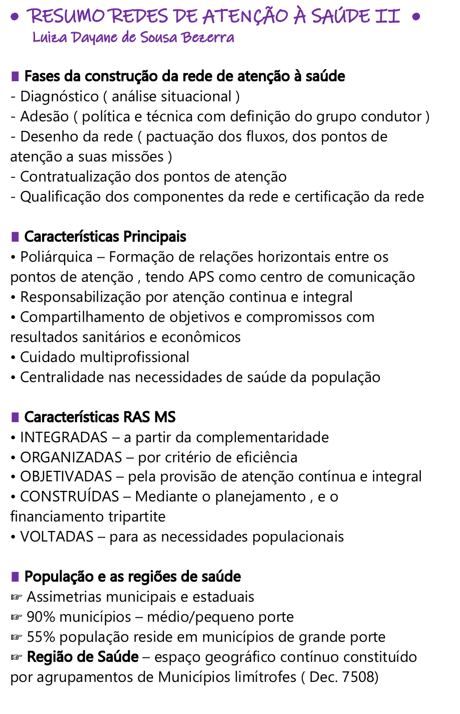• RESUMO REDES DE ATENÇÃO À SAÚDE II • Luiza Dayane de Sousa Bezerra ∎ Fases da construção da rede de atenção à saúde - Diagnóstico ( análise situacional ) - Adesão ( política e técnica com definição do grupo condutor ) - Desenho da rede ( pactuação dos fluxos, dos pontos de atenção a suas missões ) - Contratualização dos pontos de atenção - Qualificação dos componentes da rede e certificação da rede ∎ Características Principais • Poliárquica – Formação de relações horizontais entre os pontos de atenção , tendo APS como centro de comunicação • Responsabilização por atenção continua e integral • Compartilhamento de objetivos e compromissos com resultados sanitários e econômicos • Cuidado multiprofissional • Centralidade nas necessidades de saúde da população ∎ Características RAS MS • INTEGRADAS – a partir da complementaridade • ORGANIZADAS – por critério de eficiência • OBJETIVADAS – pela provisão de atenção contínua e integral • CONSTRUÍDAS – Mediante o planejamento , e o financiamento tripartite • VOLTADAS – para as necessidades populacionais ∎ População e as regiões de saúde ☞ Assimetrias municipais e estaduais ☞ 90% municípios – médio/pequeno porte ☞ 55% população reside em municípios de grande porte ☞ Região de Saúde – espaço geográfico contínuo constituído por agrupamentos de Municípios limítrofes ( Dec. 7508) ∎ ATENÇÃO PRIMÁRIA À SAÚDE SF- Território de Adscrição – Equipe Multiprofissional Integralidade Primeiro Contato Longitudinalidade. Coordenação Orientação Familiar Orientação comunitária Competência Cultural • FUNÇÕES ESSENCIAIS: Resolubulidade – Comunicação – Responsabilização ∎ ATENÇÃO SECUNDÁRIA – Média complexidade - Especialistas cumprem um papel de interconsultor e suporte a APS - A combinação de sistemas logísticos ( cartão ID, prontuário eletrônico , sistema de regulação e transporte ) é o que garante a integração ∎ ATENÇÃO TERCIÁRIA – Alta Complexidade - Devem ser alocados de acordo com a necessidade de micro e macrorregiões - Devem cumprir a função de responder às condições agudas ou aos momentos de agudização das condições crônicas, conforme o estabelecimento em diretrizes clínicas baseadas em evidências - SISTEMAS LOGÍSTICOS Os sistemas logísticos são soluções em saúde, fortemente ancoradas nas tecnologias de informação, e ligadas ao conceito de integração vertical. Consiste na efetivação de um sistema eficaz de referência e contra referência de pessoas e de trocas eficientes de produtos e de informações ao longo dos pontos de atenção à saúde e dos sistemas de apoio nas redes de atenção à saúde. - Sistemas Logísticos e de Apoio Os sistemas logísticos e de apoio necessariamente devem ser transversais a todas as redes temáticas e níveis de atenção. - Sua articulação é fundamental para proporcionar atenção integral à população dentro de padrões razoáveis de custo/efetividade. ∎ Sistema de Governança A governança é definida pela Organização das Nações Unidas como o exercício da autoridade política, econômica e administrativa para gerir os negócios do Estado. Constitui-se de complexos mecanismos , processos , relações e instituições através das quais os cidadãos e os grupos sociais articulam seus interesses , exercem seus direitos e obrigações e mediam suas diferenças. ∎ O problema crítico do sistema de atenção à saúde no sus A incoerência entre uma situação de saúde que combina transição demográfica acelerada e tripla carga de doença , com forte predominância de condições crônica, e um sistema fragmentado de saúde que opera de forma episódica e reativa é que é voltado principalmente para a atenção às condições agudas e ás agudizações de condições crônicas ∎ Modelo lógico de atenção O modelo de atenção. O modelo de atenção um às condições agudas às condições crônicas - Agenda pautada nas necessidades da população - Deve ser discutida com a comunidade - A ordem de chegada não deve ser o principal critério para o atendimento dos casos , mas a sua gravidade s - O acolhimento a todos , não devendo limitar-se ao recebimento da demanda espontânea para a identificação de risco ou definição de urgências ∎ Ferramentas de micro-gestão dos serviços As Redes de Atenção organizam-se a partir de um processo de gestão da clínica associado ao uso de critérios de eficiência microeconômica na aplicação de recursos , mediante planejamento , gestão e financiamento intergovernamentais Cooperativos(..) - É preciso ampliar objeto de trabalho da clínica para além das doenças visando compreender os problemas de saúde ,ou seja , entender as situações que ampliam o risco ou a vulnerabilidade das pessoas ∎ GESTÃO DA CLÍNICA - A gestão da clínica aqui compreendida implica “ a aplicação de tecnologias de micro-gestão dos serviços de saúde com a finalidade de : a) assegurar padrões clínicos ótimos ; b) aumentar a eficiência ; c) diminuir os riscos para os usuários e para os profissionais ; d) prestar serviços efetivos e, e) melhorar a qualidade da atenção à saúde . ∎ REDES TEMÁTICAS NO SUS - As redes de atenção à saúde – RAS • Rede Cegonha – Garantia do acolhimento com classificação de risco , ampliação do acesso e melhoria da qualidade do PRÉ- NATAL - Garantia de vinculação da gestante à unidade de referência e ao transporte seguro - Garantia das boas práticas e segurança na atenção ao parto e nascimento - Garantia da atenção à saúde das crianças de 0 a 24 meses com qualidade e resolutividade - Garantia da ampliação do acesso ao planejamento reprodutivo • Rede de atenção psicossocial • Rede de atenção às urgências e emergências – Promoção e prevenção: academia saúde ; motos ; violência 