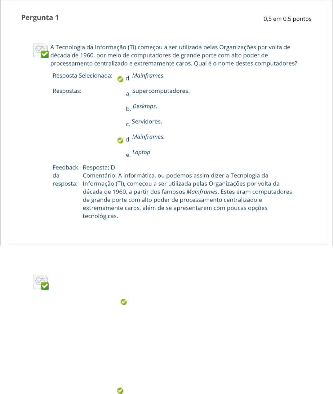 Pergunta 2 0,5 em 0,5 pontos A ferramenta do Google que apresenta por meio de grá cos e ltros a frequência em que determinados termos e palavras são procurados no buscador é conhecida como: Resposta Selecionada: e. Google Trends. Respostas: a. Google Docs. b. Google Forms. c. Google Drive. d. Google Topics. e. Google Trends. Feedback Resposta: E da Comentário: O Google Trends apresenta por meio de grá cos e ltros a resposta: frequência em que determinados termos e palavras são procurados no buscador. Pergunta 3 0,5 em 0,5 pontos A infraestrutura de TI é todo o aparato que suporta o funcionamento dos sistemas computacionais, considerada a base da construção de toda a Tecnologia da Informação. O conjunto de componentes que proporciona a conectividade de dados, voz e imagem entre as pessoas, por meio de uma transmissão eletrônica de sinais integram o item: Resposta Selecionada: d. Telecomunicações. Respostas: a. Hardware. b. Software. c. Banco de Dados. d. Telecomunicações. e. Pessoas. Feedback Resposta: D da Comentário: O último componente da infraestrutura de TI, mas não menos resposta: importante, são as redes de computadores e as telecomunicações. Elas consistem no conjunto de componentes que proporciona a conectividade de dados, voz e imagem entre as pessoas, por meio de uma transmissão eletrônica de sinais. Pergunta 4 0,5 em 0,5 pontos Analise as proposições a seguir sobre a evolução da Tecnologia e da Tecnologia da Informação: I - A evolução tecnológica vivenciada pela humanidade foi muito grande e ela coincide com osurgimento do primeiro computador com caraterísticas modernas. II - Próximo ao século XIX veri ca-se já o surgimento de tecnologias de comunicação, taiscomo o telégrafo e o telefone, além do uso acelerado da energia elétrica e da própria lâmpada. III - No século XX, impulsionada pela primeira e segunda grande guerra mundial, percebe-segrande evolução das tecnologias, principalmente das tecnologias de informação com características ainda rústicas. É correto o que se a rma em: Resposta Selecionada: b. II e III, apenas. Respostas: a. I e II, apenas. b. II e III, apenas. c. I e III, apenas. d. I, apenas. e. II, apenas. Feedback Resposta: B da Comentário: É importante destacar que a evolução tecnológica vivenciada pela resposta: humanidade foi muito grande, antes mesmo de existir o primeiro computador com caraterísticas modernas. Por exemplo, as tecnologias de navegação e de guerra tão presentes na idade média, bem como as técnicas de construção civil e transporte, as evoluções na medicina, na logística de forma geral, dentre outros. Pergunta 5 0,5 em 0,5 pontos Analise as proposições a seguir sobre uso dos buscadores: I – Os buscadores são fundamentais na navegação na Internet. É por meio dele queencontramos os conteúdos que desejamos. II – É possível, por meio do Google, encontrar preços de produtos utilizando a opçãoshopping nas buscas. III – Infelizmente não há uma plataforma de busca de trabalhos acadêmicos no Google,sendo necessário recorrer à busca geral. É correto o que se a rma em: Resposta Selecionada: a. I e II, apenas. Respostas: a. I e II, apenas. b. II e III, apenas. c. I e III, apenas. d. I, apenas. e. II, apenas. Feedback Resposta: A da Comentário: Outra opção interessante, principalmente para trabalhos resposta: acadêmicos, é a utilização do Google Acadêmico. Neste é possível pesquisar trabalhos acadêmicos, artigos cientí cos, monogra as, dissertações, dentre outros. Podemos inclusive utilizar ltros para melhorar as nossas pesquisas por ano, por relevância e por idioma. Pergunta 6 0,5 em 0,5 pontos Analise as proposições a seguir: I – Um funcionário de uma empresa utilizou uma planilha eletrônica para criar uma tabelacom dados relativos a custos. II – Um aluno efetuou a con guração do seu sistema operacional para corrigir uma falha noseu HD. III – Um Instrutor de um treinamento utilizou o PowerPoint para fazer a apresentação docurso para os funcionários de uma empresa. É possível a rmar que foi utilizado um software de aplicação em: Resposta Selecionada: c. I e III, apenas. Respostas: a. I e II, apenas. b. II e III, apenas. c. I e III, apenas. d. I, apenas. e. II, apenas. Feedback Resposta: C da Comentário: Os softwares de sistemas comandam o hardware, gerenciando e resposta: coordenando as suas funcionalidades, fazendo a interface entre as aplicações ( software de aplicação) e todo o aparato de hardware. O melhor exemplo de software de sistemas são os sistemas operacionais. Os softwares de aplicação interagem com os softwares de sistemas para utilizar os recursos de hardware necessários à sua operação e assim exercer as suas funcionalidades. Pergunta 7 0,5 em 0,5 pontos Na evolução do uso da Tecnologia da Informação para a gestão das Organizações vivenciouse as eras dos dados, da informação e do conhecimento. Isto por si só já revela a diferença nos conceitos relacionados a estes três elementos. Assim é possível a rmar que: Resposta Selecionada: a. O conhecimento origina-se a partir de informações. Respostas: a. O conhecimento origina-se a partir de informações. b. O conhecimento é qualquer elemento na sua forma bruta. c. O conhecimento é um conjunto de dados organizados. d. A informação é qualquer elemento na sua forma bruta. e. A informação só gera novos dados. Feedback Resposta: A da Comentário: O Dado é algo bruto, que por si só nada revela. A informação é um resposta: conjunto de dados organizados que geram valor. O conhecimento é a compreensão e consciência do valor das informações. Pergunta 8 0,5 em 0,5 pontos O computador, diferente de nós, só compreende a base de numeração binário. Nós somos educados a ter a compreensão de tudo ao nosso redor com a base decimal. O computador não. Ele só entende bits e bytes. Podemos a rmar sobre bits e bytes que: Resposta Selecionad