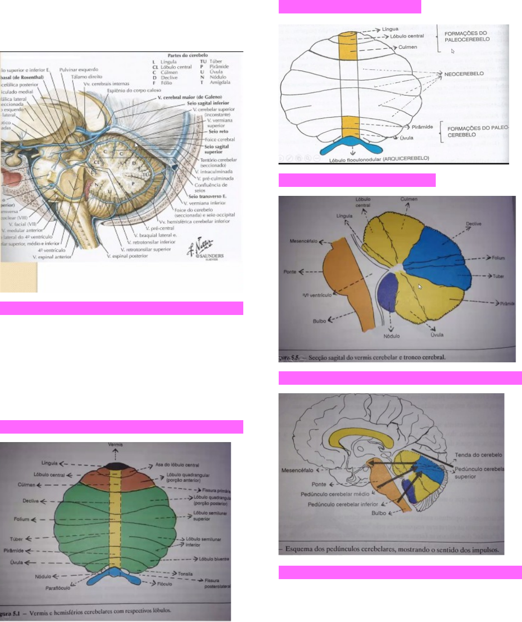 Exame físico neurológico Anatomia: formação de supra segmentar; substância cinzenta e branca; fossa posterior; tenda do cerebelo; região inextensível Funções do cerebelo Coordenação dos movimentos Detecta e corrige erros de movimento · Os erros são computados pelo córtex cerebelar antes que a ordem motora atinja o motoneurônio Vermis e Hemisférios cerebelares Centro – tronco; Lateral – membros; Ponta – equilíbrio Subdivisão proposta por Larsell Secção sagital do Vermis cerebelar Pedúnculos cerebelares Divisão longitudinal do cerebelo Região Mediana: núcleo fastigial Região intermediária: núcleos emboliforme e globoso, também denominados núcleo interpósito Região lateral: núcleo denteado Somatotopia do cerebelo Dois homúnculos no corpo do cerebelo: lobo anterior e lobo posterior Áreas corticais cerebelares visuais e auditivas Homúnculo paleocerebelar e neocerebelar Mediano – torácico, abdome Lateral – apendicular, membros Papel do Cerebelo Recebe informações a serem computadas e em sequência atua sobre atividades motoras em geral Informações recebidas: Via vestibulocerebelar: informações sobre a posição da cabeça – equilíbrio dinâmico e estático Via espinocerebelar: situação muscular dos membros e troncos Via corticopontocerebelar: mensagens de programação motora do córtex primário Respostas do cérebro: Medula: manutenção do tônus postural · Tracto vestibuloespinal: ativadora de motoneuronios da musculatura extensora do tronco · Tracto rubroespinal: músculos flexores dos membros · Tracto reticulospinais anterior e lateral: inibem mm. Flexores e facilitam motoneuronios alfa e gama em geral · Tracto piramidal e outras vias: fibras lentas Córtex motor primário: programação motora – fibras rápidas; coordenação dos movimentos Lobo Floculonodular Arquicerebelo Cerebelo vestibular Lesões no nódulo: · Distúrbio do equilíbrio (fibras para os núcleos vestibulares) · Nistagmo (alteração do fascículo longitudinal medial que estabelece conexões com núcleos de nervos oculomotores) Lobo anterior e Vermis posterior Paleocerebelo “Cerebelo espinal” Postura axial e dos membros Influências nos nervos cranianos responsáveis pela articulação da Lobo posterior Neocerebelo Controle dos movimentos voluntários Controle dos motoneuronios gama estáticos (hipotonia) Exame neurológico – coordenação motora Hemisférios cerebelares; vermis cerebelar; gânglios da base Hemisférios cerebelares Coordenação de movimentos finos, fala, direção e intensidade de forças Controle ipsilateral Teste dedo-nariz · Dismetria Teste tornozelo-joelho-tíbia Estalar de dedos Movimentos alternados rápidos · Disdiadococinesia Rechaço Vermis cerebelar Estabilidade postural Ortostase e marcha · Base alargada · Ataxia · Fala escandida · Tremor cefálico Fisiopatologia Desordens da coordenação: Ataxias Ataxia apendicular: incoordenação motora nos membros principalmente no membro superior – lesão da zona lateral do córtex cerebelar Ataxia axial: distúrbios do equilíbrio, mesmo sentado há instabilidade motora – lesões medianas (vermiana/nodulares) Ataxia cerebelar Dissinergia ou assinergia muscular · Decomposição de movimentos (prova index-nariz e calcanhar joelho) · Didiadococinesia: dificuldade ou impossibilidade de realização de movimentos alternativos rapidamente · Dismetrias: erros de medida de movimentos (hipermetrias e hipometrias) Tremor Tremor quando o paciente realiza um movimento voluntario geralmente ocorre por lesão do núcleo denteado · Prova index-index Distasia e disbasia Dificuldade para manter-se de pé · Alargamento base Marcha é realizada com dificuldade · Marcha ebriosa Disartria Alterações da articulação da palavra; ocorre devido falta de coordenação dos músculos responsáveis pela fala; fala pastosa com separação pronunciada das silabas Nistagmo Falta de coordenação dos músculos extrínsecos do globo ocular, encarregados da movimentação dos olhos