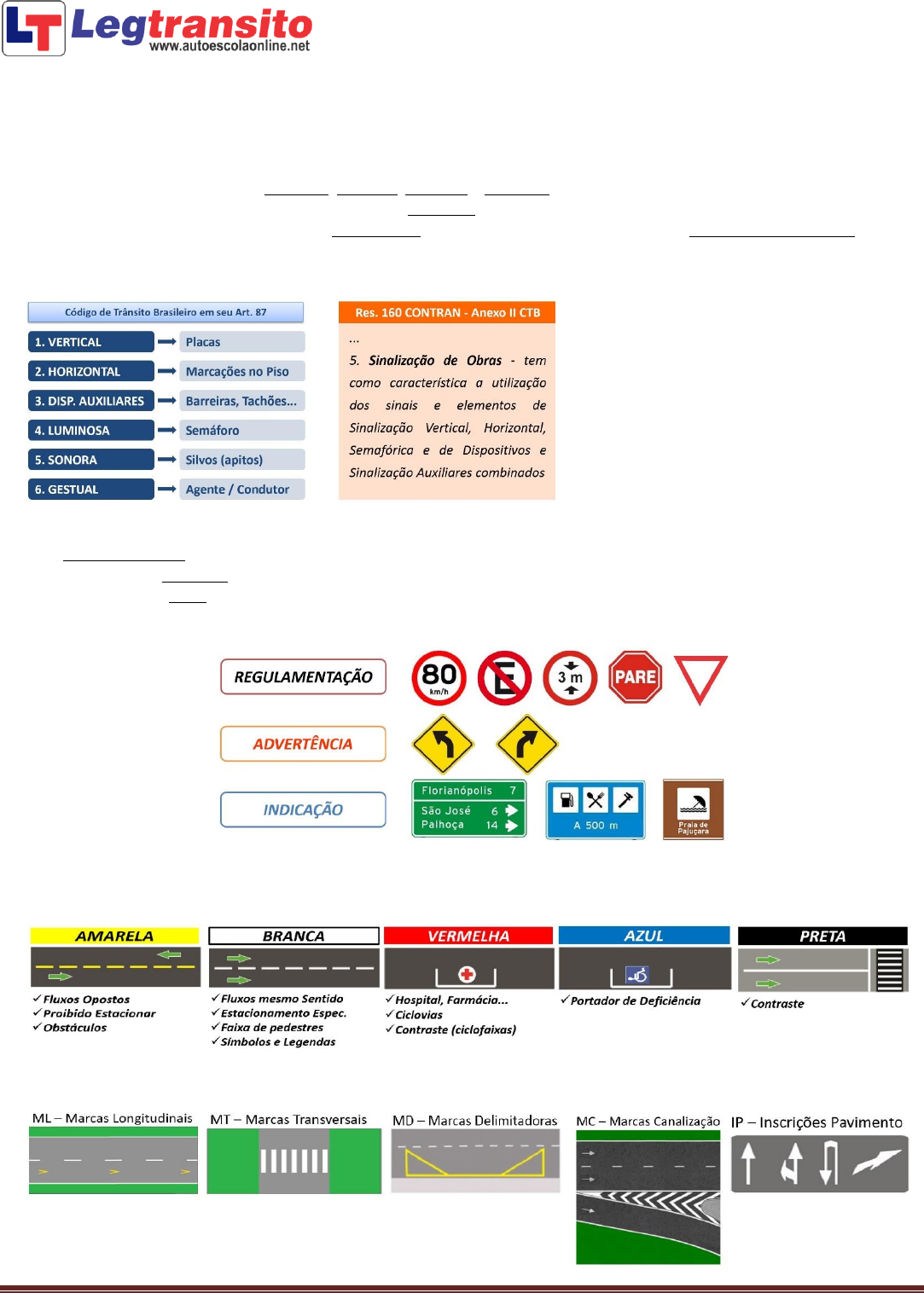 Prof. Ronaldo Cardoso / LegTransito@gmail.com / www.autoescolaonline.net / www.YouTube.com/LegTransito 1 SINALIZAÇÃO de TRÂNSITO 1. DISPOSIÇÕES PRELIMINARES a. Todo cidadão tem o deve de conhecer, proteger, respeitar e obedecer a sinalização de trânsito; b. NÃO é atribuído ao cidadão o direito ou dever de implantar sinalização de trânsito; c. A sinalização nas vias pertencentes a condomínios, nas vias e áreas de estacionamento privado de uso coletivo é de seu proprietário. 2. TIPOS DE SINALIZAÇÃO – A sinalização de trânsito poderá ser feita nas formas relacionadas a seguir: 3. ORDEM DE PREVALÊNCIA (Hierarquia) 1. As ordens do agente de trânsito prevalecem sobre as Normas de Circulação e outros Sinais; 2. As indicações do semáforo prevalecem sobre os demais sinais; 3. As indicações dos sinais prevalecem sobre as demais normas de trânsito. 4. SINALIZAÇÃO VERTICAL 5. SINALIZAÇÃO HORIZONTAL a. Cores e representações; b. Tipos de marcações; Prof. Ronaldo Cardoso / LegTransito@gmail.com / www.autoescolaonline.net / www.YouTube.com/LegTransito 2 c. Linhas Divisórias. 6. DISPOSITIVOS AUXILIARES a. DD - Dispositivos Delimitadores b. DSA – Dispositivos de Sinalização de Alerta c. DL – Dispositivos Luminosos d. DT – Dispositivos de Uso Temporário Prof. Ronaldo Cardoso / LegTransito@gmail.com / www.autoescolaonline.net / www.YouTube.com/LegTransito 3 7. SINALIZAÇÃO SEMAFÓRICA a. Semafórica de ADVERTÊNCIA b. Semafórica de REGULAMENTAÇÃO 8. SINALIAÇÃO GESTUAL a. GC - Gestos do CONDUTOR b. GA – Gestos do AGENTE 9. SINALIZAÇÃO SONORA Prof. Ronaldo Cardoso / LegTransito@gmail.com / www.autoescolaonline.net / www.YouTube.com/LegTransito 4 PLACAS DE REGULAMENTAÇAO Prof. Ronaldo Cardoso / LegTransito@gmail.com / www.autoescolaonline.net / www.YouTube.com/LegTransito 5 Prof. Ronaldo Cardoso / LegTransito@gmail.com / www.autoescolaonline.net / www.YouTube.com/LegTransito 6 PLACAS DE ADVERTÊNCIA Prof. Ronaldo Cardoso / LegTransito@gmail.com / www.autoescolaonline.net / www.YouTube.com/LegTransito 7 Prof. Ronaldo Cardoso / LegTransito@gmail.com / www.autoescolaonline.net / www.YouTube.com/LegTransito 8 Prof. Ronaldo Cardoso / LegTransito@gmail.com / www.autoescolaonline.net / www.YouTube.com/LegTransito 9 PLACAS DE INDICAÇAO – SERVIÇOS AUXILIARES Prof. Ronaldo Cardoso / LegTransito@gmail.com / www.autoescolaonline.net / www.YouTube.com/LegTransito 10 PLACAS DE INDICAÇAO – ATRATIVOS TURÍSTICOS