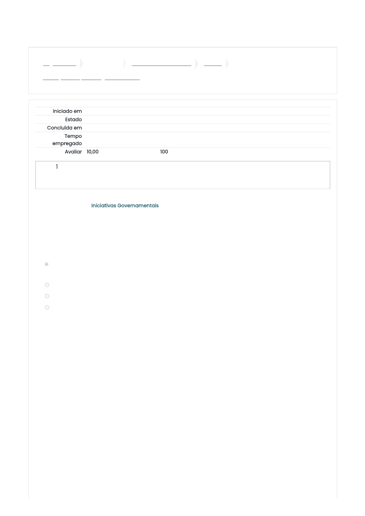 28/03/2021 Avaliação da aprendizagem na Trilha 5: Revisão da tentativa https://ava2.ufms.br/mod/quiz/review.php?attempt=9742&cmid=1912 1/4 Página inicial Meus cursos CFIREA_EXT_T02_2021_1 Trilha 5 Avaliação da aprendizagem na Trilha 5 Iniciado em Sunday, 28 Mar 2021, 12:45 Estado Finalizada Concluída em Sunday, 28 Mar 2021, 13:09 Tempo empregado 24 minutos 8 segundos Avaliar 10,00 de um máximo de 10,00(100%) Questão 1 Correto Atingiu 2,00 de 2,00 Conforme o tópico “Iniciativas Governamentais”, aprendemos que algumas entidades federativas têm elaborado políticas de acesso e licenciamento aberto a recursos educacionais. Com isso, a CAPES (Coordenação de Aperfeiçoamento de Pessoal de Nível Superior) lançou em 2016, um portal de recursos educacionais abertos para uso de estudantes e professores da educação básica, superior e pós-graduação que estão buscando aprimorar seus conhecimentos. O portal compila o material didático dos cursos do sistema UAB (Universidade Aberta do Brasil) e pode ser acessado por cidadãos de todas as regiões do Brasil. De qual tipo de iniciativa governamental esse tópico está tratando? A. Educapes Resposta correta B. BIOE C. REliA D. MECRED Sua resposta está correta. A resposta correta é: Educapes. https://ava2.ufms.br/ https://ava2.ufms.br/course/view.php?id=40 https://ava2.ufms.br/course/view.php?id=40#section-6 https://ava2.ufms.br/mod/quiz/view.php?id=1912 28/03/2021 Avaliação da aprendizagem na Trilha 5: Revisão da tentativa https://ava2.ufms.br/mod/quiz/review.php?attempt=9742&cmid=1912 2/4 Questão 2 Correto Atingiu 2,00 de 2,00 Questão 3 Correto Atingiu 2,00 de 2,00 Leia o texto e marque a alternativa correta: A respeito do tópico “Iniciativas Internacionais do Ensino Superior”, aprendemos que um dos principais atores institucionais no Ensino Superior em relação aos Open Textbooks ou livros abertos, é uma organização sem fins lucrativos baseada na Rice University. O primeiro livro aberto foi publicado no ano de 2012 e, atualmente, já foram publicados 39 livros nas áreas de exatas, ciências e humanidades. Possui uma tecnologia adaptativa que visa melhorar os resultados de aprendizagem através da personalização e está sendo testada em cursos universitários de todo os Estados Unidos. Estamos diante de qual tecnologia educacional? A. Bookboon B. Wikiversidade C. OpenStax Resposta correta D. Biblioteca de cursos aberta Sua resposta está correta. A resposta correta é: OpenStax. Referente ao tópico “Mapa Global de REA”, aprendemos que há uma coleta de dados sobre o crescente número de atores e atividades no campo da educação aberta em todo o mundo. O principal objetivo é acelerar a evolução do ecossistema de REA global, fornecendo uma visão abrangente e responsável do movimento REA. As informações fornecidas podem ser usadas para uma ampla gama de propósitos, incluindo: conectar os distintos atores entre si, facilitando a cooperação e o compartilhamento de recursos e conhecimentos; fornecer listas qualificadas de repositórios e outros serviços de REA para ajudar professores e alunos a encontrarem recursos educacionais relevantes; apoiar legisladores na tomada de decisões estratégicas, fornecendo estatísticas significativas e visões gerais do movimento de educação aberta e seus impactos. A respeito dessa afirmativa, julgue a opção como verdadeira (V) ou falsa (F): Escolha uma opção: Verdadeiro Falso Resposta correta A resposta correta é 'Verdadeiro'. https://ava.ufms.br/mod/page/view.php?id=97045&forceview=1 28/03/2021 Avaliação da aprendizagem na Trilha 5: Revisão da tentativa https://ava2.ufms.br/mod/quiz/review.php?attempt=9742&cmid=1912 3/4 Questão 4 Correto Atingiu 2,00 de 2,00 Questão 5 Correto Atingiu 2,00 de 2,00 Arraste e solte a palavra correta que completa o texto abaixo: No tópico “Como identificar e encontrar Recursos Educacionais Abertos?”, aprendemos que, apesar de a disponibilidade de REA estar em constante expansão, não é tarefa fácil procurar e identificar REA na Internet. Para muitas pessoas, o meio mais fácil de encontrar recursos na Internet é utilizar um site de busca, como os conhecidos Google e Bing. É por isso que as licenças do Creative Commons (CC) que vêm acompanhadas do (a) símbolo ND (não a obras derivadas) , apesar de permitirem algumas liberdades, não são consideradas REA, pois não permitem a adaptação/revisão/remix/tradução, um pilar primordial da cultura do conhecimento colaborativo e compartilhado. Além das licenças CC, as licenças de Domínio Público e Copyleft também permitem as liberdades mínimas, enquanto todo e qualquer conteúdo que venha acompanhado do símbolo do Copyright © necessita que tenha autorização expressa do autor ou detentor dos direitos patrimoniais para serem usados. escasso uso, adaptação e compartilhamento não liberação de usar, adaptar e distribuir direito de uso Sua resposta está correta. A resposta correta é: Arraste e solte a palavra correta que completa o texto abaixo: No tópico “Como identificar e encontrar Recursos Educacionais Abertos?”, aprendemos que, apesar de a disponibilidade de REA estar em constante expansão, não é tarefa fácil procurar e identificar REA na Internet. Para muitas pessoas, o meio mais fácil de encontrar recursos na Internet é utilizar um site de busca, como os conhecidos Google e Bing. É por isso que as licenças do Creative Commons (CC) que vêm acompanhadas do (a) [símbolo ND (não a obras derivadas)], apesar de permitirem algumas liberdades, não são consideradas REA, pois não permitem a adaptação/revisão/remix/tradução, um pilar primordial da cultura do conhecimento colaborativo e compartilhado. Além das licenças CC, as licenças de Domínio Público e Copyleft também permitem as liberdades mínimas, enquanto todo e qualquer conteúdo que venha acompanhado do símbolo do Copyright © necessita que tenha autorização expr