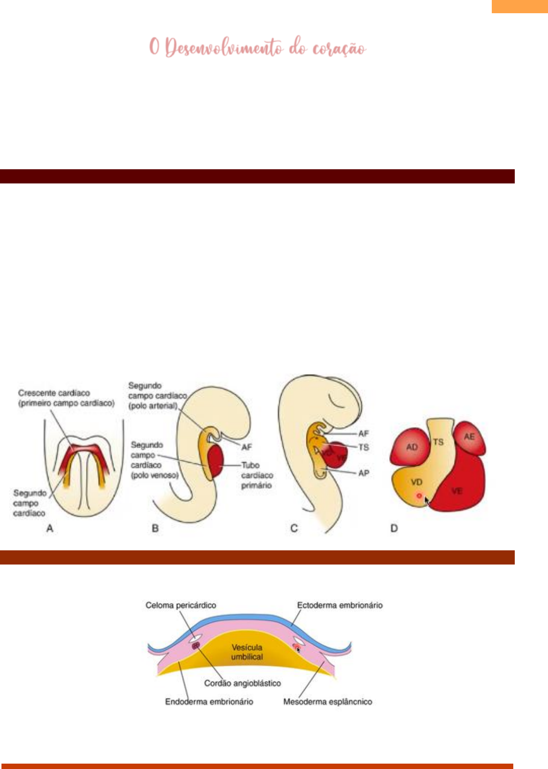 MIRIÃ ORTEGA . 1 BBPM III EMBRIOLOGIA O Desenvolvimento do coração -O coração começa a se desenvolver na metade da ª semana → é o primeiro órgão que começa a funcionar → isso porque o corpo do embrião cresce e as necessidades de oxigênio e nutrição também aumenta, logo, precisa de um sistema de bombeamento para isso -21ª dia já se inicia os batimentos cardíacos 24ª 25 → bombeamento de sangue -Coração bombeia o sangue durante os eventos de morfogênese A LINHAGEM CARDÍACA -O coração tem origem a partir do mesodérmica cardiogênica e também ectodérmica → algumas células da crista neural são envolvidas na morfogênese, por isso também é de origem ectodérmica 1. 1º CAMPO CARDÍACO -Mesoderma cardiogênico (espâncnico) oriundo do processo de gastrulação) -Forma uma estrutura semelhante a letra “U” -Forma os átrios e o VE (maior parte do coração 2. 2º CAMPO CARDÍACO -Células progenitoras cardíacas mesodérmicas oriundas da região da faringe -Ficam bem abaixo do 1º campo cardíaco FORMAÇÃO DOS TUBOS ENDOCÁRDICOS -As células do primeiro campo formam os cordões angioblásticos, precursores dos tubos endocárdicos -inicialmente o cordão é maciço → as células começam a se modificarem até que o interior comece a formar uma luz → assim forma-se o tubo endocárdico responsável pela vasculogênese MIRIÃ ORTEGA . 2 BBPM III EMBRIOLOGIA → Dobramentos corporais: assim que é formado esse tubo, ele fica acima da cabeça e ele é reposicionado de acordo com os dobramentos cefálico (prega cefálica) FORMAÇÃO DO TUBO CARDÍACO ÚNICO DOBRAS LATERAIS: os dois tubos laterais se fundem e formam um tubo único → dai passam a se chamar de tubo cardíaco único -4ª semana de desenvolvimento MIRIÃ ORTEGA . 3 BBPM III EMBRIOLOGIA -coração logo após a formação do tubo cardíaco único • Seio venoso: é a extremidade caudal: influxo (onde o sangue chega) -Corno direito e esquerdo: onde as veias cardinais comuns drenam Participam da formação de parte do átrio e seio coronário • Átrio primitivo: cranial ao seio venoso-Forma os átrios direito e esquerdo -canal atrioventricular • Ventrículo primitivo : VE -Prega bulboventricular • Bulbo cardíaco : maior parte do VD • Trato de saída -Contínuo com o saco aórtico Transporte de sangue para cabeça e tronco -Porção proximal: cone arterial – incorporado aos ventrículos -Porção distal: tronco arterial → da origem a aorta ascendente e tronco cardíaco MIRIÃ ORTEGA . 4 BBPM III EMBRIOLOGIA • Até agora, esse coração está preso no mesocardio dorsal → posteriormente acontece uma apoptose no meio, ficando preso apenas nas extremidades -Esse orifício que é formado pela apoptose é chamado de seio transverso do pericárdio → isso é importante para que possa fazer a movimentação necessária para o posicionamento correto do coração DOBRAMENTO DO CORAÇÃO • A SEPTAÇÃO OCORRE POR ÚTIMO PORQUE O CORAÇÃO DOBRA? Pois ao final, o posicionamento está correto e forneceuma base para separação da circulação pulmonar e sistêmica ao nascimento -Esses dobramentos ocorrem até a 7ª semana DESENVOLVIMENTO DO ÁTRIO DIREITO MIRIÃ ORTEGA . 5 BBPM III EMBRIOLOGIA -o Corno esquerdo involui e forma o seio coronário -o corno direito forma parte do AD → região chamada se sinus venarum isso explica as duplas texturas do AD A parte lisa é do corno direito e a irregular é do átrio primitivo ÁTRIO ESQUERDO - também tem essa diferença de paredes: pois parte é formado pelo átrio primitivo e pela incorporação das veias pulmonares MIRIÃ ORTEGA . 6 BBPM III EMBRIOLOGIA -Em roxo: região que foi originado pelo corno direito do seio venoso → sinus venaro • Acredita-se que a crista terminal da origem ao nó sinotrial SEPTAÇÃO DO CORAÇÃO – MORFOGÊNESE VALVULOSSEPTAL - as paredes se desenvolve por meio de coxins endocárdios → região atrioventricular e trato de saída MIRIÃ ORTEGA . 7 BBPM III EMBRIOLOGIA SEPTO ATRIOVENTRICULAR (AV) • Final da 4ª semana • Necessária para a separação das circulações sistêmica e pulmonar • Também ajuda na formação de outros séptos • Primeiro forma-se dois coxins endocárdicos (dorsal e ventral) ao redor da periferia do canal atrioventricular • Depois ocorre a fusão dos coxins endocárdicos → dai se da a formação do septo atrioventricular (AV) -Divisão do canal AV em canais atrioventriculares direito e esquerdo -SEPARAÇÃO PARCIAL DO ATRIO PRIMITIVO E VENTRÍCULO PRIMITIVO -lateralmente há comunicação de todas as câmaras MIRIÃ ORTEGA . 8 BBPM III EMBRIOLOGIA SEPTO INTERATRIAL -Importante para separar átrios e também para circulação sistêmica e pulmonar • Formam dois septos sucessivos → se fundem -São septos musculares • Shunting (comunicação) direito → esquerda durante a gestação -Vai levar o nome de forame oval e posteriormente fossa oval 1. SEPTO PRIMUM / SEPTO PRIMÁRIO -Projeção miocárdica em forma de crescente → cresce em direção ao septo AV (coxim endocárdico) -Formaão do foramen primum/ ostium primum → buraco de comunicação enquanto não há a fusão completa) MIRIÃ ORTEGA . 9 BBPM III EMBRIOLOGIA → Septum primum, uma membrana muscular delgada, cresce em direção aos septo atrioventricular a partir do teto do átrio dividindo-o em átrio direito e esquerdo • A medida que o foramen primum é obliterada (pela fusão), ocorre a apoptose na poprção dorsal deste septo, formando o FORAMEN SECUNDUM O septum secundum é muscular e mais espesso que o septum primum. Cresce em direção ao seto AV, mas não se funde com este→ FORAME OVAL MIRIÃ ORTEGA . 10 BBPM III EMBRIOLOGIA • Foramen secundum e forame oval garantem a passagem de sangue oxigenado do AD → AE • Porção caudal do septum primum (aderida ao septo AV) forma a VALVA DO FORAME OVAL -Importância do septum sedundum ser mais espesso → para o sangue não voltar • Shunting direi