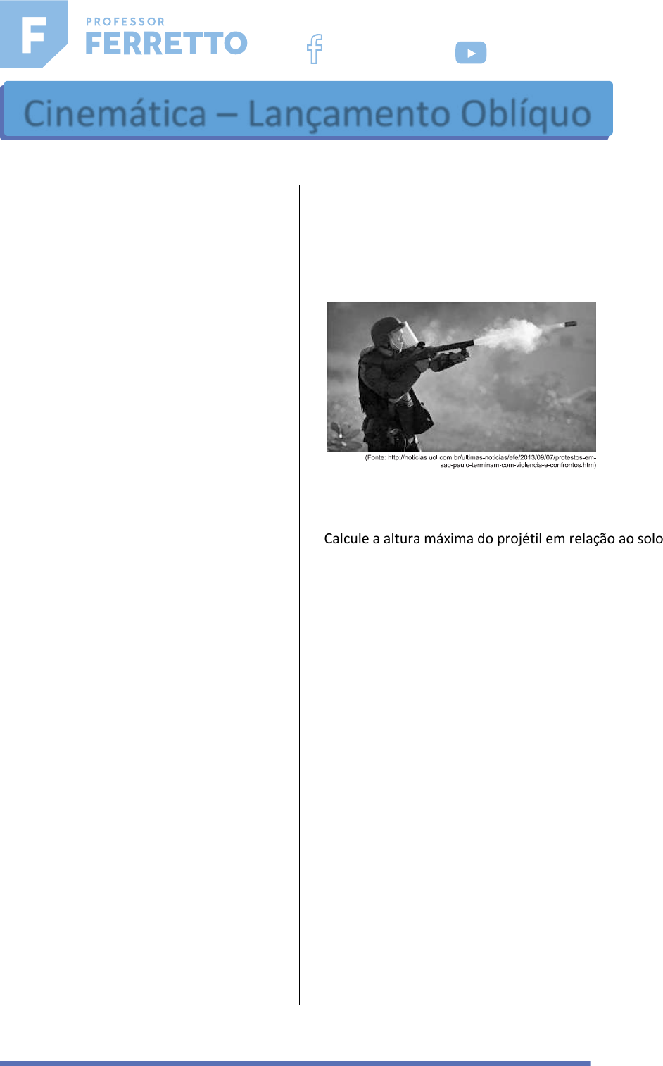 1 F0051 - (Mackenzie) Um zagueiro chuta uma bola na direção do atacante de seu time, descrevendo uma trajetória parabólica. Desprezando-se a resistência do ar, um torcedor afirmou que I. a aceleração da bola é constante no decorrer de todo movimento. II. a velocidade da bola na direção horizontal é constante no decorrer de todo movimento. III. a velocidade escalar da bola no ponto de altura máxima é nula. Assinale a) se somente a afirmação I estiver correta. b) se somente as afirmações I e III estiverem corretas. c) se somente as afirmações II e III estiverem corretas. d) se as afirmações I, II e III estiverem corretas. e) se somente as afirmações I e II estiverem corretas. F0052 - (Enem) Na Antiguidade, algumas pessoas acreditavam que, no lançamento obliquo de um objeto, a resultante das forças que atuavam sobre ele tinha o mesmo sentido da velocidade em todos os instantes do movimento. Isso não está de acordo com as interpretações científicas atualmente utilizadas para explicar esse fenômeno. Desprezando a resistência do ar, qual é a direção e o sentido do vetor força resultante que atua sobre o objeto no ponto mais alto da trajetória? a) Indefinido, pois ele é nulo, assim como a velocidade vertical nesse ponto. b) Vertical para baixo, pois somente o peso está presente durante o movimento. c) Horizontal no sentido do movimento, pois devido à inércia o objeto mantém seu movimento. d) Inclinado na direção do lançamento, pois a força inicial que atua sobre o objeto é constante. e) Inclinado para baixo e no sentido do movimento, pois aponta para o ponto onde o objeto cairá. F0053 - (Unifor) A figura a seguir mostra uma das cenas vistas durante a Copa das Confederações no Brasil. Os policiais militares responderam às ações dos manifestantes com bombas de gás lacrimogêneo e balas de borracha em uma região totalmente plana onde era possível avistar a todos. Suponha que o projétil disparado pela arma do PM tenha uma velocidade inicial de 200,00 m/s ao sair da arma e sob um ângulo de 30,00º com a horizontal. Calcule a altura máxima do projétil em relação ao solo, sabendo-se que ao deixar o cano da arma o projétil estava a 1,70 m do solo. Despreze as forças dissipativas e adote g = 10,00 m/s2. a) 401,70 m b) 501,70 m c) 601,70 m d) 701,70 m e) 801,70 m F0054 - (Pucrj) Um projétil é lançado com uma velocidade escalar inicial de 20 m/s com uma inclinação de 30° com a horizontal, estando inicialmente a uma altura de 5,0 m em relação ao solo. A altura máxima que o projétil atinge, em relação ao solo, medida em metros, é: Considere a aceleração da gravidade g = 10 m/s2 a) 5,0 b) 10 c) 15 d) 20 e) 25 www.professorferretto.com.br ProfessorFerretto ProfessorFerretto Cinemática – Lançamento Oblíquo Norma Realce Norma Nota 2 F0055 - (Unesp) O gol que Pelé não fez Na copa de 1970, na partida entre Brasil e Tchecoslováquia, Pelé pega a bola um pouco antes do meio de campo, vê o goleiro tcheco adiantado, e arrisca um chute que entrou para a história do futebol brasileiro. No início do lance, a bola parte do solo com velocidade de 108 km/h (30 m/s), e três segundos depois toca novamente o solo atrás da linha de fundo, depois de descrever uma parábola no ar e passar rente à trave, para alívio do assustado goleiro. Na figura vemos uma simulação do chute de Pelé. Considerando que o vetor velocidade inicial da bola após o chute de Pelé fazia um ângulo de 30° com a horizontal (sen30° = 0,50 e cos30° = 0,85) e desconsiderando a resistência do ar e a rotação da bola, pode-se afirmar que a distância horizontal entre o ponto de onde a bola partiu do solo depois do chute e o ponto onde ela tocou o solo atrás da linha de fundo era, em metros, um valor mais próximo de a) 52,0. b) 64,5. c) 76,5. d) 80,4. e) 86,6. F0681 - (Puccamp) Um objeto foi lançado obliquamente a partir de uma superfície plana e horizontal de modo que o valor da componente vertical de sua velocidade inicial era v0y = 30 m/s e o da componente horizontal era v0x = 8,0 m/s. Considerando a aceleração gravitacional igual a 10 m/s2 e desprezando a resistência do ar, o alcance horizontal do objeto foi a) 12 m. b) 24 m. c) 48 m. d) 78 m. e) 240 m. F0682 - (Mackenzie) Um míssil AX100 é lançado obliquamente, com velocidade de 800 m/s, formando um ângulo de 30,0˚ com a direção horizontal. No mesmo instante, de um ponto situado a 12,0 km do ponto de lançamento do míssil, no mesmo plano horizontal, é lançado um projétil caça míssil, verticalmente para cima, com o objetivo de interceptar o míssil AX100. A velocidade inicial de lançamento do projétil caça míssil, para ocorrer a interceptação desejada, é de a) 960 m/s b) 480 m/s c) 400 m/s d) 500 m/s e) 900 m/s F0683 - (Fatec) Em um jogo de futebol, o goleiro, para aproveitar um contra-ataque, arremessa a bola no sentido do campo adversário. Ela percorre, então, uma trajetória parabólica, conforme representado na figura, em 4 segundos. Desprezando a resistência do ar e com base nas informações apresentadas, podemos concluir que os módulos da velocidade V!!⃗ , de lançamento, e da velocidade V!!⃗ H, na altura máxima, são, em metros por segundos, iguais a, respectivamente, Dados: sen𝛽 = 0,8; cos𝛽 = 0,6. a) 15 e 25. b) 15 e 50. c) 25 e 15. d) 25 e 25. e) 25 e 50. Norma Nota Norma Nota Norma Nota VY=Vop Norma Nota V= VELOCIDADE INICIAL V0 VH= VELOCIDADE X (Vx) 3 F0684 - (Pucpr) Durante a preparação do país para receber a copa do mundo de 2014 e os jogos olímpicos de 2016, muitas construções foram demolidas para que outras fossem construídas em seu lugar. Um dos métodos utilizados nessas demolições é a implosão. Em 2011, a prefeitura do Rio de Janeiro, por exemplo, implodiu uma antiga fábrica para ampliar o Sambódromo. Na ocasião, para evitar que qualquer pessoa fosse atingida por detritos provenientes diretamente da explosão, os engenheiros respons