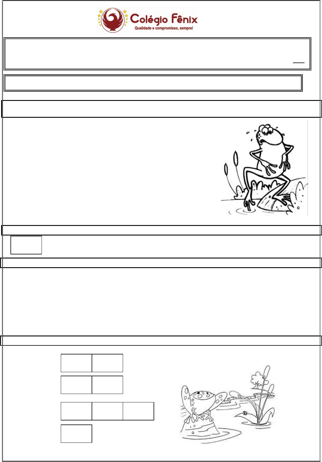 ALUNO(A): ___________________________________________________________________________________________ SÉRIE: 1º ANO - TURMA:______ TURNO:________PROFESSORA: ________ _______________DATA: _____/_____/2021 ATIVIDADE DE LÍNGUA PORTUGUESA I TRIMESTRE QUESTÃO 1 - ACOMPANHE A LEITURA DO TEXTO ABAIXO COM A AJUDA DA PROFESSORA . PINTE DE VERDE TODAS AS PALAVRAS SAPO NO TEXTO . O SAPO O SAPO NÃO LAVA O PÉ. NÃO LAVA PORQUE NÃO QUER, ELE MORA LÁ NA LAGOA, NÃO LAVA O PÉ PORQUE NÃO QUER. QUESTÃO 2 – QUANTAS PALAVRAS "SAPO" VOCÊ PINTOU NO TEXTO? PALAVRAS QUESTÃO 3 –DE ACORDO COM O TEXTO ESPONDA: a) O SAPO NÃO LAVA O PÉ O PORQUE? ( ) NÃO GOSTA. ( ) NÃO QUER. ( ) NÃO TEM ÁGUA. b) ONDE O SAPO MORA? _______________________________________________ QUESTÃO 4 –ESCREVA CADA SÍLABA EM UM QUADRINHO. SAPO LAVA LAGOA PÉ QUESTÃO 5 –COMPLETE COM AS LETRAS QUE FALTAM. QUESTÃO 6 –ESCREVA DO SEU JEITO, O NOME DAS FIGURAS ABAIXO. S A P S A A P O