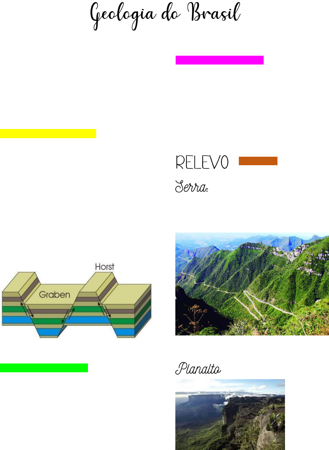 ⪧ No litoral brasileiro há presença de dobramentos antigos, com escudos cristalinos. Ex: Serra da Matiqueira, Serra do Mar, Mares de Morros... DOBRAMENTO DE ROCHAS: - Quando as rochas se dobram podem ocasionar o surgimento de falhas, possibilitando a epirogênese, que é o movimento vertical das rochas. Horst: Soerguimento da rocha. Ex: Serra da Matiqueira e do Mar. Graben: Rebaixamento da rocha. Ex: Vale do Paraíba. ESCUDOS CRISTALINOS: - Ou crátons, ou maciços antigos. - Formado por rochas ígneas e metamórficas - Formado na era pré-cambriana - Com recursos minerais metálicos, sendo depósito de minério então. BACIAS SEDIMENTARES: - Forma carvão e petróleo. - Rochas sedimentares - Formadas na Cenozoica, Paleozoica e Mesozoica. - Conjunto de formas variadas (Dobramentos, escarpas, cuestas. - Relevos elevados e residuais pois resistem a erosão. - Menos elevada - Formada por sedimentação recente que supera os processos erosivos. - Formação no período quaternário. - No litoral nordestino - Estrutura relativamente plana e de característica sedimentar. - Prevalece erosão marinha. - Borda abrupta do planalto - Vem de movimentos tectônicos que forma falhas ou é modelada por agentes erosivos. - Formação sedimentar - Planalto com escarpas - Superfície aplainada e rebaixada em relação as áreas adjacentes. - Predomina a erosão (O que o diferencia das planícies) - Em geral, constituem-se por bacias sedimentares. Relativa: Acima do nível do mar. No BRA. Absoluta: Abaixo do nível do mar. - Assimétrico com uma borda escarpatada e outra parte com declive mais suave. - Erosão diferencial - Pequena elevação com declive suave. Mais especifico: - Em climas áridos e semiáridos; No nordeste brasileiro - Área aplainada ao redor de uma estrutura que resistiu a erosão. - Transição entre áreas menos elevadas para áreas mais elevadas.