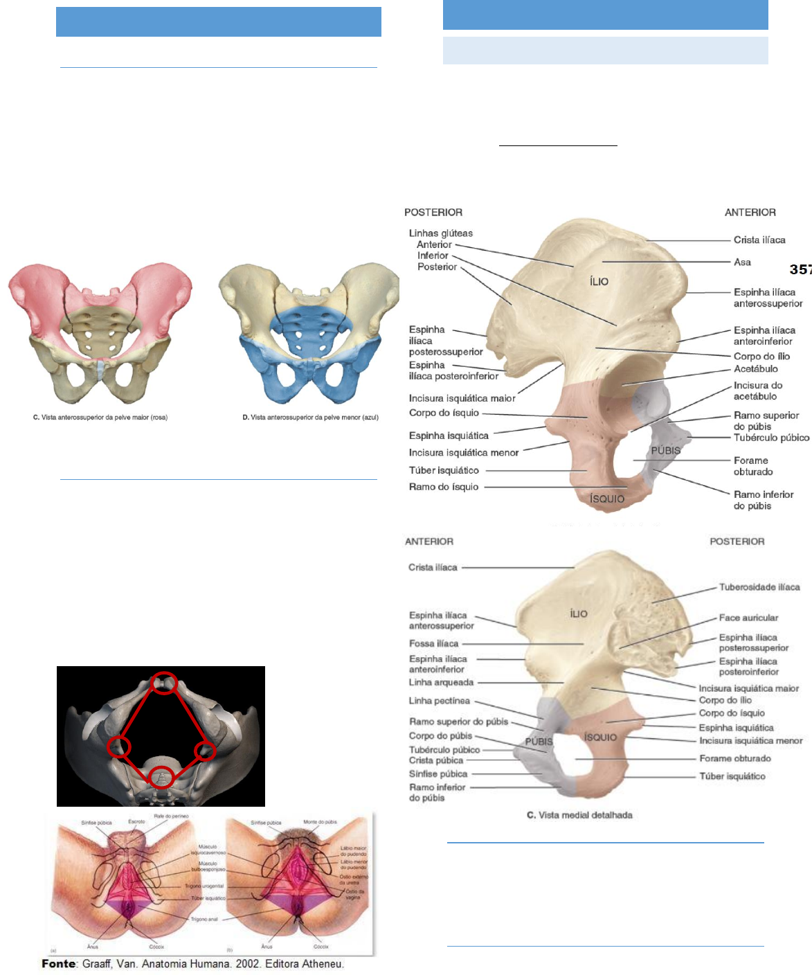 PELVE E PERÍNEO INTRODUÇÃO PELVE Área de transição entre o esqueleto axial e o esqueleto apendicular ou entre o tronco e os membros inferiores; Subdivisão: a) Pelve maior/ falsa: parte superior do cíngulo do membro inferior, local onde ocupa vísceras abdominais inferiores; b) Pelve menor/ verdadeira: parte inferior do cíngulo do membro inferior; São separadas pela linha terminal; PERÍNEO Ele contém os órgãos genitais externos e o ânus; Limitado anteriormente pela sínfise púbica, lateralmente pelas tuberosidades isquiática e posteriormente pelo cóccix; Divisões: a) Região/ trígono urogenital: contém os órgãos genitais externos; b) Região/ trígono anal: região posterior que contém o ânus; PARTE ÓSSEA DA PELVE O CÍNGULO DO MEMBRO INFERIOR (QUADRIL) Une o esqueleto axial (vértebras) com o esqueleto apendicular (fêmur); Composição: a) Dois ossos do quadril – direito e esquerdo; O osso do quadril representa a fusão de 3 ossos: ílio (parte superior), istmo (parte posterointerior) e púbis (parte anteroposterior); ÍLIO Maior dos 3 ossos do quadril; Composto por assa superior e corpo inferior; Integra o acetábulo; ÍSQUIO Osso posteroinferior do quadril; Composto por corpo superior e ramo inferior; Face glútea a Ramo funde-se ao púbis; Delimita o forame obturado – passagem de nervos e vasos sanguíneos; Integra o acetábulo; PÚBIS Osso anteroinferior do quadril; Composto por um ramo superior, inferior e um corpo entre os ramos; Delimita o forame obturado; Sínfise púbica – ponto de articulação entre os dois quadris; Integra o acetábulo; b) Sacro Fusão de cinco (em média) vértebras sacrais; FUNÇÃO Sustentação de peso – esqueleto axial esqueleto apendicular; Fixação de músculos; Proteção, sustentação e contenção das vísceras e estruturas abdominais; DIFERENÇA ENTRE A PELVE MASCULINA E FEMININA Feminina adaptação a gestação e o parto Leve e delgada; Pelve maior mais rasa; Linha terminal ampla e mais ovalada; Acetábulo pequeno e anteriormente; Forame obturado ovalado; Arco púbico maior que 90°; Crista ilíaca mais encurvada; Ílio menos vertical; Cóccix mais móvel e curvado; Abertura inferior da pelve mais larga; Masculina Pesada e espessa; Pelve maior profunda; Linha terminal estreita e em forma de coração; Acetábulo grande e lateral; Forame obturado redondo; Arco púbico menor que 90°; Crista ilíaca mais encurvada; Ílio mais vertical; Cóccix menos móvel e de baixa curvatura; Sacro mais lardo e mais estreito; Abertura inferior da pelve mais estreita; ARTICULAÇÃO DO QUADRIL 1. Anteriormente – sínfise púbica; 2. Posteriormente – Sacroilíaca; 3. Posteroinferior – cápsula articular (Quadril fêmur); Cápsula articular; Ligamento iliofemoral; Ligamento pubofemoral; Ligamento isquiofemoral; Ligamento da cabeça do fêmur; Lábio do acetábulo; Ligamento transverso do acetábulo; CAVIDADE PÉLVICA Cavidade abdominopélvica – limite superior é a caixa torácica e o limite inferior é a própria extensão vertical da pelve; A cavidade pélvica – parte inferoposterior da cavidade abdominopélvica - contém as partes terminais dos ureteres, bexiga urinária, reto, órgãos genitais pélvicos, vasos sanguíneos, linfáticos e nervos; Limites: 1. Inferiormente - diafragma da pelve musculofascial; 2. Posteriormente - cóccix e a parte inferior do sacro, e a parte superior do sacro forma um teto sobre a metade posterior da cavidade; 3. Anteroinferior – Corpos púbicos e a sínfise púbica; Eixo da pelve - linha curva (girando em torno da sínfise púbica) no plano mediano definida pelo ponto central da cavidade pélvica a cada nível; O PAREDES E ASSOALHO DA CAVIDADE PÉLVICA Uma parede anteroinferior, duas paredes laterais, uma parede posterior e um assoalho; PAREDE ANTEROINFERIOR Formada pelos corpos e ramos dos púbis e pela sínfise púbica; Sustentação do peso da bexiga urinária; PAREDES LATERAIS DA PELVE Formadas pelos ossos do quadril direito e esquerdo; Cada lado possui um forame obturado fechado por uma membrana obturadora; PAREDE POSTERIOR (PAREDE POSTEROLATERAL E TETO) Formada por uma parede e um teto ósseos na linha mediana (formados pelo sacro e cóccix) Paredes posterolaterais: formadas pelos ligamentos associados às articulações sacroilíacas e músculos piriformes; ASSOALHO PÉLVICO Formado pelo diafragma da pelve (músculos) – músculos isquiococcígeo e levantador do ânus e nas fáscias que recobrem as faces superior e inferior desses músculos; Diafragma da pelve separando a cavidade pélvica do períneo, ao qual serve como teto; MÚSCULOS DO ASSOALHO PÉLVICO 1. Músculos inquiococcígeos originam-se nas faces laterais da parte inferior do sacro e cóccix, suas fibras carnosas situam-se sobre a face profunda do ligamento sacroespinal e se fixam a ela; 2. Músculos levantadores do ânus maior parte e mais representativa do assoalho pélvico; Compõe esse músculo: a) Músculo Puborretal ou pubovisceral – liga o púbis ao reto; Ajuda na manutenção da continência fecal e na defecação; b) Músculo Pubococcígeo – liga o púbis ao cóccix; Sustentação e manutenção da posição das vísceras pélvicas; resistência ao aumento da pressão intra-abdominal durante expiração forçada, tosse, vômito, micção e defecação; constrição do ânus, uretra e vagina; c) Músculo Iliococcígeo – liga o ílio ao cóccix; ação é basicamente a mesma do pubococcígeo; 3. Músculo Isquiococcígeo – liga o istmo ao cóccix; Sustentação e manutenção da posição das vísceras pélvicas; resistência ao aumento da pressão intra- abdominal durante a expiração forçada, tosse, vômito, micção e defecação; tração anterior do cóccix após a defecção e o parto; 4. Músculo Bulboesponjoso - Ajuda a expelir a urina durante a micção, ajuda a impulsionar o sêmen ao longo da uretra; ajuda na ereção do pênis nos homens, constrição do óstio da vagina e ajuda na ere