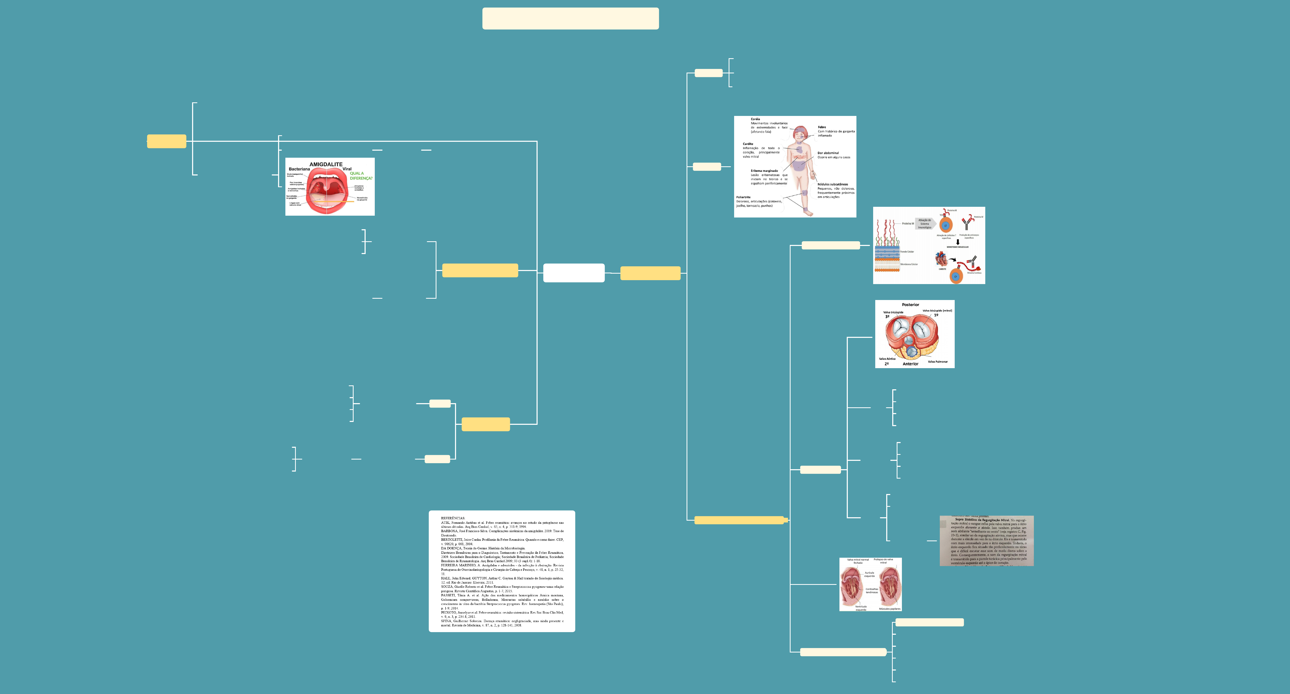 AMIGDALITE CONCEITO INFLAMAÇÃO DAS AMÍGDALAS INFECÇÃO VIRAL OU BACTERIANA VIRAL: ADENOVIRUS BACTERIANA: STREPTOCOCUS PYOGENES GRAM POSITIVO Adere a mucosa faríngea através de pili FEBRE REUMÁTICA CONCEITO Complicação não supurativa da faringoamigdalite Causada pelo streptococus beta-hemolítico do grupo A (Streptococus pyogenes) Resposta imune tardia SINTOMAS DETERIORAÇÃO DAS VALVAS CARDÍACAS MIMETISMO MOLECULAR ACOMETIMENTO ORDEM LEVE Quadro de taquicardia desproporcional a febre Abafamento da primeira bulha Sopro sistólico regurgitativos discretos Aumento do intervalo PR no ECG MODERADA Sopros em geral são mais intensos Aumento discreto a moderado da área cardíaca, podendo haver imagem cardíaca sugestiva de derrame pericárdico Prolongamento do intervalo QT no ECG e complexo QRS de baixa voltagem Sobrecarga das câmaras esquerdas GRAVE Insuficiência cardíaca Pode ocorrer já no primeiro surto de febre reumática Valvulite aguda COMPROMETIMENTO NA CIRCULAÇÃO Sequência de cima para baixo: Danificação da válvula cardíaca Aumento de resíduos de sangue nas câmaras do coração Aumento de volume e pressão Hipertrofia cardíaca Formação de trombos (coágulos) SISTEMA IMUNOLÓGICO IMUNIDADE ADQUIRIDA Resultante de infecção viral ou bacteriana Passiva Ativa IMUNIDADE BAIXAINFECÇÕES NA GARGANTA TRATAMENTO AGUDAAntibioterapia adequada Amoxilina Penicilina Eritromicina Azitromicina CRÔNICACirurgia amigdaletomiaEm caso de repetição 7 episódios em 1 ano 5 episódios anuais por 2 anos 3 episódios anuais por 3 anos AMIGDALITE E FEBRE REUMÁTICA