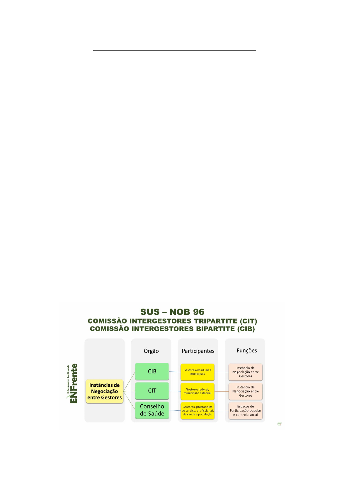 NOB-96: Normas Operacionais Básicas do SUS ● Surgem a partir da publicação das Portarias que regulamentam as leis do SUS, principalmente quanto ao financiamento, gestão e planejamento. → As NOB são instrumentos para a definição de estratégias e movimentos táticos-operacionais que reorientam a operacionalidade do Sistema, a partir da avaliação periódica de implantação e desempenho do SUS. - induzem e estimulam mudanças; aprofundam e reorientam a implementação do SUS; definem novos objetivos, prioridades, diretrizes e movimentos tático operacionais; regulação de relação entre gestores no SUS. → A NOB-96 promove e consolida o pleno exercício, por parte do poder público municipal e do Distrito Federal, da função de gestor da atenção à saúde dos seus munícipes. → Abrange os Campos de Atenção à Saúde da assistência, das intervenções ambientais e das políticas externas ao setor saúde. → SUS Municipal: conjunto de estabelecimentos, organizados em rede regionalizada e hierarquizada, e disciplinados segundo subsistemas, um para cada município. - voltada ao atendimento de sua própria população. → Gerência na NOB-96: administração de uma unidade ou de órgão de saúde que presta serviço para o SUS. → Gestão na NOB-96: atividade e responsabilidade de dirigir um sistema de saúde. → Programação Pactuada e Integrada (PPI): relação entre os sistemas municipais, que traduz as responsabilidades de cada município com a garantia de acesso da população aos serviços de saúde. → Financiamento das Ações e Serviços de Saúde: o financiamento do SUS é de responsabilidade das três esferas de governo e cada um deve assegurar o aporte regular de recursos, ao respectivo fundo de saúde. - Conforme determina o Artigo 194 da Constituição Federal, a saúde integra a Seguridade Social, juntamente com a Providência e a Assistência Social. → Custeio da Assistência Hospitalar e Ambulatorial são feitos por: Transferência Regular e Automática (Fundo a Fundo) e Remuneração por Serviços Produzidos. → Assistência Ambulatória - Piso Assistencial Básico (PAB): montante de recursos financeiros destinado ao custeio de procedimentos e ações de assistência básica, de responsabilidade tipicamente municipal. - é calculado pela multiplicação de um valor per capita. → Fração Assistencial Especializada (FAE): é um montante correspondente a procedimentos ambulatoriais de média complexidade, medicamentos e insumos excepcionais, órteses e próteses ambulatoriais e Tratamento Fora do Domicílio (TFD), sob gestão do estado.