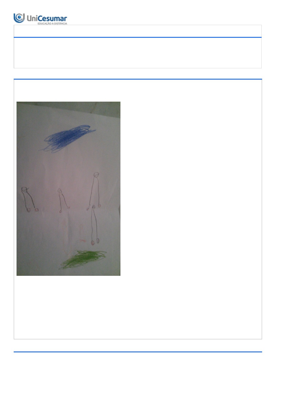 03/04/2021 Unicesumar - Ensino a Distância 1/7 ATIVIDADE 1 - PED - METODOLOGIA DA ALFABETIZAÇÃO - 2019A1 Período:18/02/2019 08:00 a 17/03/2019 23:59 (Horário de Brasília) Status:ENCERRADO Nota máxima:0,50 Gabarito:Gabarito será liberado no dia 18/03/2019 00:00 (Horário de Brasília) Nota obtida:0,50 1ª QUESTÃO Observe o desenho feito por Maria Luisa de 3 anos de idade, analise suas características, para então assinalar a alternativa correta. ALTERNATIVAS 03/04/2021 Unicesumar - Ensino a Distância 2/7 Maria Luisa encontra-se na fase das garatujas desordenadas, pois seu desenho apresenta a figura humana com formato de homem-girino. Maria Luisa encontra-se na fase pré-esquemática, pois seu desenho encontra-se organizado com elementos do céu na parte superior e elementos da terra na parte inferior da folha. Maria Luisa encontra-se na fase esquemática, pois seu desenho apresenta uma organização visível aos olhos dos adultos, sem que seja necessário ser escriba do pensamento da criança. Maria Luisa encontra-se na fase pré-esquemática, pois em seu desenho aparece a imagem da figura humana caracterizada como homem palito. Não existe também relação espacial entre as imagens. Maria Luisa encontra-se na fase da garatuja controlada, pois seu desenho tem características como pés e mão saindo da cabeça, mostrando, assim, total controle do início ao fim de cada imagem. 2ª QUESTÃO Analise as asserções que seguem e a relação proposta entre elas. Ao desenhar, a criança desenvolve diferentes aspectos: emocional, intelectual, físico, perceptual, social, estético e criador. Sendo assim, podemos considerar o desenho como um valioso instrumento de análise por parte do professor. Por isso A Educação Infantil, principalmente, deve proporcionar atividades que coloque a criança em contato com o desenho. É importante que ela desenhe momentos vividos, histórias que ouviu, algo que gostou de ver, passeios, entre outros que sejam prazerosos. Assim o professor poderá observar para poder fazer as intervenções necessárias. Acerca dessas asserções, assinale a alternativa correta. ALTERNATIVAS As asserções I e II são proposições verdadeiras, e a II é uma justificativa correta da I. As asserções I e II são proposições verdadeiras, mas a II não é uma justificativa correta da I. A asserção I é uma proposição verdadeira, e a II é uma proposição falsa. A asserção I é uma proposição falsa, e a II é uma proposição verdadeira. As asserções I e II são proposições falsas. 3ª QUESTÃO Leia as sentenças que seguem e a relação proposta entre elas: I. No momento em que a criança pega uma caneta ou um pincel atômico e risca um papel, ela percebe que deixou uma marca aleatória; esse é o início do processo evolutivo do desenho. Porque II. Ao fazer isso, ela já se encontra na fase esquemática, ou seja, já compreende, principalmente, o esquema de desenho da figura humana. Acerca dessas asserções, assinale a alternativa correta. 03/04/2021 Unicesumar - Ensino a Distância 3/7 ALTERNATIVAS As asserções I e II são proposições verdadeiras, e a II é uma justificativa correta da I. As asserções I e II são proposições verdadeiras, mas a II não é uma justificativa correta da I. A asserção I é uma proposição verdadeira e a II é uma proposição falsa. A asserção I é uma proposição falsa e a II é uma proposição verdadeira. As asserções I e II são proposições falsas. 4ª QUESTÃO Para que uma criança desenvolva bem seu processo de leitura e escrita, faz-se necessário dar atenção a alguns fatores que podem ser determinantes para que ela não apresente problemas de aprendizagem futuros. Analise os fatores abaixo e considere F para as afirmações falsas e V para as verdadeiras. I. Muitas trocas de professores, no decorrer do ano, podem acarretar diversos problemas para o alfabetizando, entre eles a falta de estabelecimento de vínculo afetivo com o professor. II. Em uma sala de alfabetização, deve ser evitado planejamentos improvisados, ou seja, nenhum planejamento deve ser levado para sala de aula sem uma ação pedagógica intencional e com objetivos determinados. III. A afetividade por parte do professor é um fator determinante para que a aprendizagem da criança aconteça de forma prazerosa. A criança precisa se sentir segura para poder conversar e sanar suas dúvidas sem medo de repressão por parte do professor. IV. A escola deve promover capacitações com foco na alfabetização. A formação continuada para preparar professores alfabetizadores fará com que o processo de ensinar e aprender se consolide de forma a preparar os alunos para a sociedade letrada. V. Planejamento anual, bimestral e diário. Em salas de alfabetização, como as crianças ainda são pequenas, apenas a realização do planejamento bimestral é suficiente para que se consiga alcançar os objetivos esperados. Partindo da análise das afirmações, assinale a sequência correta. ALTERNATIVAS V,V,F,V,V. V,V,V,V,F. V,V,V,F,F. F,V,V,V,F. F,V,F,V,F. 5ª QUESTÃO 03/04/2021 Unicesumar - Ensino a Distância 4/7 Toda criança trabalha cognitivamente com o que o meio lhe oferece. Mesmo antes de entrar na escola, ela pensa na escrita e nos símbolos que se apresentam no mundo que a rodeia. Sendo assim, formula hipóteses em relação à escrita. Tendo como referência nossas aulas e as leituras realizadas na disciplina de Metodologia da Alfabetização, observe o texto a seguir, que foi escrito por João Pedro, uma criança da educação infantil, próxima a fazer 5 anos, e identifique em que nível conceitual linguístico ele se encontra. ALTERNATIVAS João Pedro encontra-se no nível alfabético, pois, apesar de ter erros, já compreendeu que a escrita representa a fala; ele atribui valor sonoro às letras. João Pedro encontra-se no nível intermediário I, pois já conseguimos identificar o que ele quis escrever. Seu texto está legível e