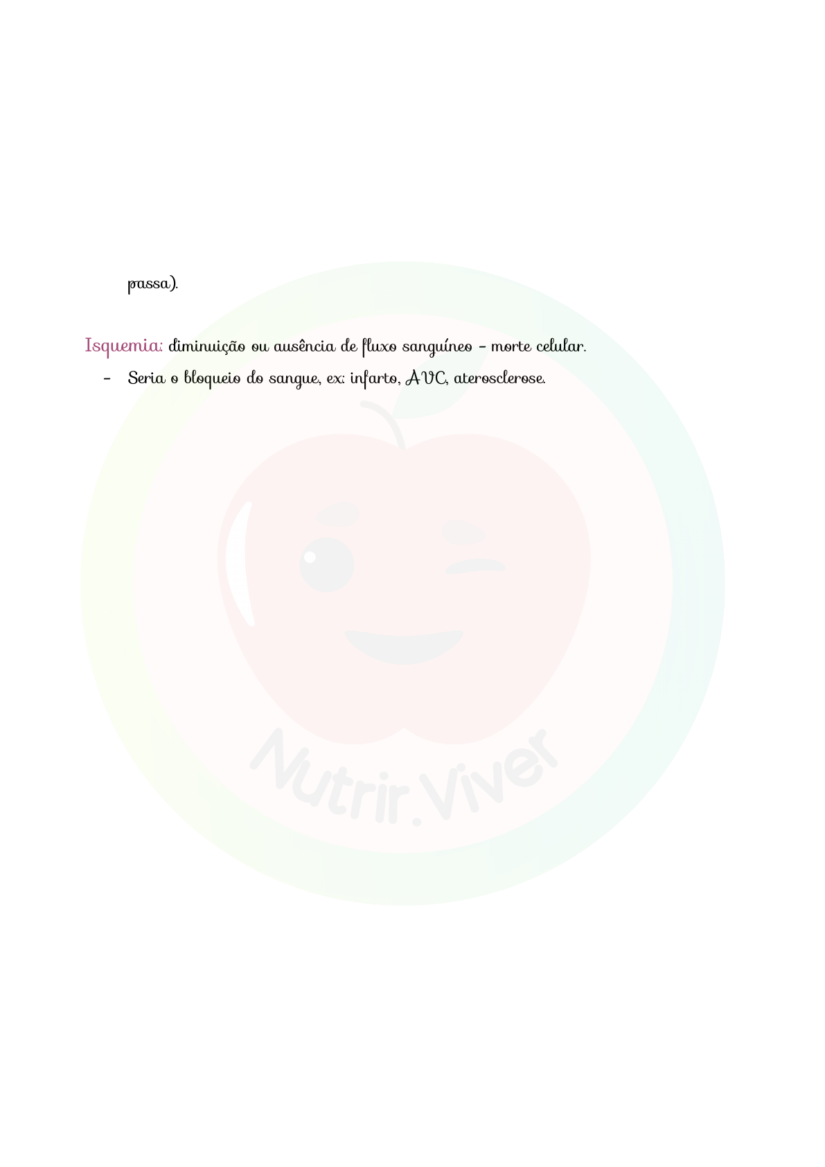 Hipóxia: diminuição de oxigênio no sangue - lesão reversível - a célula se lesiona, mas como ainda tem oxigênio é reversível. Anóxia: Ausência de oxigênio no sangue - morte celular - Afogamento, fumaça, asfixia, ou quando temos uma hipóxia que evolui como a trombose (diminui o fluxo sanguíneo - diminuição do retorno venoso e oxigênio não passa). Isquemia: diminuição ou ausência de fluxo sanguíneo - morte celular. - Seria o bloqueio do sangue, ex: infarto, AVC, aterosclerose.
