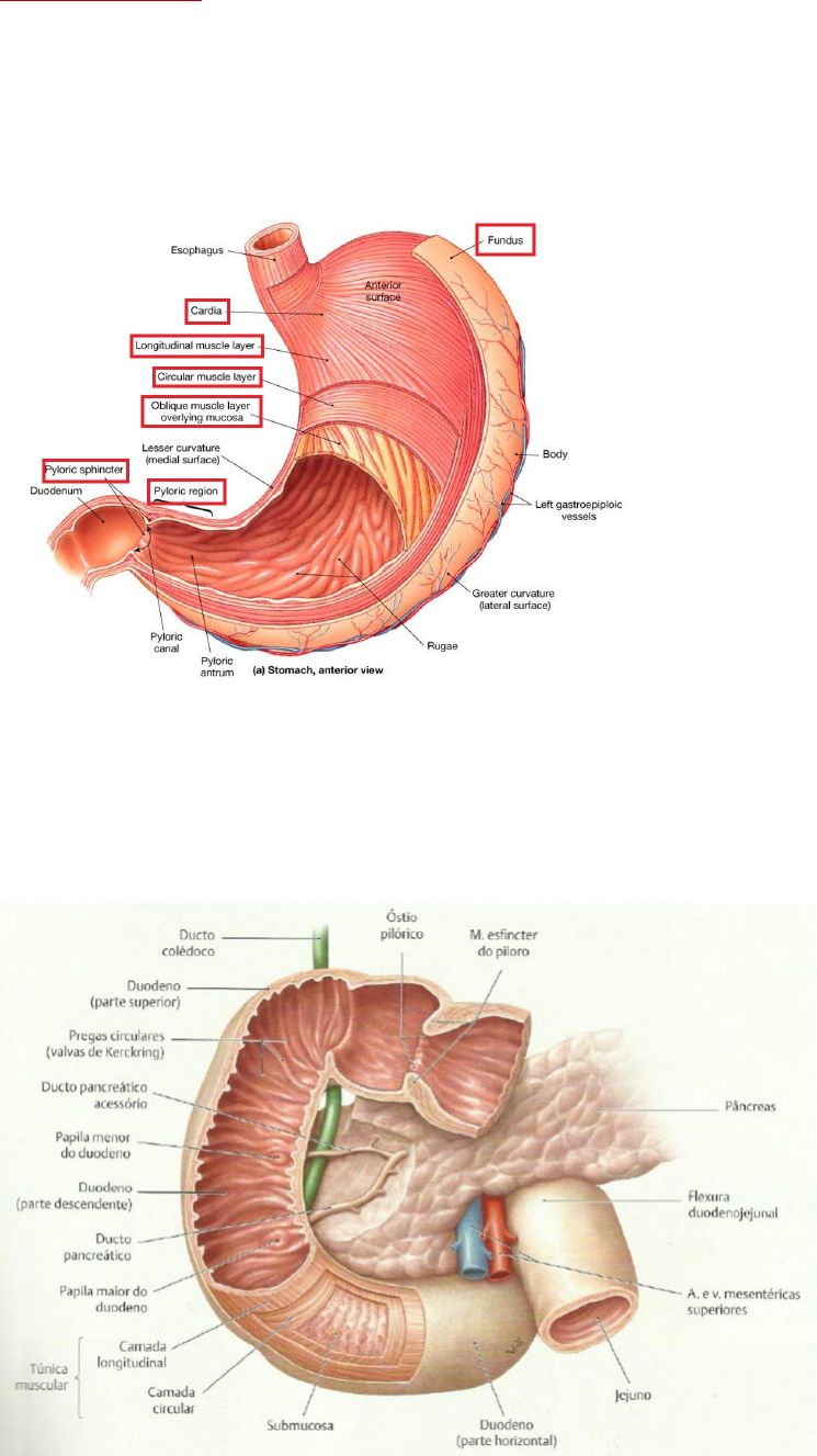 Unidade 1 Aula 2 Estômago - Intraperitoneal - Com três camadas musculares: longitudinal externa, interna e muscular obliqua (essa última o intestino não tem) é ele quem faz com que ocorra o peristaltismo – melhor digestão Duodeno - Retroperitoneal - Porção descendente para anatomia é a mais importante porque tem a papila maior, onde desemboca o ducto pancreático principal e o ducto colédoco que trás a bile - Flexura Duodeno Jejunal é sustentada pelo ligamento de Treitz (nome popular ângulo de Treitz), que vem do pilar fragmático direito, pode ser chamado de músculo suspensor do duodeno, repare que ele dá uma volta por cima Jejuno e Íleo são difíceis de separar a olho nu Jejuno é mais calibroso, tem no mesentério menos gordura, os vasos pequenos que chegam ate o intestino são menos complexos e menos numerosos e é mais rugoso que o Íleo Ceco - Peritoneal, não tem meso mas o íleo compartilha um pouco com ele - Tem uma válvula íleo cecal que não retorna ao íleo, quem tem essa válvula incompetente = refluxo - Apendicite ocorre quando obstrui o orifício do apêndice, ele entope e as bactérias se proliferam, crescimento vascular decresce e pode romper Vascularização 3 Vasos mais importantes - Tronco celíaco – primeiro vaso depois que a aorta passa pelo diafragma, vasculariza a parte superior do T.I - Artéria mesentérica superior, vaso que mais vasculariza o T.I, fica dentro do mesentério e inferior Estruturas do tronco celíaco - Tronco sai da aorta, é o primeiro ramo grande da aorta abdominal e se divide nas três artérias - Artéria gástrica esquerda que acompanha a curvatura pequena gástrica - Artéria esplênica passa atrás do estômago, no retroperitoneo e vai lá pro baço Artéria Hepática comum que se divide em - Artéria própria vai para o fígado - Artéria gástrica direita vai para a pequena curvatura gástrica e se encontra com a gástrica Artéria Gastro duodenal se dividindo em - Superior - Artéria gastroepiploica direita que contorna a grande curvatura e se encontra com a - gastroepiploica esquerda que vem da esplênica Artéria mesentérica superior - Emerge da aorta, um pouco abaixo do tronco celíaco, sua saída é atrás do pâncreas e na frente do duodeno - Responsável por vascularizar maior parte do jejuno e do íleo e uma grande parte do intestino grosso - Vasculariza até a flexura esquerda do intestino grosso, a partir disso é a artéria mesentérica inferior, indo até a porção superior do anus, origina a artéria superior retal Artéria Superior retal Vascularizado pela - Artéria retal média que vem da artéria ilíaca interna e emite um ramo que vasculariza parte média do reto e emite outro ramo que vai para a região pubal, artéria pudenda interna e um dos ramos e a artéria inferior que fica abaixo da musculatura que parece um funil no anus Aorta se divide em artéria comum direita e esquerda, na pelve se dividindo em externa – vai pra coxa e pernas, enquanto a interna vasculariza a pelve Artéria retal superior vem da artéria mesentérica inferior Artéria retal media vem da artéria ilíaca interna Artéria retal inferior vem da artéria pudendo interna que vem da artéria ilíaca interna Circulação venosa Veias retais superiores que vão drenar pra veia mesentérica inferior que cai na veia esplênica e se une na veia mesentérica superior, essa junção forma a veia porta do fígado Veias retais medias e Veias retais inferiores terminam na circulação ilíaca interna e depois cai na veia cava inferior e veia cava ilíaca comum Radiografia Normal: Obstrução – empilhamento de moedas Intestino está todo inchado, cheio de ar Pneumoperitôneo Cavidade com ar – parte preta no diafragma