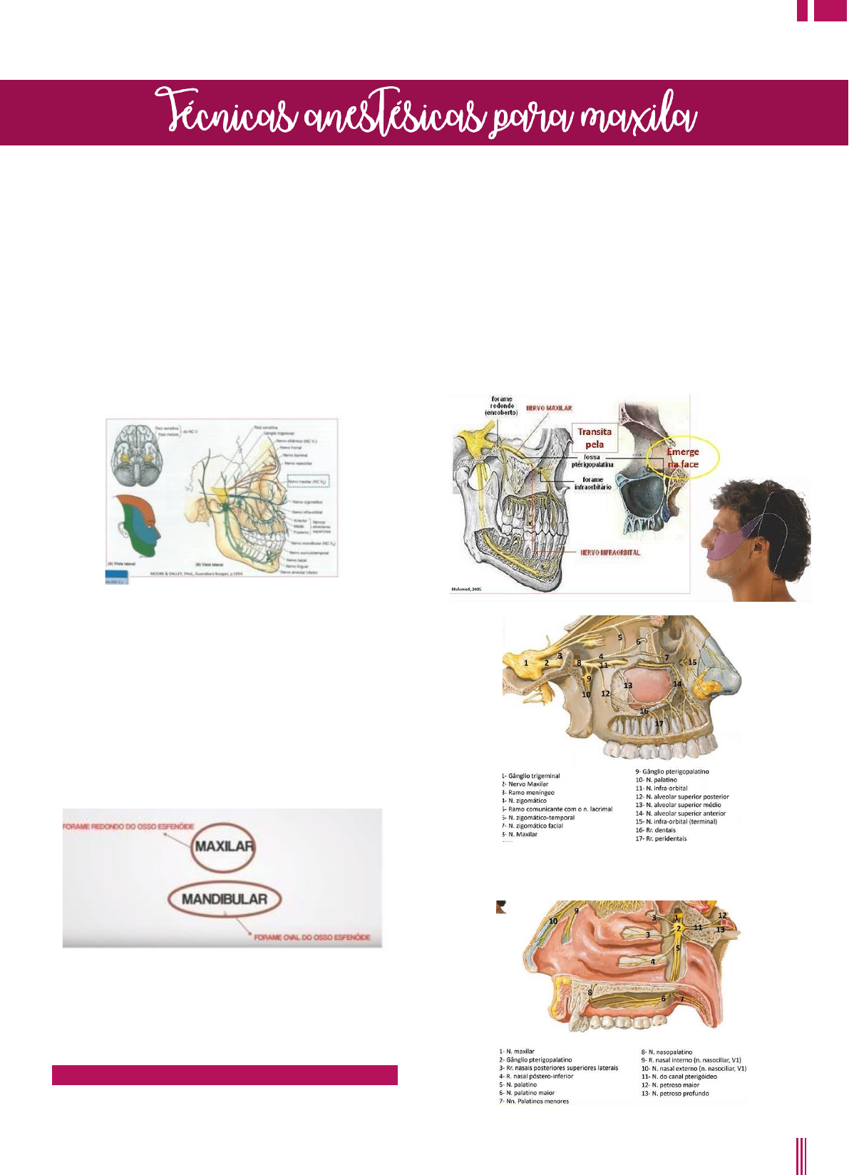 1 Isabella Guimarães e Lissandra Agra @odontoagra @odontologiaeficaz Técnica de injeção básica. Conhecimentos anatômicos. Técnica específica. Quando vamos fazer a técnica de injeção básica também precisamos conhecer a anatomia humana, é impossível dar uma agulhada em alguém sem saber onde deve pegar podendo gerar um hematoma. Então precisamos ter conhecimentos anatômicos e conhecimento sobre a técnica específica a ser utilizada. Conhecer o nervo trigêmeo: Na boca para anestesiar com qualidade devemos rever todo o nervo trigêmeo. No nervo trigêmeo devemos ter em mente os pares dos nervos cranianos e focar principalmente no 5° par craniano (trigêmeo) que é o que inerva toda a nossa área de atuação na odontologia. Recapitular qual é a raiz sensitiva do trigêmeo, qual é a motora, ver o que ele inversa, as divisões (V1- n. oftalmo; V2- n. maxilar; V3- n. mandibular) e devemos conhecer isso a fundo pois quem não conhece não consegue ser um bom anestesiologista. Conhecer o trigêmeo é fundamental. Ele vai entrar pelo forame redondo do osso esfenoide. Para fixar melhor pense da seguinte forma: o maxilar é mais redondo, logo, maxilar é forame redondo do osso esfenoide. Oval: mandíbula (forma oval do osso esfenoide). Nervo maxilar Quando falamos no nervo maxilar, no nosso ramo V2 do trigêmeo teremos muitas coisas para lembrar, uma delas é que ele entra pelo forame redondo e ele vai transitar pela nossa fossa ptérigopalatina e vai emergir na face e inervar a nossa maxila. Porém, ele tem diversas subdivisões didática e precisamos trabalhar todas essas subdivisões. Sai do gânglio digaster, adentra pelo forame redondo e ele vai transitar pela nossa fossa ptérigopalatina e vai emergir na face e inervar os molares depois entra no forame intraorbitário e vai inervar uma grande parte da maxilar. Então o nosso nervo maxilar se divide em 17 áreas. E precisamos lembrar tudo isso. 2 Isabella Guimarães e Lissandra Agra @odontoagra @odontologiaeficaz Aqui foi feito um corte diferente para poder ver os nervos mais importantes do nervo maxilar. As imagens são os nervos que precisamos saber (e o que eles inervam). • Resumo de inervação maxilar: Imagem para recordar o que cada ramo inerva. Divisão da anestesia local A anestesia local vai se dividir em anestesia intra-oral e extra-oral. Dentro das anestesias intra-orais temos as anestesias terminais e anestesias por bloquei, dentro das anestesias terminais temos as superficiais ou tópicas (faz com xilocaína, benzotópico para o paciente não sentir a anestesia/agulha) e temos as profundas (infiltrativas- onde faz um ponto de pulsão no paciente e injeta a solução anestésica de modo infiltrativa). E dentro das anestesias por bloqueio temos a regional (campo- pega parte do trajeto do nervo) e troncular (bloqueia o ramo inteiro). A primeira coisa que devemos saber é como é dividido a anestesia local. Técnicas anestésicas para maxila Nós começamos pela anestesia da região maxilar porque o maxilar pela sua própria topografia dentoalveolar tem um osso esponjoso, e nossas anestesias são mais efetivas na maxila do que na mandíbula porque na mandíbula precisa usar mais bloqueio, pois, a infiltrativa localizada não faz tanto efeito e acaba tendo que trabalhar com bloqueios tronculares (e as vezes tem que bloquear o ramo todo para que tenha uma anestesia efetiva). Por ser um osso esponjoso, tem grande difusibilidade da anestesia e acaba colaborando melhor devido dessa difusibilidade. Anestesia terminal infiltrativa: As nossas anestesias terminais infiltrativas vão bloquear as pequenas terminações nervosas. 3 Isabella Guimarães e Lissandra Agra @odontoagra @odontologiaeficaz As pequenas terminações nervosas são responsáveis por dar toda inervação na maxila e por esse motivo fazemos o bloqueio dessas. Diferença entre bloqueio da maxila e da mandíbula: Anestesia troncular: A imagem abaixo é para entender a diferença entre a anestesia terminal infiltrativa da troncular, onde é realizada na mandíbula. Na mandíbula vamos ter que procurar/realizar a anestesia troncular para bloquear a mandíbula. Então é muito mais difícil de bloquear a mandíbula do que a maxila. Anestesia troncular do nervo maxilar: A gente tem também bloqueios da maxila, por exemplo, tem um chamado bloqueio da tuberosidade maxilar e com isso conseguimos bloquear mais de um dente ao mesmo tempo. Então dependendo do procedimento operatório vamos querer lançar mão das anestesias tronculares para obter uma efetividade maior que as anestesias infiltrativa comum (que é considerada/chamada supra-periostal). Então aqui por exemplo, anestesiando na base dele obtemos anestesia de 3 molares de uma vez. A vantagem disso é que com um tubete de 1,8ml bloqueamos 3 dentes ao mesmo tempo= menos toxicidade, menos agulhada e mais opicionalidade. Exemplo: na hora de exodontia de 3° molar. Tipos de anestesia: Essa figura é justamente para poder entender a diferença da infiltrativa, regional e troncular. Obs.: a área em vermelho mostra o local que pega a anestesia. A infiltrativa usa para anestesiar somente um dente. Regional pega parte do ramo. Troncular bloqueia de forma que bloqueia o tronco inteiro. Pergunta de aluno: Troncular é a mesma conhecida como bloqueio? R: sempre utiliza a expressão bloqueio quando utiliza uma anestesia para mais de um dente e quando deposita o anestésico perto do ramo inervatório. Por exemplo: não é fácil como a infiltrativa que age por difusão pois vai ter que depositar esse anestésico mais próximo do ramo, seja ele parcial para inervar uma hemi-arcada na anestesia regional como na gravura acima e também como lança mão para bloquear o tronco inteiro. Então faz bloqueio para anestesiar o tronco e para anestesiar o regional também. O bloqueio é o ato de bloquear mais de um dente, uma região maior (tecido mole, área de periósteo). Anestesia terminal Quando fala em anestesia terminal 