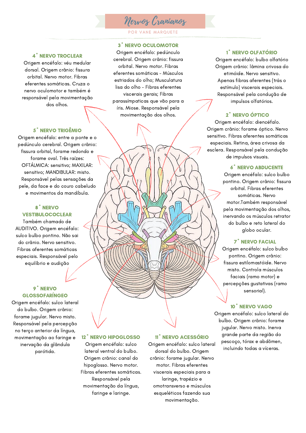 Nervos Cranianos 1º NERVO OLFATÓRIO Origem encéfalo: bulbo olfatório Origem crânio: lâmina crivosa do etimóide. Nervo sensitivo. Apenas fibras aferentes (trás o estímulo) viscerais especiais. Responsável pela condução de impulsos olfatórios. 2º NERVO ÓPTICO Origem encéfalo: diencéfalo. Origem crânio: forame óptico. Nervo sensitivo. Fibras aferentes somáticas especiais. Retina, área crivosa da esclera. Responsável pela condução de impulsos visuais. 3º NERVO OCULOMOTOR Origem encéfalo: pedúnculo cerebral. Origem crânio: fissura orbital. Nervo motor. Fibras eferentes somáticas - Músculos estriados do olho; Musculatura lisa do olho - Fibras eferentes viscerais gerais; Fibras parassímpaticas que vão para a íris. Miose. Responsável pela movimentação dos olhos. 4º NERVO TROCLEAR Origem encéfalo: véu medular dorsal. Origem crânio: fissura orbital. Nervo motor. Fibras eferentes somáticas. Cruza o nervo oculomotor e também é responsável pela movimentação dos olhos. 5º NERVO TRIGÊMIO Origem encéfalo: entre a ponte e o pedúnculo cerebral. Origem crânio: fissura orbital, forame redondo e forame oval. Três raízes: OFTÁLMICA: sensitivo; MAXILAR: sensitivo; MANDIBULAR: misto. Responsável pelas sensações da pele, da face e do couro cabeludo e movimentos da mandíbula. 6º NERVO ABDUCENTE Origem encéfalo: sulco bulbo pontino. Origem crânio: fissura orbital. Fibras eferentes somáticas. Nervo motor.Também responsável pela movimentação dos olhos, inervando os músculos retrator do bulbo e reto lateral do globo ocular. 7º NERVO FACIAL Origem encéfalo: sulco bulbo pontino. Origem crânio: fissura estilomastóide. Nervo misto. Controla músculos faciais (ramo motor) e percepções gustativas (ramo sensorial). 8º NERVO VESTIBULOCOCLEAR Também chamado de AUDITIVO. Origem encéfalo: sulco bulbo pontino. Não sai do crânio. Nervo sensitivo. Fibras aferentes somáticas especiais. Responsável pelo equilíbrio e audição 9º NERVO GLOSSOFARÍNGEO Origem encéfalo: sulco lateral do bulbo. Origem crânio: forame jugular. Nervo misto. Responsável pela percepção no terço anterior da língua, movimentação ao faringe e inervação da glândula parótida. 10º NERVO VAGO Origem encéfalo: sulco lateral do bulbo. Origem crânio: forame jugular. Nervo misto. Inerva grande parte da região do pescoço, tórax e abdômen, incluindo todas a víceras. 11º NERVO ACESSÓRIO Origem encéfalo: sulco lateral dorsal do bulbo. Origem crânio: forame jugular. Nervo motor. Fibras eferentes viscerais especiais para a laringe, trapézio e omotransverso e músculos esqueléticos fazendo sua movimentação. 12º NERVO HIPOGLOSSO Origem encéfalo: sulco lateral ventral do bulbo. Origem crânio: canal do hipoglosso. Nervo motor. Fibras eferentes somáticas. Responsável pela movimentação da língua, faringe e laringe. P O R V A N E M A R Q U E T EP O R V A N E M A R Q U E T E