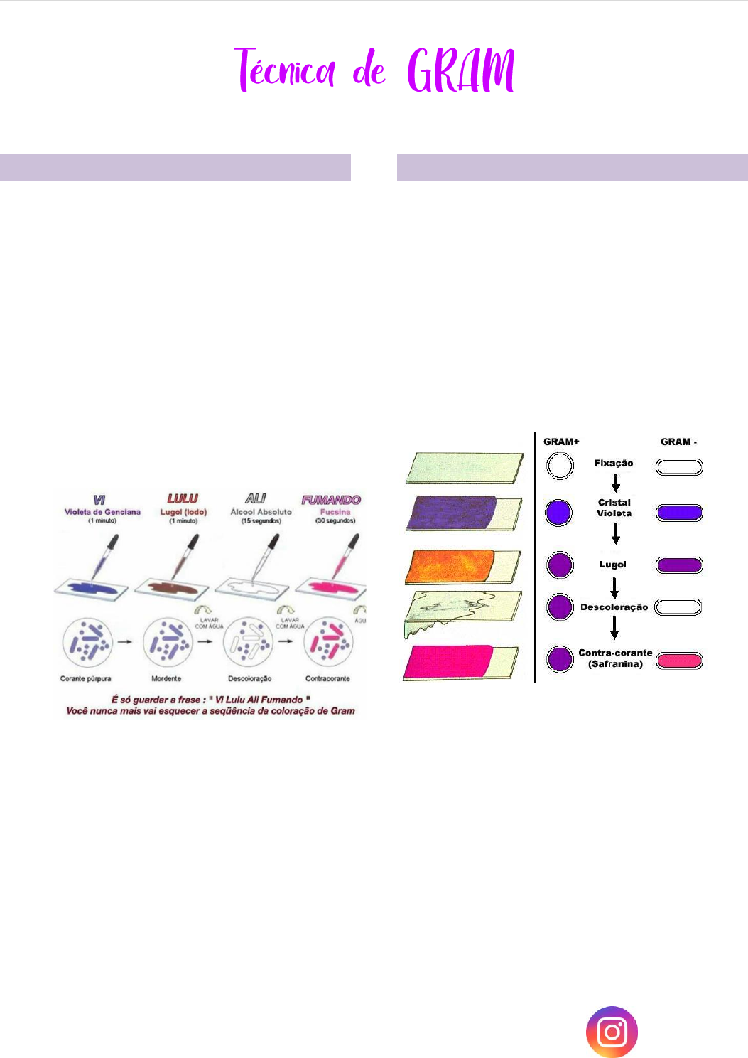 | 1 P á g i n a O que e A técnica de Gram é um método de coloração de bactérias desenvolvido pelo médico dinamarquês Hans Christian Joachim Gram. Permite diferenciar bactérias com diferentes estruturas de parede celular a partir das colorações que estas adquirem após tratamento com agentes químicos específicos. As bactérias que adquirem a coloração azul violeta são chamadas de gram- positivas e aquelas que adquirem a coloração vermelho são chamadas de gram-negativas. Obs: a etapa da descoloração é crítica, pois a exposição prolongada ao solvente provoca a remoção do cristal violeta dos dois tipos de bactérias, podendo produzir resultados falsos. Procedimento 1. Confeccionar o esfregaço; 2. Corar com cristal de violeta por 60 segundos; 3. Lavar com esguicho de água destilada; 4. Cobrir com Lugol por 60 segundos; 5. Lavar com esguicho de água destilada; 6. Descorar com álcool por 10 segundos; 7. Lavar com esguicho de água destilada; 8. Corar com fucsina por 20 segundos 9. Lavar com água destilada, secar e observar ao microscópio. Obs: O método da coloração de Gram é baseado na capacidade das paredes celulares de bactérias gram-positivas de reterem o corante cristal violeta no citoplasma durante um tratamento com etanol-acetona enquanto que as paredes celulares de bactérias gram- negativas não o fazem. @relatosdavet_ https://pt.wikipedia.org/wiki/Hans_Christian_Joachim_Gram https://pt.wikipedia.org/wiki/Hans_Christian_Joachim_Gram https://pt.wikipedia.org/wiki/Bact%C3%A9ria_gram-positiva https://pt.wikipedia.org/wiki/Bact%C3%A9ria_gram-positiva https://pt.wikipedia.org/wiki/Bact%C3%A9ria_gram-negativa