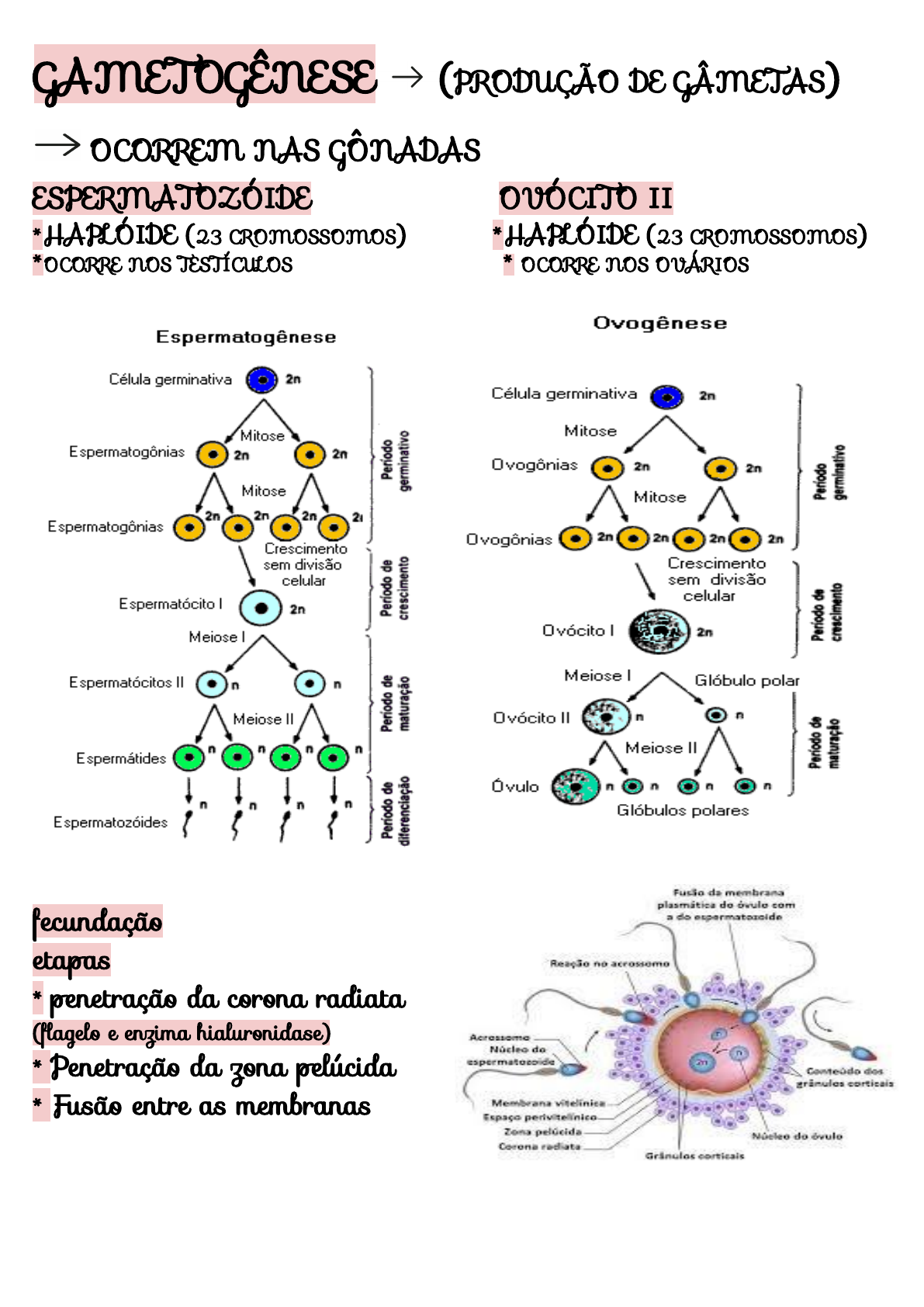 GAMETOGÊNESE (PRODUÇÃO DE GÂMETAS) OCORREM NAS GÔNADAS ESPERMATOZÓIDE OVÓCITO II *HAPLÓIDE (23 CROMOSSOMOS) *HAPLÓIDE (23 CROMOSSOMOS) *OCORRE NOS TESTÍCULOS * OCORRE NOS OVÁRIOS fecundação etapas * penetração da corona radiata (flagelo e enzima hialuronidase) * Penetração da zona pelúcida * Fusão entre as membranas