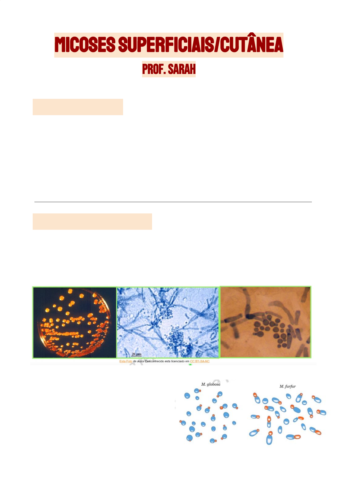 MICOSES SUPERFICIAIS/CUTÂNEA prof. SARAH INTRODUÇÃO As MICOSES SUPERFICIAIS PROPRIAMENTE DITAS afetam a camada córnea ou a cutícula do pelo. A RI, nessas infecções, é mínima ou ausente, sendo raramente sintomática. Exemplos dessas micoses são pitiríase versicolor, piedra branca, piedra preta, tinha negra. As MICOSES SUPERFICIAIS CUTÂNEAS, por sua vez, acometem a pele, os pelos e as unhas, sendo sintomáticas. Exemplos podem ser dermatófitos, Candida e fungos filamentosos não dermatofíticos. MALASSEZIA SPP. É um fungo polimórfico encontrado em toda superfície da pele em humanos (microbiota) e uma variedade de animais homeotermos. Fazem colonização da pele após o nascimento. Esse fungo pode ser comensal ou patogênico. O gênero consiste em 17 espécies, 10 colonizando a pele humana ou causam doenças em humanos. O gênero Malassezia é lipodependente (exceção: M. pachydermatis), e faz reprodução por brotamento, por estruturas reprodutivas chamadas blastoconídios. A Malassezia não consegue fazer a síntese ácido graxo, por isso habita regiões mais gordurosas (seborreicas) e libera lipases para realizar a hidrólise de lipídios (principal fonte de energia). Apresentam pseudomicélio e micélio verdadeiro. A identificação, portanto, é mais complicado e é realizada em base a fisiologia, morfologia, assimilação do Tween-20, 40, 60 e 80 (tensoativo), catalase e meios de cultura. Utiliza-se a cultura, analisando-se a prova de catalase e de temperatura, por exemplo, seguindo a tabela de classificação das espécies para diferenciar e identificar qual a espécie em questão. A identificação recomendada, no entanto, é a técnica molecular, em enfoque polifásico, ou seja, a Malassezia passa por várias fases e testes de identificação (tradicionais + molecular). Faz o sequenciamento das regiões ITS e D1/D2 do rDNA, bem como genes codificadores de proteínas. Fazendo-se o Maldi-TOF, um teste de espectrometria de massa, que reconhece bem a espécie do fungo. As espécies de Malassezia estão adaptadas a pele humana e estão implicadas em algumas doenças de pele, incluindo: pitiríase versicolor, dermatite seborreica/caspa, dermatite atópica, foliculites, psoríase. Obs.: M. globosa é a espécie mais frequentemente associada com doenças em humanos. A Malassezia também pode causar doenças mais graves como a pneumonia, sepse, peritonite e fungemia.. Infecções sistêmicas podem ser causadas por M. furfur, M sympodialis, M. pachydermatis. Estados de Convivência de Malassezia com a Pele A Malassezia pode estar em estado comensal, em que a levedura está em equilíbrio com a pele, não causando doenças. Pode também estar em estado patogênico, em que a levedura prolifera amplamente sem infligir inflamação (PV). Ainda, pode estar implicada com doenças com inflamação visível (dermatite seborreica, dermatite atópica e psoríase). PITIRÍASE VERSICOLOR A pitiríase versicolor é uma micose benigna crônica. Há a presença de placas com descamação fina, que podem ser hipocrômicas ou hipercrômicas, podendo comprometer tronco, ombros, parte superior dos braços, pescoço e face. Obs.: A etiologia da doença é representada por M. globosa (97%), M. sympodialis, M. furfur. As máculas causadas pela pitiríase versicolor tem bordas irregulares e tamanhos diferentes podendo confluir e formar o que chamamos de “mapa geográfico”. Essa doença ocorre quando a Malassezia que coloniza a pele muda da forma leveduriforme para a forma de hifa que invade o estrato córneo, podendo ser consequência de alterações imunológicas locais. Obs.: descamação X inflamação: causa ou consequência da superpopulação fúngica. A pitiríase versicolor pode ser chamada também de micose de praia, pano branco, tínea versicolor, dermatomicose furfurácea, manchas de fígado. A doença está distribuída mundialmente 50% nos climas tropical e subtropical. Atinge todas as raças, estado socioeconômico e ambos os sexos. Há relato desde recém-nascidos até idosos, sendo que a incidência maior está entre 18-25 anos (fatores hormonais, glândulas sebáceas). Há controvérsias, porém tem-se que há maior prevalência no sexo masculino. O período de incubação da doença é indeterminado em zonas tropicais e úmidas, porém para viajantes temporários nessas zonas apresentam incubação entre 5 e 20 dias. Fatores predisponentes para a doenças são calor, umidade, exposição ao sol, uso de cremes e bronzeadores oleosos, corticosteróides, falta de higiene, deficiência na produção de linfocinas, gravidez, deficiência nutricional, hiperidrose e contraceptivos orais. A patogenia se dá pela produção de queratinases e lipases e pelo polimorfismo. A pitiríase versicolor pode ser hipercromiante, em que há aumento no tamanho dos melanossomos, assim como sua distribuição na epiderme. Já a pitiríase versicolor hipocromiante cursa com diminuição da produção de melanina. A levedura lipofílica (M. furfur) degrada os lipídios da pele e forma o ácido azelaico que compete com a tirosinase, inibindo sua atividade, assim inibindo a cadeia para produção de melanina a partir da tirosina, produzindo manchas claras. A produção de ácido azelaico pode ser estimulada pela luz solar e, junto à pitiriacitrina, podem prejudicar os melanócitos. Essa doença apresenta lesões fáceis de identificar, com máculas descamativas com bordas bem definidas, apresentando tamanho, forma e cor variáveis. Geralmente é assintomática, mas as lesões aumentam de tamanho com o tempo e confluem, ocupando áreas extensas do corpo. As lesões podem ser hipopigmentadas ou hiperpigmentadas. Superpopulação fúngica é responsável pela inflamação e descamação. O diagnóstico clínico pode ser feito pelo sinal de Besnier (descamação furfurácea da lesão quando é raspada pela unha) e pelo sinal de Zileri (discreto esfacelamento da queratina local após leve estiramento com os