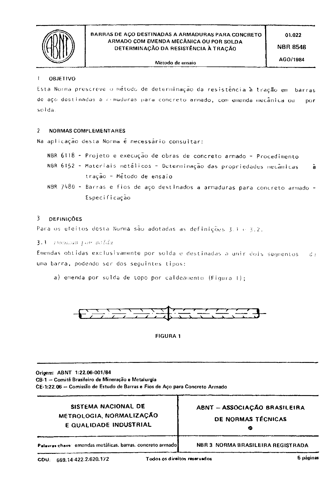 @ BAHRAS DE AC0 DESTINADAS A ARMADURAS PARA CONCRETO 01.022 ARMADO COM EMENDA MECANICA OU POR SOLDA DETERMINACAO DA RESIST~NCIA A TRAQiO NBR 8548 ---. MBrodo de ens& AGO11984 I OBJETIVO 2 NORMAS COMPLEMENTARES Na apiica$ao de.sta Nor~rla 6 necessario consultar: NBR 6118 - Projeto e execu~& de obras de concrete armado - Procedimento NBR 6152 - Mater-iais lwtilicos - Determinaqk das propriedades cwecanicas a tra$k - Metodo de ensaio NBR 7480 - Bat-ras e fios de a$o destinados a arnmduras para conireto amado - Especiiicagk FIGURA 1 Origem: ABM 1:22.06-001/84 CB-1 - ComitC Brarileiro de Minersqio B Metaluqla CE-1:22.1X - Comirsio de Ertudo do Barras e Fios de Aqo para Concrete Armado SISTEMA NACIONAL DE ABNT -ASSOClA@O BAASILEIRA METROLOGIA. NORMALIZACAO OE NORMAS TtCNICAS E QUALIDADE INDUSTRIAL e P.~.~..,~chws~ emendas metalicas. barras. concrete armado NBR 3 NORMA BRASILEIRA REGISTRADA CD”: 669.14.422.2~620.172 Todo% os dirsltos resavdor 6 phginar 2 NBR 854811984 b) emenda por solda de topo corn eletrodo (Figura 2); FIGURA 2 C) emenda por solda transpassada corn eletrodo (Figura 3); FIGURA 3 d) emenda por solda corn barras justapostas corn eletrodo (Figura 4); FlGURA4 e) emenda por solda de qualquer outro tipo que nao OS citados anteriormen- te. Emendas obtidas predominantemente por luvas e destinadas a unir dois segmentos de uma barra, podendo set- dos seguintes tipos: a) emenda corn luva rosqueada (Figura 5); FIGURA 5 NBR 8548/1984 3 b) emenda corn luva prensada (Figura 6); FIGURA 6 C) emenda corn luva preenchida (Figura 7); r’ ’ ’ - ’ ’ ’ I I I / , #,,I f-y/, \\’ ” 1 \ k -\ \ FIGURA 7 d) emenda corn luva de qualquer outro tipo que nao OS citados anteriormente, ou corn outro dispositivo mecanico qualquer. 4 EXECUCifO DO ENSAIO 4. 1 Amos Lraqm A amostragem dew ser realizada de acordo corn a NBR 7480. 4.2 corps-de-provu 4.2. 1 corpo-de-prova de barTas corn mcudns pr scZda E constituido de uma emenda entre duas barras conforme a Figura 8, onde a dimen - sao minima para o comprimento "E" 6 dada pela equas%: R = 10d + 100 Onde: R = comprimento, em mm d = diametro nominal da barra, conforme NBR 7480 EMENDA _-.-.-. ,-. - FIGURA 8 - Corpode-prom para e&&o de rotina de emenda par solda 4 NBR 8548/1984 4.2.2 Corpo-de-prom de barras corn emenda maciinica 4.2.2.1 E constituido de uma emenda entre duas barras conforme mostra a Figura 9, onde a dimensao minima para"k~"e 1000 mm e a dimensk minima para "a" 6 da - da pela equa+: c = 10d + 100 onde: I: = comprimento, em mm d = diametro nominal da barra, conforme NBR 7480 EMENDA I 1 FlGURA9 - Corps-de-prow paraensaio de qualificafkde emendas meciinicas 4.2.2.2 OS corpos-de-prova destinados ao ensaio de trac$o para controle de qua lidade de retina de emendas mecanicas devem atender ao que ests estabelecido em 4.2.1, ou seja, n.Zo 6 necessario o comprimento adicional T," 4.3 mm?edimento a) adequar o comprimento do corpo-de-prova da barra emendada par solda 5 maquina de ensaio; b) conduzir o ensaio de traqk de acordo con as NBR 6152 e NBR 7480, no que couber, a fim de determinar o valor da carga de ruptura; c) calcular o valor da resist&cia conventional 5 ruptura, utilizando o valor nominal da area da se$.k da barra e observar o local da ruptura. 4.3.2 rmcodincntos para bmras corn emenda mcc&ica 4.3.2.1 Procedimento para a qualifica$% de emenda mecanica: a) cortar a parte"Rl"do corpo-de-prova, conforme mostra a Figura 9, e adequar o seu comprimento a maquina de ensaio; b) conduzir o ensaio de trasao corn a parte"tl"do corpo-de-prova, de acordo corn as NBR 6152 e NBR 7480, no qua couber, a fim de determi- nar a resistencia de escoamento e a resistencia conventional 2 rup- tura, utilizando o valor nominal da srea da se& da barra; NBR X549/1984 * c) adequar o comprimento da parte restante do corpo-de-prova contendo a emenda mecsnica 5 mzquina de traG:o, marcando sobre o mesmo urn t re- cho, que dew canter a emenda, de dez vezes o diametro nominal da barra, a fim de determinar o alongamento; d) adaptar urn extensometro ao corpo-de-prova e tracionar ate atingir uma tensso igual a 702 do valor da resistencia ao escoamento do seg- mento da barra sem emenda, determinado conforme a alinea b desta su bs+o, sem ultrapassar, pot-&, 80% do valor da resistencia carac- teristica de escoamento “F yk ” da categoria do aso empregado, confor- me NBR 7480 e NBR 6118; e) calcular o alongamento do segment0 da barra corn emenda, tendo por ba se o trecho marcado, e retirar 0 extensEmetr0; f) aumentar a carga ate atingir uma ten&o de 2 a 4% maior do que o va- lor da resistencia de escoamento do segment0 da barra sem emenda; g) reduzir a carga at< atingir uma tensao igual ou inferior a 20% do va - lor da resistencia de escoamento do segmento da barra sem emenda; h) aumentar novamente a carga at& a ruptura do corpo-de-prova; i) calcular a tenGo conventional a ruptura, utilizando o valor nominal da area da sesao, e observar o local da ruptura. 4.3.2.2 Procedimento para controle de qualidade de retina de emenda mecanica: a) adequar o conlprimento do corpo-de-prova que conten a emenda mec;ini- ca a m.Squina de tragao; b) conduzir o ensaio de traG:o de acordo corn a NBR 6152, no que couber, a fim de determinar o valor da carga de ruptura; c) calcular o valor de resistgncia conventional 2 ruptura, utilizandoo valor nominal da area da se@o da barra, e observar o local da ruptu - ra. 5 RESULTADOS 0 laboratorio deve fornecer urn certificado no qual devem constar: a) dados fornecidos pelo interessado juntamente corn a amostra; b) identificaGao dos corpos-de-prova; c) valores de todas as propriedades mecanicas obtidos nos ensaios; d) IocalizasSo da ruptura do segment0 emendado. No case de emenda por solda de topo, o certificado dew fornecer ainda a distsncia da ruptura ao centro da solda, em mm. licenca: Cópia não autorizada