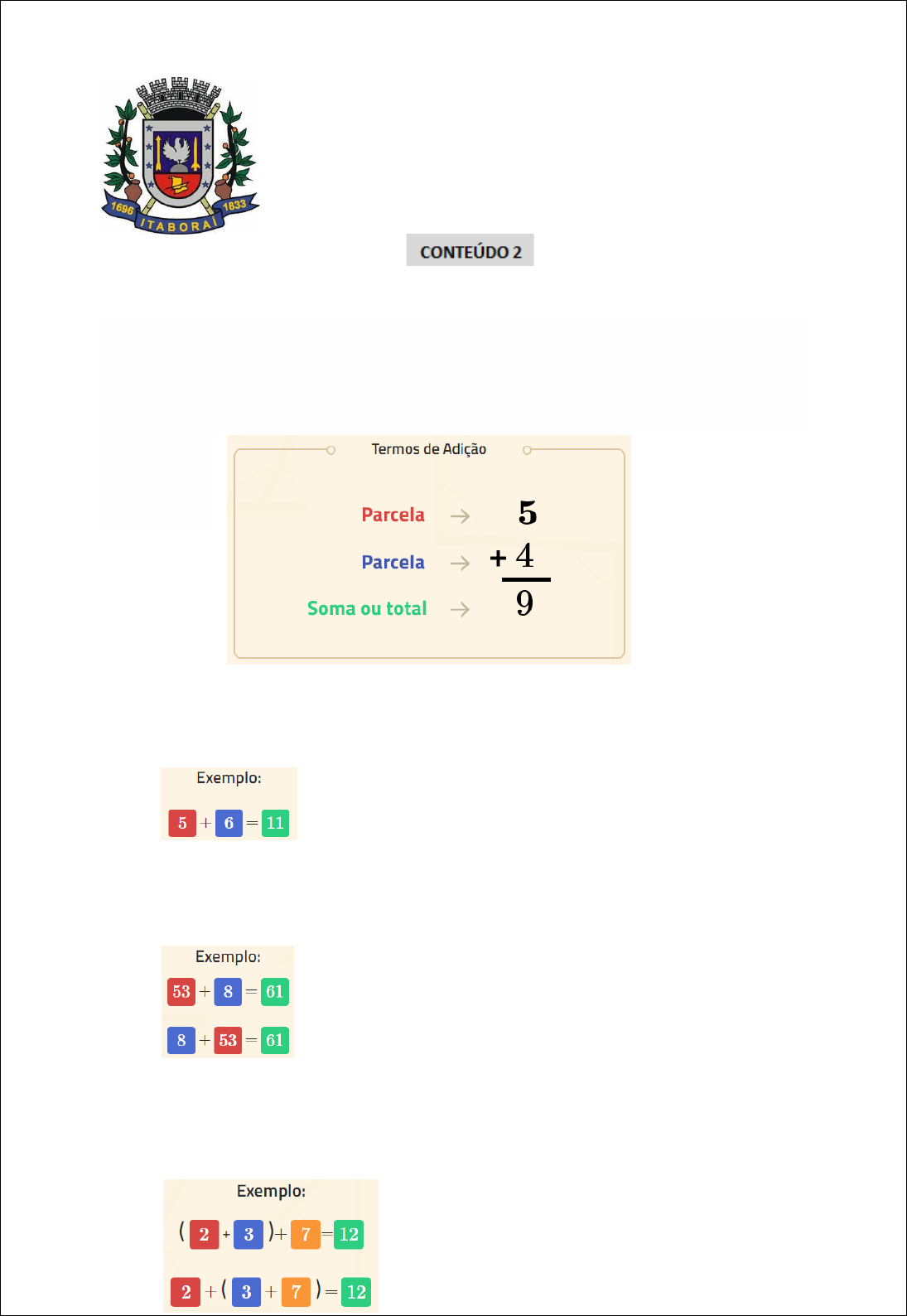 1 Escola Municipal Vereador Dimas Monteiro Nogueira Itaboraí, 10 de março de 2021. Disciplina: Matemática 7° ano, turma:________ Professora: Neilane Rodrigues Aluno(a):________________________________________ ADIÇÃO DE NÚMEROS NATURAIS (+) Adição de números naturais: É a operação responsável por adicionar dois ou mais números (chamados de parcelas). O resultado obtido após a operação é chamado de soma ou total. 1. Fechamento A adição de dois ou mais números naturais terá como resultado sempre um número natural. 2. Comutativa Ao trocarmos a ordem das parcelas, o resultado não é alterado. Ou seja, na adição, a+ba+b = b+ab+a. 3. Associativa Uma adição de três números reais pode ser feita associando-se as duas primeiras ou as duas últimas parcelas e o resultado não será alterado. Ou seja, (a+b) + c(a+b) + c = a + (b+c)a + (b+c). 2 4. Elemento neutro Dizemos que um elemento "aa" é neutro a uma operação, quando ao aplicarmos tal operação desse elemento neutro com outro elemento qualquer "bb", o resultado for o elemento "bb" qualquer. Vejamos exemplos de adição: a + b = b + a = b O número zero é o elemento neutro da adição, pois qualquer número adicionado ao zero tem como resultado o próprio número: 0 + 20 = 20 + 0 = 20 PROBLEMA RESOLVIDO 1: Pedro gastou 11 reais com fichas em um parque de diversão e sua irmã Carolina, gastou 8. Quantos reais os dois gastaram? IMPORTANTE: Para calcular uma adição, temos que respeitar as seguintes regras: - Unidades devem ser posicionadas uma abaixo da outra; - Dezenas devem ser posicionadas uma abaixo da outra; - Centenas devem ser posicionadas uma abaixo da outra; etc. - Realizar as operações sempre da direita para esquerda. PROBLEMA RESOLVIDO 2: Uma empresa de cosméticos possui 15 vendedores do sexo masculino e 37 vendedoras do sexo feminino. Calcule o total de vendedores nessa empresa. 3 PROBLEMA RESOLVIDO 3: Em um mês, Igor gastou 120 reais em lanches rápidos na faculdade. Adicionados a isso, nesse mesmo fatídico mês, gastou 100 reais em xerox, 6 reais em uma rifa para a formatura e 50 reais em brigadeiro - para ajudar seu colega de turma. Quanto foi gasto por Igor nesse mês? ADIÇÃO DE NÚMEROS GRANDES Adicionar números grandes pode gerar dúvidas. Por isso, é importante que se organizem os algarismos em unidades, dezenas, centenas, unidades de milhar, dezenas de milhar, etc. Para isso, posicione na primeira parcela o número de maior valor. E após, posicione o segundo número para que a unidade fique abaixo de unidade, dezena abaixo de dezena, centena abaixo de centena. SUBTRAÇÃO (-) É uma operação que indica quanto é um valor numérico (minuendo) se dele for removido outro valor numérico (subtraendo). Chamamos de minuendo, o primeiro número da subtração e, de subtraendo, o segundo número da subtração. O resultado da subtração é chamado de diferença ou resto. 4 Termos de Subtração PROBLEMA RESOLVIDO 1: Um vendedor saiu de casa e vendeu R$ 88 em picolés de seu carrinho. No fim do dia, ele precisou se alimentar e gastou R$ 12. Quantos reais lhe sobraram? • A quantidade (em reais) que sobrou é igual a quantidade total que ele tinha, menos a que ele gastou. • Assim como na adição, na subtração de números naturais organizamos o algoritmo de forma que as unidades fiquem umas abaixo das outras, as dezenas umas abaixo das outras, e assim por diante. • Colocamos os números de forma que os maiores fiquem acima dos menores, ou seja, de cima para baixo ficará em ordem decrescente. PROBLEMA RESOLVIDO 2: Uma estudante gastou 127 reais em cópias de material para estudos (as famosas "xerox"). Sabendo que ela recebe 235 reais de mesada, quanto ainda resta a essa estudante? • O total da mesada que a estudante recebe é o mesmo que a quantidade que ela gastou em xerox mais a quantidade que lhe sobrou. Ou então, da mesma forma, podemos escrever que a quantidade total da mesada menos o valor gasto em xerox é igual ao valor que sobrou (resto) e que queremos encontrar (chamaremos de x). 5 • Para resolver esse problema temos que pegar uma dezena "emprestada" do 3 (sobrando 2 dezenas): Assim, transformamos 1 dezena em dez unidades, e como já tínhamos 5 unidades, agora temos 15 unidades (15 – 7 = 8). Assim, como na adição, na subtração também devemos começar da direita para a esquerda. PROPRIEDADES 1. Fechamento Nem sempre a subtração de dois números naturais é um número natural. Ao subtrair um número por um outro maior, a diferença é negativa. Por isso, a subtração não é fechada no conjunto dos números naturais, mas é fechada no conjunto dos números inteiros. 2. Comutativa A subtração não é comutativa, ou seja, a – b ≠ a – b ≠ b – ab − a. 3. Associativa A subtração não é associativa, ou seja (a−b) – c ≠ (a−b) – c ≠ a − (b−c)a − (b−c). 6 PROBLEMA RESOLVIDO 3: Um teatro pode acomodar 1000 pessoas. Em determinado espetáculo, o teatro recebeu 279 pessoas. Quantas poltronas não estiveram ocupadas? • Podemos resolver essa subtração realizando uma decomposição de 1000 em centenas, dezenas e unidades. 7 Escola Municipal Vereador Dimas Monteiro Nogueira Itaboraí, 10 de março de 2021. Disciplina: Matemática 7° ano, turma:________ Professora: Neilane Rodrigues Aluno(a):________________________________________ 1. Monte e realize as adições abaixo: 1 456 + 432 = ? 57 333 + 2 714 = ? 67 + 90 + 104 + 4 = ? 43 + 9 + 123 + 4 502 + 209 = ? As respostas das adições acima são, respectivamente: a) 1888; 60047; 265 e 4886 b) 1686; 50047; 340; 5627 c) 1798; 51046; 225 e 4885 2. A distância terrestre de Porto Alegre a São Paulo é de, aproximadamente, 1 166 quilômetros e de São Paulo a Fortaleza é de, aproximadamente, 3 109 quilômetros. Qual é a distância aproximada de Porto Alegre a Fortaleza, passando por São Paulo? a) 4375 km b) 4275 km c) 4175 km 3. Durante a Segunda Guerra Mundial, a cidade de Hiroshima f