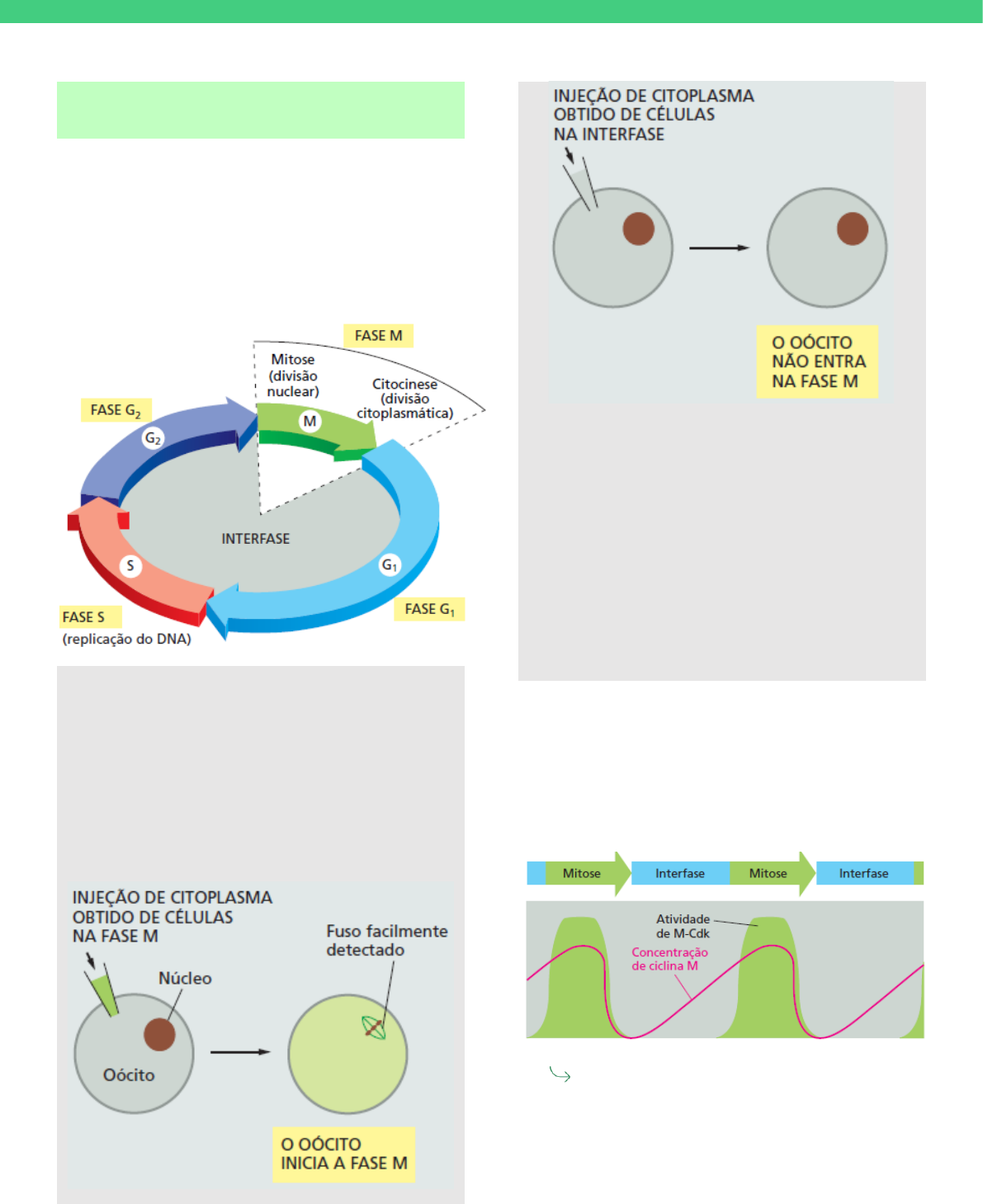 Ciclo celular Introdução O ciclo celular está presente em quase todos os tipos celulares e tem duas fases; uma chamada de M, que é de divisão, e uma chamada de Intérfase, em que a célula não está se dividindo. A Intérfase, por sua vez, é dividida em três períodos: G1, S e G2. Um óvulo maduro de Xenopus fornece um sistema conveniente para estudar o ciclo celular. A atividade de MPF foi descoberta pela injeção de citoplasma de óvulos de Xenopus em oócitos de Xenopus. Um oócito de Xenopus é injetado com o citoplasma coletado de um óvulo de Xenopus na fase M. O extrato celular promove a transição do oócito para a fase M da primeira divisão meiótica (um processo chamado de maturação), causando a degradação do grande núcleo e a formação de um fuso. Quando o citoplasma injetado é coletado de um óvulo em clivagem na interfase, o oócito não entra na fase M. Portanto, o extrato em deve conter alguma atividade – um fator promotor da maturação (MPF) – que promova o início da fase M. Fazendo o isolamento de proteínas, foi possível analisar o comportamento de proteínas que possuíam uma alta concentração durante a fase M e uma baixa concentração durante a intérfase no ciclo celular do Xenopus. Foi possível descobrir quais proteínas tinham esse comportamento. Uma das proteínas encontradas foi a ciclina M. Sua concentração aumentava no período da intérfase, atingindo seu máximo na fase M e caia abruptamente no início da intérfase seguinte. Há também o aumento do fator promotor de fase M (MPF) na mitose e sua queda abrupta no final da mitose e início da intérfase. Ciclina-Cdk A ciclina é uma proteína que fica ligada a uma kinase, formando um complexo ciclina-Cdk A interação entre a ciclina e a kinase (Cdk), ativando o fator promotor de fase M (MPF) ocorre da seguinte maneira: Combinando a Cdk mitótica com a kinase ciclina M, é produzido uma M-Cdk inativa, que possui uma fosfatase inibidora. Existem duas kinases envolvidas nesse processo; uma kinase de ativação, que adiciona um fosfato de ativação, e uma kinase de inibição, que adiciona um fosfato inibitório. Enquanto se tem um complexo fosforilado com dois fosfatos, um inibitório e outro de ativação, esse complexo M-Cdk continua inativo, e se injetado na célula, não provoca divisão celular. É necessário que se perca o fosfato inibitório para que a ativação ocorra. Quando esse complexo sofre a ação de uma fosfatase, que remove o fosfato inibitório, o M-Cdk se torna ativo. Adicionando-se um complexo M-Cdk ativo em uma célula, ela entra em divisão. Quando o complexo inativo recebe a ação de uma fosfatase, se tornando ativo, ocorre um processo de retroalimentação positiva: o MPF ativo acelera a ação da fosfatase, fazendo com que mais MPF inativos se tornem ativos – reação em cascata. Na verdade, existem dois complexos ciclina-Cdk atuantes em diferentes estágios do ciclo celular: o cliclina-Cdk de fase M e o ciclina-Cdk de fase S. O complexo ciclina-Cdk faz a célula sair de G1 e entrar em S. No ciclo celular, os Cdks são regulados pela degradação das ciclinas.. No período G1, são combinados os Cdk de fase S com as ciclinas de fase S; esses complexos (ciclina-Cdk S) são ativados e se inicia a fase S. Assim que a célula inicia a fase S, a ciclina de fase S é degradada. No fim da fase S e começo da fase G2 um Cdk de fase M e uma ciclina de fase M. Quando esse complexo (ciclina- Cdk M) é ativado, a célula entra em divisão. Logo depois, ele é degradado. Assim, existem moléculas que controlam esse mecanismo por meio de pontos de checagem: Ponto de checagem G1: 1. A célula está grande o suficiente? 2. O ambiente em que a célula está é favorável? 3. O seu DNA está íntegro? Ponto de checagem G2: 1. Todo DNA foi replicado? 2. A célula está grande o suficiente? A célula checa se o DNA está danificado por meio de uma proteína p53, que é feita o tempo inteiro e permanece inativa no núcleo. Lesões no DNA fazem com que essa proteína seja ativada. Essa p53 ativa liga-se à região reguladora do gene p21.. Ocorre, assim, a transcrição de um RNAm p21 que é traduzido em uma proteína p21 (inibidora de Cdk) que se liga ao complexo ciclina-Cdk de fase S, inativando-o. Assim, o complexo Cdk S não funciona. Logo, a célula não sai do G1 e não entra em S. No momento em que as lesões no DNA são recuperadas, todo esse processo para de acontecer, fazendo com que fiquemos apenas com as Cdks S ativas. Dessa forma, a célula pode passar da fase G1 para a fase S, com posterior divisão dessa célula. A célula toma a decisão de entrar ou não no ciclo celular a partir do fim do período G1. Ela pode avançar para o período S, duplicando seu DNA para sofrer divisão, ou pode parar em Go, ficando em repouso. Nesse último caso, há uma ligação permanente entre a proteína p21 e o complexo ciclina-Cdk S, bloqueando o avanço para a fase S. Célula em proliferação Uma célula sabe que precisa dividir para crescimento do organismo. Uma célula em repouso possui um receptor de fator de crescimento inativo na membrana. No núcleo, há um regulador de transcrição inativado pela proteína Rb ativada. Com o recebimento de um fator de crescimento mitógeno, que pode ser um hormônio, pelo receptor de membrana, ele ativa o complexo ciclina-Cdk por via de sinalização intracelular. O complexo ciclina-Cdk fosforila a proteína Rb, tornando-a inativada. Uma vez que ela é inativada, ela se desliga do regulador de transcrição, ativando-o. Assim, essa proteína regula vários genes que entram em processo de transcrição, tradução e, posteriormente, a proliferação celular ocorre. Fatores de crescimento Fator Efeito característico Fator de crescimento derivado de plaquetas (PDGF) Estimula proliferação de células do tecido conjuntivo Fator de crescimento epidérmico (EGF) Estimula proliferação das células da pele Fator de crescimento de fibrob