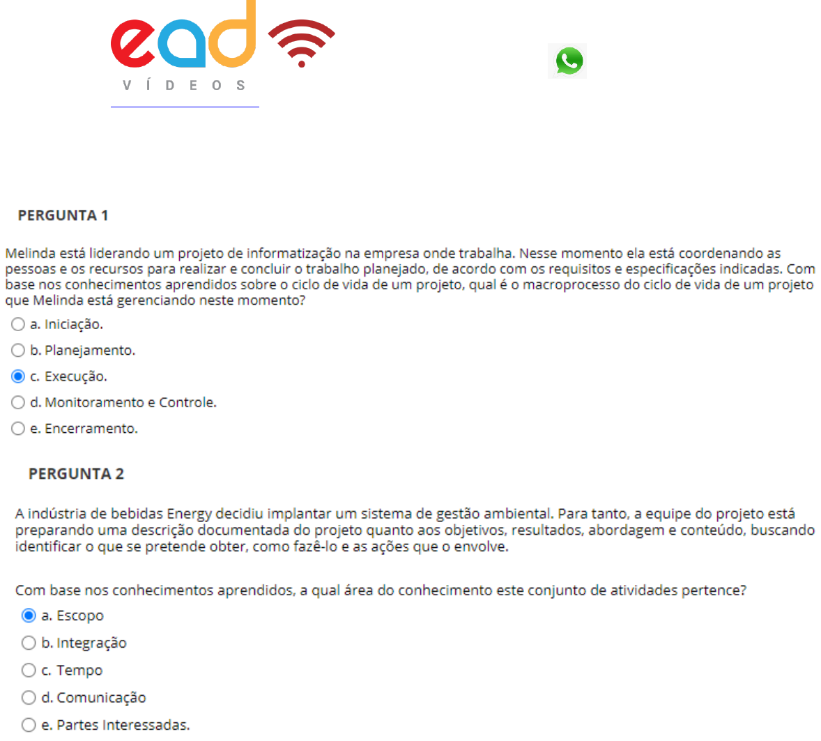www.eadvideos.com.br Gestão de Projetos Semana 3 ACOMPANHAMENTO PERSONALIZADO PARA UNIVESP 11 95797-4327 http://www.eadvideos.com.br/ www.eadvideos.com.br Gestão de Projetos Semana 3 ACOMPANHAMENTO PERSONALIZADO PARA UNIVESP 11 95797-4327 http://www.eadvideos.com.br/ www.eadvideos.com.br Gestão de Projetos Semana 3 ACOMPANHAMENTO PERSONALIZADO PARA UNIVESP 11 95797-4327 http://www.eadvideos.com.br/ www.eadvideos.com.br Gestão de Projetos Semana 3 ACOMPANHAMENTO PERSONALIZADO PARA UNIVESP 11 95797-4327 JUSTIFICATIVAS DAS RESPOSTAS Questão 1, 3 e 4: Fases projeto: começo, meio e fim As fases de gerenciamento de projetos são cinco: iniciação, planejamento, execução, controle e monitoramento e encerramento. Iniciação No ciclo de vida de um projeto tudo começa com fase de Iniciação, seja durante a primeira fase do projeto de uma usina ou um projeto para elaboração de um novo software de serviço. Entre as fases do projeto, essa é a hora de identificar as necessidades, a definição dos objetivos, estudos de viabilidade, buscas de alternativas, identificação de riscos, premissas e restrições, bem como autorização e definição das gerências do projeto. http://www.eadvideos.com.br/ www.eadvideos.com.br Gestão de Projetos Semana 3 ACOMPANHAMENTO PERSONALIZADO PARA UNIVESP 11 95797-4327 Nos momentos dessas iniciais etapas de projeto é que o gerente do projeto faz diversas reuniões com a diretoria para convencê-la da viabilidade e importância do projeto para aquela organização e só então recebe a devida aprovação, embora possa-se dizer que o projeto já estava em sua fase embrionária. E aí começa de fato o ciclo de vida projeto. Durante a primeira fase do projeto, é preciso estruturar o projeto com o Termo de Abertura, que é o documento que vai dar o start do projeto, e o Business Case. Planejamento Nas fases de projeto, o momento do planejamento é de suma importância, e pode determinar todo o sucesso daquele projeto. Realizada uma revisão do orçamento do projeto, é criada a EAP (Estrutura Analítica do Projeto) ou WBS (Work Breakdown Structure), detalha-se o escopo do projeto e as atividades que serão necessárias. Nesta hora também acontece o refinamento dos objetivos, com sequenciamento de atividades, negociações de apoio a patrocínio. Neste momento também será criado o cronograma de projeto e busca dos recursos necessários, tanto de custos quanto os humanos. É hora de detalhar todos os processos: escopo, tempo, custos, qualidade, recursos humanos, plano de gerenciamento de http://www.eadvideos.com.br/ https://robsoncamargo.com.br/blog/Cronograma-de-projeto-passo-a-passo-para-fazer-um www.eadvideos.com.br Gestão de Projetos Semana 3 ACOMPANHAMENTO PERSONALIZADO PARA UNIVESP 11 95797-4327 comunicação, riscos, aquisições e stakeholders (pessoas interessadas no projeto). Finalmente, pode-se dar início à elaboração do plano de projeto. Após isso, é realizada a reunião de kick off, quando tudo o que foi definido e planejado vai ser exposto para um time muito maior, que será interessado e envolvido neste trabalho. Execução do projeto É quando tudo que foi planejado poderá ser executado, quando os entregáveis são elaboradas e apresentadas aos clientes. Nesta fase, é possível até mesmo usar ferramentas de gestão de projetos para controle do escopo, cronograma, uso de materiais, qualidade, riscos, alterações do projeto etc. Monitoramento e controle Nas fases de projeto pelo PMBOK®, essa etapa é paralela com a execução do projeto, e muitos nem a listam como uma das fases de um projeto, atrelando-a ao momento da execução. Mas aqui vamos considerá-la como mais uma fase, conforme indicado o guia das melhores práticas do gerenciamento de projetos. É neste momento que é a feita a verificação da execução para saber se tudo que foi planejado está sendo devidamente executado, se houve discrepâncias e se é preciso replanejar. Esse momento de incrementos ao escopo pode ser crítico e causar atrasos no cronograma, por isso, o monitoramento e controle assíduo é tão importante, para corrigir os desvios de percurso no devido tempo. http://www.eadvideos.com.br/ https://robsoncamargo.com.br/blog/Ferramentas-de-gestao-de-projetos-as-7-melhores www.eadvideos.com.br Gestão de Projetos Semana 3 ACOMPANHAMENTO PERSONALIZADO PARA UNIVESP 11 95797-4327 Para isso, o Status Report constante é essencial, porque provavelmente neste momento os stakeholders vão querer saber como as coisas estão andando. Também é nesta hora que começam as reuniões constantes entre as equipes, preferencialmente com frequência semanal e atualizações diárias. Nestes encontros, todas as informações, potenciais obstáculos e o andamento geral do projeto precisam ser comunicados. Em qualquer tipo de projeto, neste momento também pode surgir a necessidade de gerenciamento de problemas, seja quando se chegar nestas fases de um projeto de pesquisa ou até mesmo nestas fases de projeto de software. Aqui pode-se detectar falhas na definição do escopo, prazos apertadíssimos e às vezes até inviáveis, recursos que não foram bem administrados, problemas com a qualidade do produto final e até mesmo de gestão de pessoas. Por isso, faço questão de reforçar o momento de aproveitar a fase do planejamento, que é a hora de usar de Inteligência Coletiva para detectar todos os possíveis equívocos. Para isso, uma reunião de 8 horas com o método do Canvas do PM Visual, que é um modelo que criei, pode ser uma excelente alternativa. No meu modelo de Canvas, todas as áreas do projeto serão esmiuçados pela equipe que estará envolvida com o projeto. http://www.eadvideos.com.br/ www.eadvideos.com.br Gestão de Projetos Semana 3 ACOMPANHAMENTO PERSONALIZADO PARA UNIVESP 11 95797-4327 Quem quer saber mais sobre o assunto, se informe sobre o curso RC Robson Camargo Projetos & Negócios que ensina como utilizar o PM Visual. Encerramento Esse é o mo