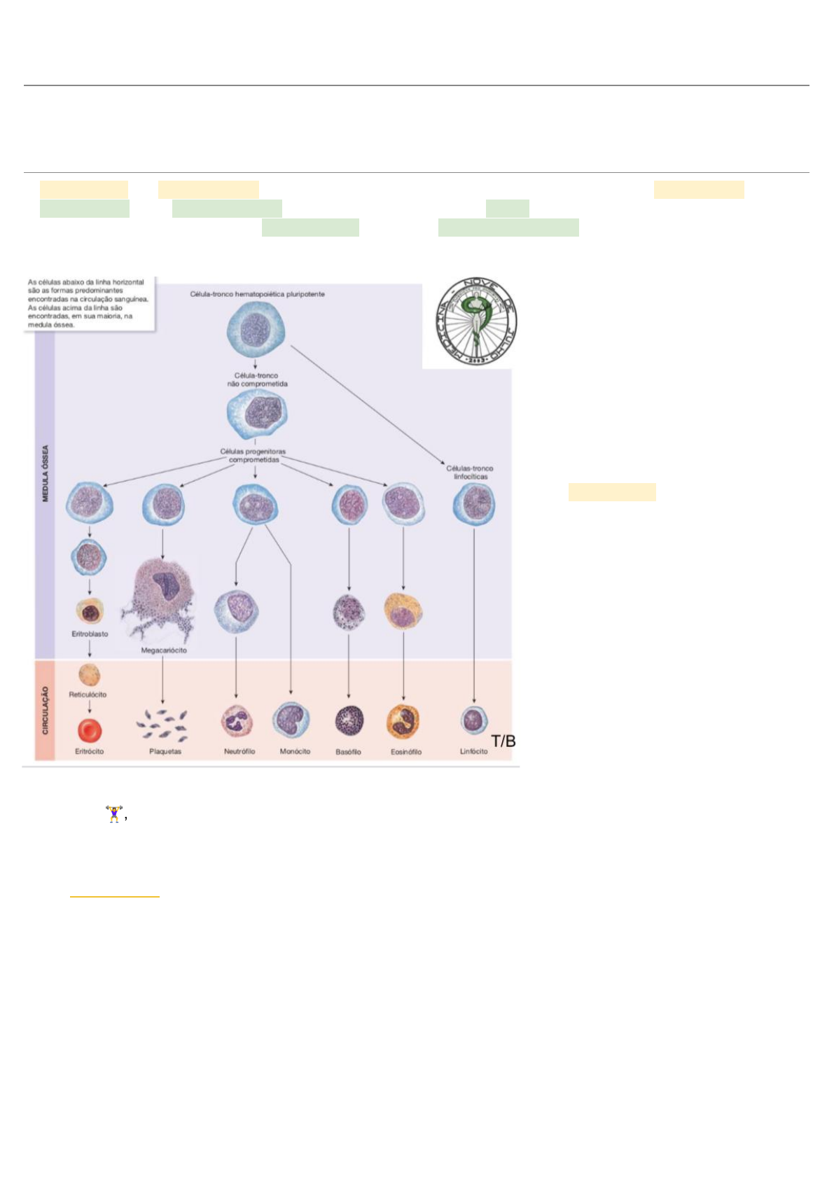 Sã� Paul�, 04 d� març� d� 2020 Hemogram� ✤ Diagnóstico é o resultado atual de uma avaliação no momento presente. É o que se tem no momento. ✤ Prognóstico é um resultado prévio, algo que pode acontecer no futuro. O prognóstico é obtido a partir de interpretações feitas com base no diagnóstico. Primeira célula: célula tronco ou pluripotente (pode se transformar em qualquer célula). Respostas a infecções: leucócitos Resposta a sangramentos: plaquetas Ex.: plaquetas baixas, como diabetes, problema no processo de coagulação. Diabético e/ou deficiência na coagulação. Sempre pedir hemograma completo! O processo de diferenciação, chamamos de Hematopoiese. ✤ O hemograma divide-se em: 1. Eritrograma (série vermelha, hemácias); 2. Leucograma (série branca, leucócitos); Infecção 3. Plaquetograma (plaquetas). A partir da célula tronco temos dois tipos de divisões: - Linfocitário: originam linfócitos T e linfócitos B - Mieloide: leucócitos, plaquetas (quando nao madura a plaqueta, a chamamos de megacariócito), o resto das células. Baço, aumenta de tamanho, aumenta a quebra de hemácias. Durante um , a respiração alterada (aumentada), provocará esse desconforto. Os rins produzem e liberam eritropoetina que estimula a medula óssea, hematopoiese (maturação). 1. Eritrograma - Hematócrito é o percentual do sangue que é ocupado pelas hemácia. Hematócrito de 45% = 45% de sangue é composto por hemácias. - Hemoglobina, carrega hemácia com o oxigênio e também carrega ferro. - VCM: volume corpuscular média VR VCM: 80 à 100, indicam que as hemácias estão dentro do tamanho normal. No entanto, se o número de glóbulos vermelhos estiver reduzido o que significa? Anemia normocítica. ✤ Três formas de avaliar as hemácias: Volume: sufixo - cítico. Quantidade: quando diminuída anemia. Victóri� Naceib� Fare� T4 - 3° semestr� 1 Cromia (coloração): sufixo - cromia. 2. Leucograma - Analisa os leucócitos (série branca): A. Neutrófilo - bactérias 🧫 B. Eosinófilo - alergia e parasita C. Basófilo - alergia e inflamação crônica D. Linfócito - vírus 🦠 E. Monócito - vírus 🦠 e bactéria 🧫 F. Macrófago - bactérias 🧫. 3. Plaquetas - Processo de coagulação VR: 150.000 a 450.000 (uL) Plaquetas > VR: Trombo Plaquetas < VR: Hemorragia O hemograma pode nos fornecer um subsídio ao diagnóstico, classificação e monitoramentos de várias patologias: Doenças infecciosas, crônicas, emergências clínicas e cirúrgicas, acompanhamento de quimio e radioterapia. O hemograma avalia de forma quantitativa e morfológica (qualitativa dos elementos) os elementos figurados do sangue (biópsia do sangue). Reflete: - Função medular / hematopoese - Integridade dos sistemas envolvidos na sobrevida das células hematológicas na circulação Hemograma completo - contagem diferencial dos linfócitos ✤ Aspectos práticos: - Coleta: tubo com EDTA. Jejum não é necessário. Evitar 2h após refeições fartas ou gordurosas; - Variações biológicas: início da manhã; após exercício e stress fisiológico; - Coleta em membro com infusões EV; - Em situações de desidratação, perda volêmica aguda ou perda plasmática, o eritrograma, mesmo correto, não reflete a realidade. ✤ Nomenclatura - Sufixos: -penia = baixo -filia = alto ou aumentado -citose = tamanho e forma -cromia = coloração Caso clínico R.B fez hemograma conforme solicitado pelo médico; R.B tem cirrose, deficiência de B12 e ascite com infecção bacteriana. Após exame foi solicitada a internação imediatamente: → Hemograma - I Série vermelha: diminuída - Anemia 🩸 Série branca: aumento de linfócitos - Vírus 🦠 Plaquetas: normal → Hemograma - II Deficiência de B12, cirrose; Leucócitos - infecção; Neutrófilos - infecção bacteriana; Plaquetas - abaixo do normal; Presença de células imaturas: bastonetes e segmentados Hipótese de diagnóstico: HIV ou câncer, como leucemia. Victóri� Naceib� Fare� T4 - 3° semestr� 2