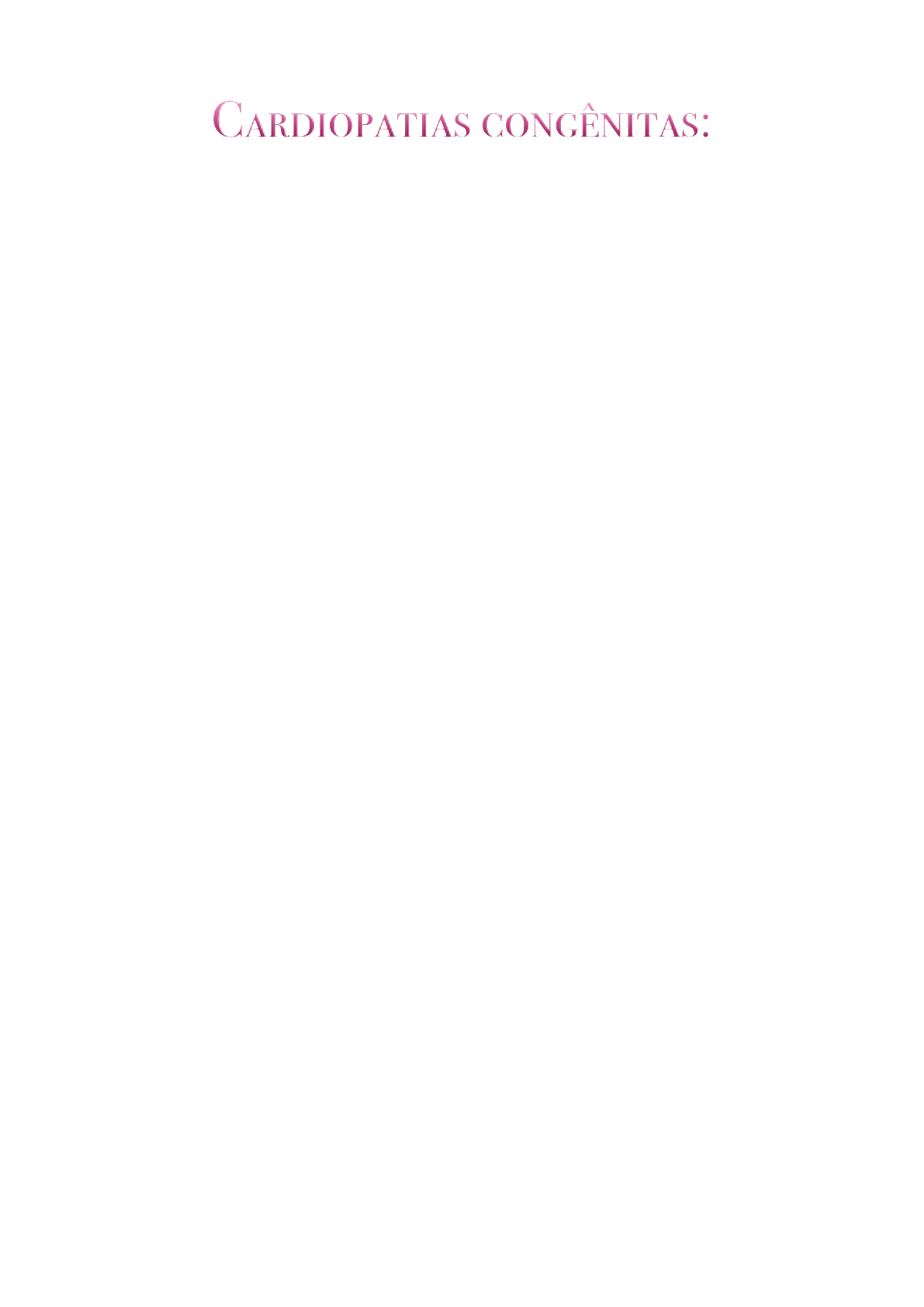 Cardiopatias congênitas: • Cardiopatia Congênita é qualquer Anormalidade na Estrutura ou Função do Coração que Surge nas Primeiras Oito Semanas de Gestação Quando se Forma o Coração do bebê. Podendo ser anormalidades funcionais ou estruturais do sistema cardiovascular. • Ocorre por uma Alteração no Desenvolvimento Embrionário da Estrutura Cardíaca, Mesmo que Descoberto no Nascimento ou Anos Mais Tarde. Período em que se dá a má formação. Epidemiologia: • 28 mil Crianças com Problemas Cardíacos por Ano • 1 de Cada 1000 Bebês Nascidos Vivos • Dessas 80% Necessitarão de Cirurgia Durante a Vida Embriologia: • SistemaCardiovascular >1oSistema a se organizar e termina seu desenvolvimento a partir a 8 semana de gestação. • Circulação Sanguínea > 3 Semanas • Desenvolvimento Cardíaco > 3 - 8 Semanas tubo neural • Anomalias > 3 - 6 semanas nesse período em que haverá problemas que originaram as cardiopatias congênitas. Sintomas: • Cardiopatias Congênitas Podem Produzir Sintomas • Nascimento • Durante Infância • Só Na Idade Adulta • Em Alguns Casos Não Causa Sintomas • Na maioria das vezes ao nascimento ou durante a infância Classificação: - ACIANOGENICAS (CIA, CIV, PCA e CoAo (única que nao causa hiperfluxo pulmonar); hiperfluxo pulmonar nas restantes; não produzem cianose • Nem Sempre Provocam Repercussões Tão Graves no Funcionamento Cardíaco • Sintomas Dependem da Gravidade do Defeito Cardíaco • Ausência De Sintoma • Sintomas Somente Durante Esforços • (Insuficiência Cardíaca) • Mais prevalentes • Não há risco eminente de morte - CIANOGENICAS (T4F e TGA); hipofluxo pulmonar na T4F e hiperfluxo na TGA; produzem cianose • Normalmente Mais Grave • Defeito no Coração Pode Afetar • Fluxo Sanguíneo e Oxigenação do Sangue • Capacidade de oxigenação do sangue • A Depender da Gravidade, Pode Provocar Palidez / Cianose • Insuficiência Cardíaca • Desmaios, Convulsões e Morte ACIANOGENICAS: Na Comunicação Interatrial Ocorre uma Comunicação Anormal Entre os Átrios Cardíacos, Que São as Câmaras Mais Superiores. Nem sempre provocam alterações, muitas vezes São discretas. • Acomete 1 a Cada 800 Nascidos Vivos • Mais Frequente em Mulheres • Cardiopatiaa Congênita + Comum em Adultos • 10 – 15% das Cardiopatias Congênitas ü • 1o Lesão Cardíaca Tratada c/ CEC - CIA: hiperfluxo pulmonar COMUNICAÇÃO INTERATRIAL • “Ostium Secundun” • Também Chamada de Tipo Forame Oval • Mais Frequente • Corresponde a Cerca de 60-70% • Diferença Entre CIA e Forme Oval Patente • Cia: Há Falha na fossa oval > orificio • FOP: Duas lâminas que normalmente se sobrepoem na fossa oval fechando este local terminam permitindo o fluxo de sangue entre os átrios • “Ostium Primum” T • Também Denominado Defeito do Septo Atrioventricular • Corresponde a Cerca de 20-30% • Defeitos Tipo Seio Venoso: Infrequentes - Cerca de 5% das CIA Podem Estar Abaixo da Veia Cava; Superior, Imediatamente Abaixo da Junção da VCS e Átrio Direito; Acompanhada de Drenagem Anômala Parcial Veia Pulmonar Superior Direita e na Veia Cava Inferior, Abaixo do Forame Oval. • Defeitos Tipo Seio Coronario: Ao Nível do Seio Coronário; Menos Frequente; Corresponde a Cerca de 3% das CIA; • Fisiopatologia: Os Dois Átrios se Comunicam; O Lado Direito do Coração (Responsável Por Receber Sangue do Corpo e Mandá- lo Para Ser Oxigenado no Pulmão) Recebe Também Sangue Já Oxigenado do Lado Esquerdo; Os Dois Sangues se Misturam do Lado Direito do Coração; Lado Direito Trabalha Até 4 Vezes Mais que o Esquerdo; A Consequência Disso é Evidente; Com o Tempo, As Cavidades e as Pressões do Lado Direito Aumentam; O Fluxo se Inverte; Insuficiência Cardíaca; Cianose. • Sintomas: Pessoa Vive Anos Assintomática; Doença Evolui Lentamente; Na Infância / Adolescência, Pode Haver Discreta Limitação Física; Na Fase Mais Avançada (Adulto); Cansaço (ICC Direita) / Palpitações; Arritmia Cardíaca / Sopro / Embolia. • Diagnóstico: Ocasional Exames de Rotina; Exames Imagem; RX Torax; Ecocardiograma. • Tratamento: O Objetivo do Tratamento e Interromper a Comunicação Entre os Dois Átrios, Fechando o orifício que Permite a Mistura do Sangue dos Dois Lados do Coração e Sobrecarrega Lado Direito. Podendo o tratamento ser cirúrgico e percutâneo. - CIV: hiperfluxo pulmonar COMUNICAÇÃO INTERVENTRICULAR • Na Comunicação Interventricular Ocorre uma Comunicação Anormal Entre os Ventrículos Cardíacos, Que São as Câmaras Mais Inferiores. • Cardiopatia Congênita + Frequente; 1/1000 Nascidos Vivos; 25% das Cardiopatas Congênitas; 50% Tem Lesões Associadas; PCA; Eao; CoAo. • Perimembranosa 80% • Muscular 5% • Via de Entrada 5% • Subarterial Duplamente Relacionada 10% • Fisiopatologia: Os Dois Ventriculos se Comunicam; Sangues se Misturam do Lado Direito do Coração; Com o Tempo, as Cavidades e as Pressões do Lado Direito Aumentam; O Fluxo se Inverte; Insuficiência Cardíaca; Cianose. • Sintomas: HISTÓRIA NATURAL; Fechamento Espontâneo; Aumento Precocedas Pressões Pulmonares; Endocardite Infecciosa é Rara; Mortalidade de 9% no 1o Ano de Vida. • Diagnóstico: Diagnóstico Direcionado; Sinais e Sintomas Precoces; Exames Imagem; Ecocardiograma. • Tratamento: O Objetivo do Tratamento e Interromper a Comunicação Entre os Dois Ventrículos, Fechando o orifício que Permite a Mistura do Sangue dos Dois Lados do Coração e Sobrecarrega Lado Direito; Cirúrgico - CIV Grandes - Sintomas Precoces / Intensos; Percutâneo - CIV Pequenas - Sintomas Controláveis Clinicamente; CIV Pequenas - Sem Fechamento Espontâneo - CIV Musculares - Sintomas Controláveis Clinicamente; - PCA: hiperfluxo pulmonar PERSISTENCIA DO CANAL ARTERIAL • Persistência do Canal Arterial em um Coração Estruturalmente Normal (Criança Nascida a Termo), Após o 3o Mês de Vida é Anormal. 