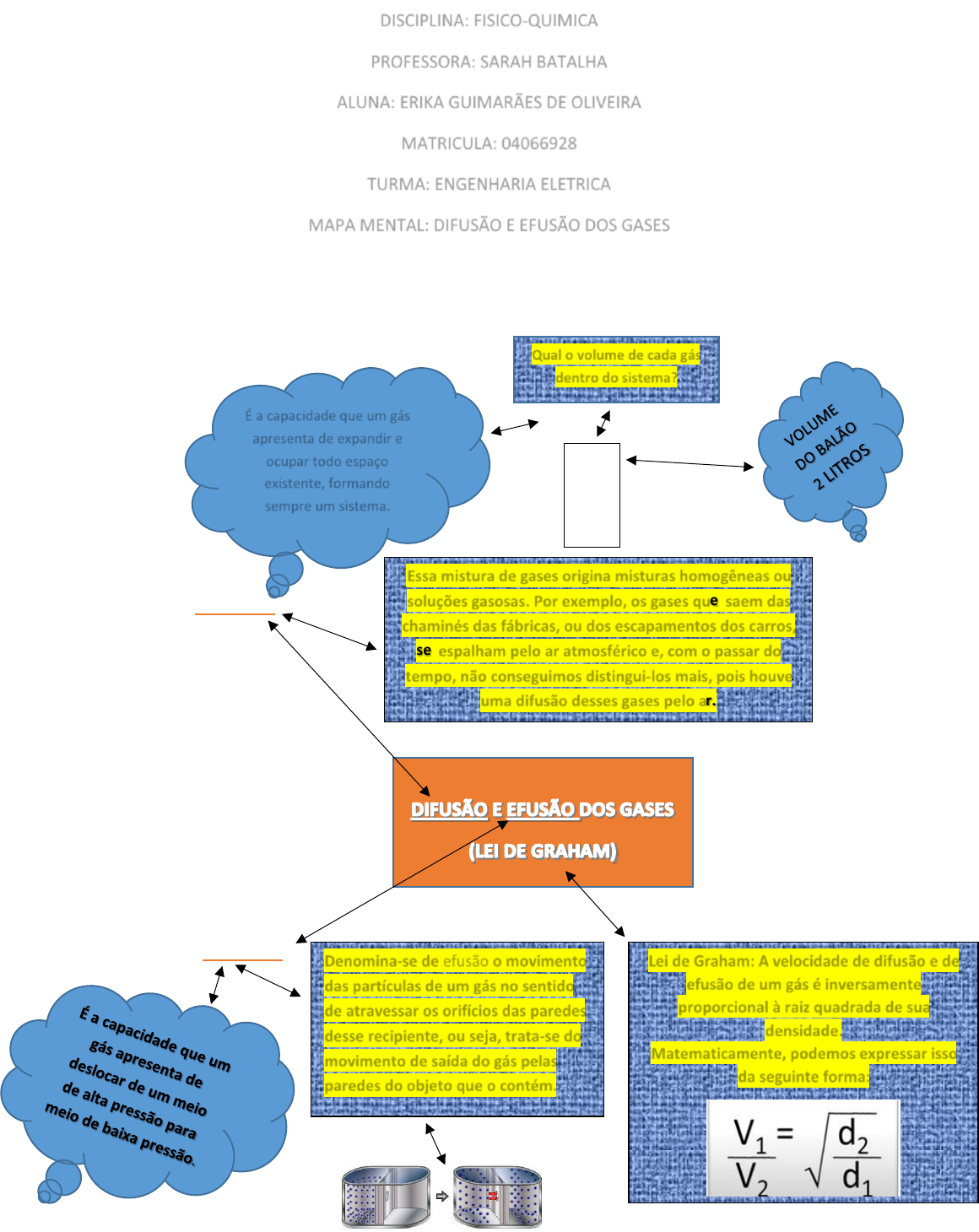 DISCIPLINA: FISICO-QUIMICA PROFESSORA: SARAH BATALHA ALUNA: ERIKA GUIMARÃES DE OLIVEIRA MATRICULA: 04066928 TURMA: ENGENHARIA ELETRICA MAPA MENTAL: DIFUSÃO E EFUSÃO DOS GASES 1- CONCEITO 2 – CONCEITO Qual o volume de cada gás dentro do sistema? É a capacidade que um gás apresenta de expandir e ocupar todo espaço existente, formando sempre um sistema. H2 02 SO2 Essa mistura de gases origina misturas homogêneas ou soluções gasosas. Por exemplo, os gases que saem das chaminés das fábricas, ou dos escapamentos dos carros, se espalham pelo ar atmosférico e, com o passar do tempo, não conseguimos distingui-los mais, pois houve uma difusão desses gases pelo ar. Lei de Graham: A velocidade de difusão e de efusão de um gás é inversamente proporcional à raiz quadrada de sua densidade. Matematicamente, podemos expressar isso da seguinte forma: Denomina-se de efusão o movimento das partículas de um gás no sentido de atravessar os orifícios das paredes desse recipiente, ou seja, trata-se do movimento de saída do gás pelas paredes do objeto que o contém.