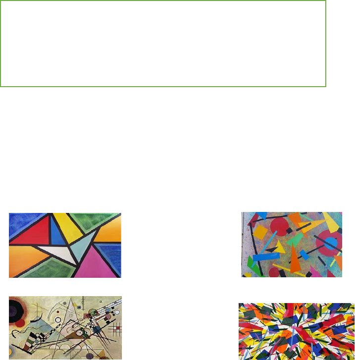 TD DE ARTES: 23/04 ALUNO(A): _______________________________________________ 1) As características que representam o movimento abstracionista são: ( ) Pinturas ( ) Objetos 2) Desenhe e pinte uma obra que caracteriza a alegria. 3) Relacione as figuras de acordo com suas características: (1) Decomposição da figura. (2) Formas irregulares. (3) Formas geométricas. (4) Novo uso da cor em planos, linhas e pontos. ( ) ( ) ( ) ( ) 4) A arte expressa: ( ) Libertação do artista ( ) Os dramas humanos. ( ) Formas irregulares. ( ) Nas pinturas. 5) O Surrealismo se baseavam: ( ) Nos sonhos. ( ) Nos quadros. ( ) Na realidade. ( ) Nas pinturas. 6) Defina o cubismo. 7) Quais são as fases das obras de Pablo Picasso. ( ) Azul e verde. ( ) Rosa e vermelha. ( ) Azul e branco. ( ) Azul e rosa.