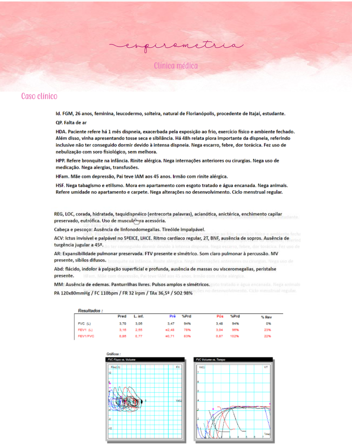 B r u n a A l t v a t e r S a t u r n i n o - P á g i n a | 1 Aula 03 (08/09/20) – Renata Viana B r u n a A l t v a t e r S a t u r n i n o - P á g i n a | 2 ESPIROMETRIA – PROVA DE FUNÇÃO PULMONAR Criança coloca o oclusor nasal na boca e pedimos para ela puxar o ar e soprar o mais rápido possível. É uma expiração única. Ela enche o peito de ar e sopra até não aguentar mais, e um examinador fica ao lado. Tudo que o paciente inspira vem negativo. E acima da curva (positivo) é expiração. No inicio o fluxo é muito menor, depois vai saindo um fluxo menor. PARAMETROS O paciente com o volume corrente normal, ele enche o peito de ar e começa a expirar. No primeiro segundo sai o volume expiratório forçado, depois em três segundos o VEF3 e CVF é quando ele não tem mais ar para sair e começa a inspirar novamente. VEF1: volume expiratório forçado. CVF: capacidade vital forçada. É preciso que o paciente faça 3 manobras parecidas. É preciso que o paciente expire pelo menos 6 segundos para o paciente atingir um platô. Se for menos, pode diminuir a capacidade vital forçada (tudo que saiu). • Capacidade vital forçada (FVC): é tudo que saiu durante a expiração. • Volume expiratório forçado1 (FEV1): é tudo que saiu durante o primeiro segundo. • FEV1/FVC: tudo que saiu, quantos porcento saiu no primeiro segundo. • PEFR • FEF 25-75%: o fluxo entre 25 e 75. • FEF 50% • FEF 75% Pesamos o paciente, vemos idade, sexo, medimos e assim, pegamos no software uma pessoa com as mesmas características. E analisamos o que é previsto para o paciente e o limite inferior. Depois que o paciente fez a três curvas pré-broncodilatador, vou escolher qual foi a melhor e coloco no tabela. Quantidade de ar que sai no 1º segundo durante uma expiração forçada, em relação ao total de ar inspirado após a expiração forçada. • VF1/CVF > ou = 0,8 • <0,8: obstrução; Se o paciente tem uma luz do brônquio normal, a ideia é que de tudo que sai, 80% saia no primeiro segundo. Se esse paciente estiver obstruído: B r u n a A l t v a t e r S a t u r n i n o - P á g i n a | 3 Em 1 segundo não sai 80% porque a luz do brônquio está menor. CASO 1 Qual o diagnóstico ventilatório evidenciado pela espirometria? R: nenhum. Espirometria normal. A relação FEV1/CVF está com o valor esperado. Normal: quando começa a inspirar sai um volume maior de ar, depois vai reduzindo o fluxo. Obstrução: curva menor que o normal e demora mais tempo para sair todo volume, fazendo uma concavidade. Fibrose: igual a curva normal, porém, menor. CASO 2 Tenho três curvas parecidas, e uma quarta curva maior (mais alta e maior volume). Essa quarta curva é pós-broncodilatador (salbutamol). A relação VEF1/CVF está pior que o menor valor dos normais, ou seja, tem um distúrbio obstrutivo (<0,8%) Faço 4 jatos de bombinha de broncodilatador de curta ação, geralmente Salbutamol. Espero 15 a 20 minutos para fazer de novo um sopro (geralmente é feito 3 sopros) e comparo a melhor curva pré com a melhor curva pós broncodilatador. 1. Qual o distúrbio ventilatório evidenciado pela espirometria? R: Obstrutivo. 2. Leve, moderado ou grave? R: Leve. VEF1 84% do que previa. 3. Houve resposta broncodilatadora? R: Sim. 4. Quais patologias podem cursar com esse resultado? R: Asma. • DPOC • Asma B r u n a A l t v a t e r S a t u r n i n o - P á g i n a | 4 A: pneumonia; septos normais, mas com secreção, então o paciente tem uma obstrução por presença de secreção. B: asma; septos normais, sem secreção, edema, luz de brônquio menor, epitélio inflamado, músculo contraído (diminuindo o lúmen). C: DOPC (enfisema); destruição dos septos e os brônquios colabam, formando buracos onde o ar fica aprisionado circulando e não consegue sair, ficando com o tórax em tonel. Os três pacientes vão ter uma relação VEF1/CVF <0,8. Quanto teve de melhora na curva pós em relação a curva pré. É necessário aumentar 200mL em FEV1 e 7%. Se houver só um dos dois, não é caracterizado como resposta. • Avaliar se há hiper-reatividade brônquica; • Na DPOC não tenho esse ganho de função pulmonar, ainda que melhore com a bombinha. CASO 3 1. Qual o distúrbio ventilatório evidenciado pela espirometria? R: Obstrutivo; 2. Leve, moderado ou grave? R: Leve; 3. Houve resposta broncodilatadora? R: Não. Nem acima de 200mL, nem 7%. CASO 4 1. Qual o distúrbio ventilatório evidenciado pela espirometria? R: Obstrutivo; 2. Leve, moderado ou grave? B r u n a A l t v a t e r S a t u r n i n o - P á g i n a | 5 R: Grave. 35% FEV1 (<40%) 3. Houve resposta broncodilatadora? R: Não, porque não ganhou 200ml. É um paciente DPOC com um componente asmático. Respondeu ao broncodilatador em termos de tratamento. Fazemos uso de corticoide porque tem condição de melhorar mais. Quando o paciente está muito obstruído, mesmo depois de ficar 10 segundos expirando, não consegue esvaziar todo o ar que tem dentro do pulmão. Então como saber se a CVF está reduzida por estar obstruída demais ou por ter algo além (restritivo)? Quando a diferença do porcentual previsto de CVF e FEV1 for maior que 12, possivelmente está reduzida por conta da obstrução importante, nesse caso é 53-35=18. CASO 5 1. Qual o distúrbio ventilatório evidenciado pela espirometria? R: Restritivo; 2. Quais patologias podem cursar com esse resultado? Não tem obstrução, então não é olhado a gravidade, apenas o tamanho do pulmão (CVF). Era esperado que ele eliminasse 4,04mL, porém, eliminou 2,7mL. Tem menos capacidade que o esperado, então é um pulmão menor, tem 68% do esperado. A fibrose faz com que o pulmão fique pequeno. Estimativa do volume pulmonar Não é fidedigno porque a espirometria não consegue medir o volume residual. Quando o paciente faz o sopro, não colabo o pulmão retirando todo o ar, fica o volume residual que não é possível quantificar. Para medicar o volume residual é necessário fazer u