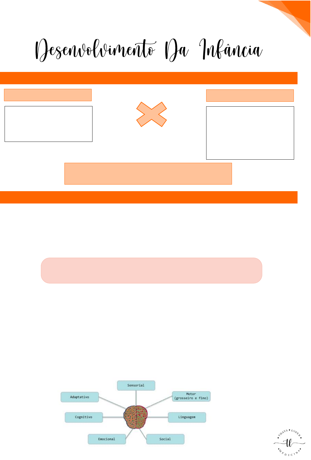 SAÚDE DA CRIANÇA E DA MULHER PEDIATRIA MEDICINA – 5º SEMESTRE – THAYS LOPES 1 CRESCIMENTO X DESENVOLVIMENTO: DESENVOLVIMENTO: • O ser humano adquire várias habilidades motoras que progridem de movimentos simples e desorganizados para habilidades motoras altamente organizada e complexas. • Implica a diferenciação de células e tecido, a complexidade crescente de estrutura e a aquisição de novas capacidades mediante com processo de maturação • Mudanças nas estruturas físicas e neurológicas, cognitivas e comportamentais que emergem de maneira ordenada e são relativamente duradouras • O sucesso do desenvolvimento depende da integridade dos vários órgãos e sistemas, principalmente o sistema nervoso. • Tecido nervoso cresce e amadurece sobretudo nos primeiros anos de vida → nesse período mais vulnerável aos agravos • Diagnóstico precoce possibilita acesso a atenção adequada proporcionando melhor qualidade de vida: plasticidade neuronal • A criança responde melhor aos estímulos e intervenções nesse período (intervenção precoce). • Crescimento e Desenvolvimento ocorrem de forma mútua. • A evolução se dá em uma sequência fixa, mas em um ritmo variável. • Para transpor um marco, é necessário a aquisição de capacidades motoras, físicas. • Direção: Céfalo-caudal/ Próximo-distal • Desenvolvimento compreende alguns domínios de funções interligados CRESCIMENTO DESENVOLVIMENTO • Representa desenvolvimento físico; • É quantitativo: avaliação do peso e estatura; • Capacidade do indivíduo realizar tarefas cada vez mais complexas (novas habilidades); • Qualitativo (difícil medir de forma objetiva; Crescimento e desenvolvimento: juntos são considerados entre os melhores indicadores de saúde da criança. É processo de construção da identidade humana, resultante da interação entre as influências biológicas, a história de vida e seu contexto cultural e social. SAÚDE DA CRIANÇA E DA MULHER PEDIATRIA MEDICINA – 5º SEMESTRE – THAYS LOPES 2 • Modelo ecológico sugere que os diferentes ambientes micro e macrossociais interatuam no desenvolvimento humano AVALIAÇÃO DO DESENVOLVIMENTO: • Fundamental na atenção à saúde da criança. • Deve ser feita de forma rotineira e sistemática. • Deve ser um processo contínuo de acompanhamento capaz de detectar precocemente desvios e atrasos • Não existem limites fixos. Respeitar individualidade. • O momento da avaliação serve para estimular e ensinar: Meta: atingir o potencial da criança, Identificar precocemente crianças em risco e intervir. • Acompanhamento do desenvolvimento: Screening: testes rápidos em idades pré-estabelecidas para identificar prováveis doenças ou defeitos Vigilância do desenvolvimento: todas atividades relacionadas com a promoção do desenvolvimento e detecção de problemas (informações de profissionais de saúde, pais, professores) Avaliação do desenvolvimento: investigação mais detalhada de crianças supostamente com problemas de desenvolvimento – multidisciplinar • Fatores de risco Risco biológicos: pré-, peri- e pós-natais → Genéticos (Ex.: erro inato do metabolismo, síndrome de Down, outras síndromes genéticas) → Adquiridos (ex.: prematuridade / baixo peso ao nascer, icterícia grave, meningite, hipóxia neonatal) Riscos ambientais: experiências adversas de vida ligada à família, ao meio ambiente e à sociedade. → Condições precárias de saúde → Falta de recursos sociais e educacionais → Educação materna ou do cuidador → Estresses familiares, como violência, abuso e maus tratos → Problemas mentais da mãe ou cuidador → Alcoolismo ou drogas em casa → Consanguinidade → Falta de afeto SAÚDE DA CRIANÇA E DA MULHER PEDIATRIA MEDICINA – 5º SEMESTRE – THAYS LOPES 3 • Alerta no exame físico Perímetro cefálico: curvas OMS (normal z escore de -2 a +2) Alterações fenotípicas → Maiores ➢ Cardiopatia congênita, lábio leporino e fenda palatina → Menores ➢ Fenda palpebral obliqua, hipertelorismo, implantação baixa de orelha, pescoço curto e alado, prega palmar única, quinto dedo da mão curto e encurvado (clinodactilia), dentre outras. MARCOS DO DESENVOLVIMENTO: RECÉM-NASCIDO: • Postura e reflexos subcorticais: 0-1 MÊS: • Postura: pernas e braços fletidos, cabeça lateralizada • Observa um rosto. • Reage ao som. • Eleva a cabeça. SAÚDE DA CRIANÇA E DA MULHER PEDIATRIA MEDICINA – 5º SEMESTRE – THAYS LOPES 4 1-2 MESES: • Sorri quando estimulado. • Abre as mãos. • Emite sons. • Movimenta os membros. 2-4 MESES: • Responde ativamente ao contato social. • Segura objetos. • Emite sons, ri alto. • Levanta a cabeça e apoia-se nos antebraços, de bruços. 4-6 MESES: • Busca ativa de objetos. • Leva objetos a boca. • Localizar o som. • Muda de posição (rola) 6-9 MESES: • Brincar de esconde achou. • Transfere objeto de uma mão para outra. • Duplica sílabas. • Senta-se sem apoio. 9-12 MESES: • Imita gestos. • Faz pinça. • Produz “jargão”. • Anda com apoio. 12-15 MESES: • Mostra o que quer. • Coloca blocos na caneca. • Diz uma palavra. • Anda sem apoio. 15-18 MESES: • Usa colher ou garfo. • Constrói torre de dois cubos. • Falar 3 palavras. • Anda para trás. SAÚDE DA CRIANÇA E DA MULHER PEDIATRIA MEDICINA – 5º SEMESTRE – THAYS LOPES 5 18-24 MESES: • Tira roupa. • Constrói torre de 3 cubos. • Aponta duas figuras. • Chutar bola. TREINAMENTO ESFINCTERIANO: • A criança se conscientiza sobre sua própria necessidade de eliminar urina e fezes → “treinada” • Controle da evacuação geralmente precede o controle da micção • Não deve ser forçadas a iniciar o processo de treinamento – aguardar apresentar os sinais de prontidão • Somente uso de elogios para reforço, desencorajando recompensas materiais • Aproximadamente 2% a 3% das crianças apresentam