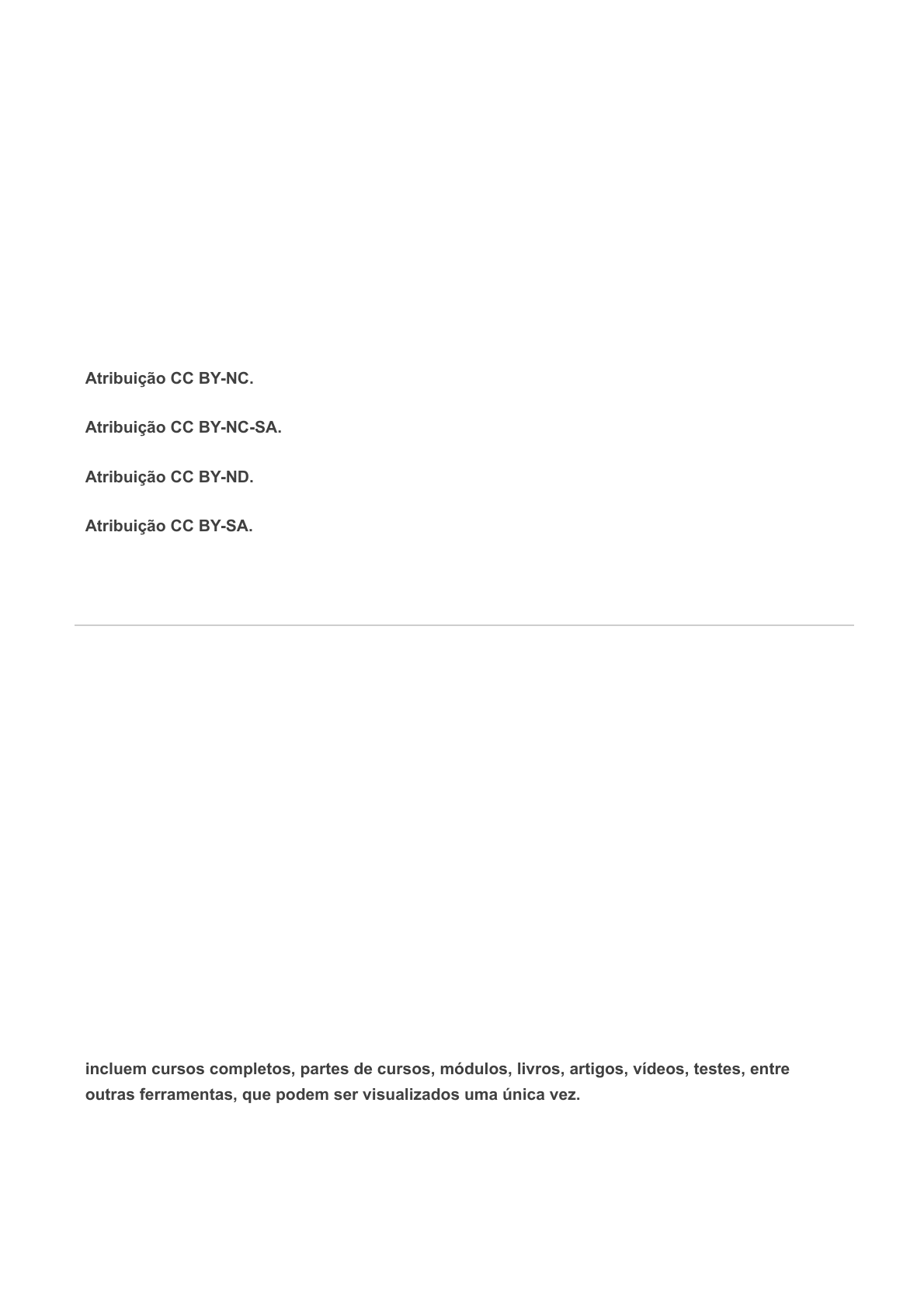 12/04/2021 Comentários https://sereduc.blackboard.com/ultra/courses/_50164_1/outline/assessment/_3421589_1/overview/attempt/_11427285_1/review/inline-feedback?… 1/8 Ocultar opções de resposta Ocultar opções de resposta Pergunta 1 -- /1 O Creative Commons permite o compartilhamento e o uso de conteúdos através de licenças jurídicas gratuitas. Ele se caracteriza por ser uma organização sem fins lucrativos. Considerando essas informações e o conteúdo estudado sobre o Creative Commons, a licença que permite que outros distribuam, remixem, adaptem e criem a partir do seu trabalho, mesmo que para fins comerciais é a: Atribuição CC BY-NC. Atribuição CC BY-NC-SA. Atribuição CC BY-ND. Atribuição CC BY-SA. Resposta corretaAtribuição CC BY. Pergunta 2 -- /1 A educação mediada por tecnologias oportuniza de forma democrática o acesso à formação de qualidade e com inúmeras fontes de conteúdo que complementam o estudo formal. Os Recursos Educacionais Abertos, conhecidos como REA, são um exemplo real dessa afirmação. Considerando essas informações e o conteúdo estudado sobre REA, pode-se afirmar que esses recursos: incluem cursos completos, partes de cursos, módulos, livros, artigos, vídeos, testes, entre outras ferramentas, que podem ser visualizados uma única vez. Resposta correta configuram-se como uma real oportunidade de acesso democrático ao conhecimento, pois, através dos repositórios, os usuários podem buscar o que precisam para estudar ou para trabalhos acadêmicos. 12/04/2021 Comentários https://sereduc.blackboard.com/ultra/courses/_50164_1/outline/assessment/_3421589_1/overview/attempt/_11427285_1/review/inline-feedback?… 2/8 Ocultar opções de resposta são materiais de ensino, aprendizado e pesquisa, em qualquer suporte ou mídia, licenciados de maneira fechada, ou seja, inviabilizando a utilização ou adaptação por terceiros. limitam o acesso e reutilização de recursos publicados digitalmente. são materiais de ensino, aprendizado e pesquisa, em qualquer suporte ou mídia, que estão sob domínio privado. Pergunta 3 -- /1 Estudamos que na cibercultura as relações acontecem virtualmente, configurando um novo cenário para os processos de ensino e aprendizagem, cujo Ambiente Virtual de Aprendizagem é a representação mais significativa. Considerando essas informações e o conteúdo estudado sobre o novo cenário para os processos de ensino e aprendizagem, pode-se afirmar que: a cibercultura não se aplica a ambientes educacionais. o novo cenário da educação só se tornou possível devido à cibercultura. Resposta correta a cibercultura aplica-se perfeitamente ao AVA, tendo como base as interações virtuais que acontecem durante o percurso formativo. apenas na cibercultura as relações acontecem virtualmente. a cibercultura só é plenamente aplicada nos ambientes virtuais de aprendizagem. Pergunta 4 -- /1 12/04/2021 Comentários https://sereduc.blackboard.com/ultra/courses/_50164_1/outline/assessment/_3421589_1/overview/attempt/_11427285_1/review/inline-feedback?… 3/8 Ocultar opções de resposta A estrutura hipertextual é muito utilizada na internet e estará frequentemente disponível durante os estudos on-line. Ela amplia ainda mais as possiblidades de acesso simultâneo às informações relacionadas ao tema central, complementando o conhecimento. Considerando essas informações e o conteúdo estudado sobre hipertexto, indique, pode-se afirmar que: ao clicar numa palavra que está “linkada” a uma outra informação, o leitor é remetido à outra parte do conteúdo, em um mesmo ambiente do ciberespaço. Resposta correta o documento hipertextual não segue uma leitura é linear, com começo, meio e fim. o objeto dos links é viabilizar uma leitura cronológica ao usuário, ou seja, uma leitura sequencial. é um documento digital composto por blocos de informações idênticas. uma característica da hipertextual é a padronização da leitura, reduzindo a autonomia do usuário. Pergunta 5 -- /1 Leia o trecho a seguir: “Ao aluno caberia ser um papel essencialmente ativo. Suas atividades básicas, entre outras, seriam as de observar, experimentar, comparar, relacionar, analisar, justapor, compor, encaixar, levantar hipóteses, argumentar, interpretar, enfim, criar e ser capaz de expressar suas ideias, enquanto ao professor caberia a orientação necessária para que os objetos sejam explorados pelos alunos, sem jamais lhes oferecer a solução pronta.” Fonte: TOSTA, K. C. et al. Competências docentes para EAD: análise da realidade de um curso de graduação em administração a distância sob a ótica dos professores e tutores. In: II ENCONTRO DE ADMINISTRAÇÃO DA INFORMAÇÃO, 2009, Recife. Anais... Recife: Associação Nacional de Pós- graduação e Pesquisa em Administração, 2009, p. 1-16. Considerando essas informações e o conteúdo estudado sobre os processos de ensino e aprendizagem, analise as competências a seguir e associe-as com as atitudes correspondentes: 1) Competência comunicacional. 12/04/2021 Comentários https://sereduc.blackboard.com/ultra/courses/_50164_1/outline/assessment/_3421589_1/overview/attempt/_11427285_1/review/inline-feedback?… 4/8 Ocultar opções de resposta Ocultar opções de resposta 2) Competência computacional. 3) Competência multimídia. 4) Competência informacional. ( ) Analisar as fontes de informação de forma reflexiva e construtiva. ( ) Usar e confeccionar materiais coerentes com o público-alvo e o conteúdo que se deseja apresentar. ( ) Ter respeito às diferentes formas de interpretação e opinião pessoais. ( ) Explorar o computador sem receio. Agora, assinale a alternativa que apresenta a sequência correta: 2, 3, 1, 4. 2, 4, 1, 3. 1, 4, 3, 2. Resposta correta4, 3, 1, 2. 3, 1, 2, 4. Pergunta 6 -- /1 A nuvem computacional nos possibilita inúmeras facilidades de acesso e criação de documentos em qualquer local onde possamos nos conectar à internet.