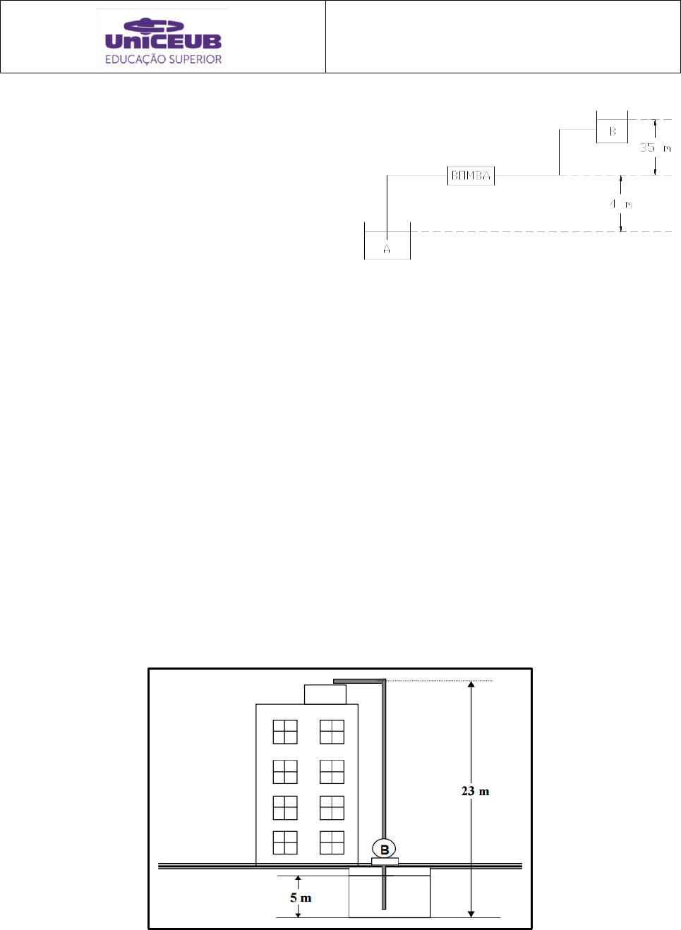 Hidráulica Aplicada Prof. Dr. Sérgio Garavelli 5ª Lista de exercícios 1 1. No sistema de recalque da figura abaixo, a perda de carga na sucção é de 1,2 m.c.a. e a perda de carga no recalque é de 12,3 m.c.a. Pede-se: a) A altura manométrica de recalque b) A altura manométrica de sucção c) A altura manométrica total 2. A bomba é utilizada para elevar água num sistema com altura estática de elevação igual a 15m. A tubulação tem um comprimento de 2750 m. Considere que o fator de atrito na tubulação é igual a 𝑓 = 0,02. Determine a potência da bomba para as condições do sistema, desprezando as perdas localizadas. 3. Um tubo de diâmetro constante de 50 cm, transporta água à uma vazão de 0,5 m3/s. Uma bomba é usada para elevar a água de posição de 30 m para 40 m. A pressão na seção 1 é de 70 kPa e a pressão na seção 2 é de 350 kPa. Qual a potência fornecida ao fluido escoado pela bomba? Dado: perda de carga (Hp) = 3 m, rendimento da bomba: 70%. 4. Em um pequeno edifício, uma bomba é utilizada para recalcar água de um reservatório subterrâneo para uma caixa de água situada no topo do edifício. A tubulação de recalque, conforme mostra a figura, tem diâmetro de ½” (0,5 polegada) e a vazão de água é 3 litros/s. Considerando a água um fluido ideal, determine: (Dados: reservatório subterrâneo tem grandes dimensões e está aberto para a atmosfera; g= 10 m/s2; 1”=2,54 cm e 1 HP 746 W) a) a altura manométrica da bomba (HB) b) a potência da bomba (em HP), considerando que o seu rendimento é 65%. Hidráulica Aplicada Prof. Dr. Sérgio Garavelli 5ª Lista de exercícios 2 5. Uma pequena central hidrelétrica apresenta vazão de 14 m3/s, para uma diferença de altura de 60 m. A perda de carga total é de 1,5 m. Qual a potência fornecida à turbina? Dado: rendimento da bomba de 75%. 6. O catálogo de uma bomba indica que para uma vazão o NPSH exigido é 4,60 m. Sabendo-se que ela será instalada em uma indústria a 1500 m de altitude, conduzindo água a 90ºC e a perda de carga calculada para a tubulação de sucção é 1,50 m, que posição a bomba poderá ser instalada em relação ao nível da água do reservatório de captação? 7. Deseja-se elevar água do reservatório A para o reservatório B. Sabe-se que a vazão é igual a 4 l/s. Determine: Dados: = 10.000 N/m³, g = 10m/s², dsuc = 10 cm, drec = 5 cm, VB = 10m³, ηB = 70%. (a) a velocidade da água na tubulação de sucção. (b) a velocidade da água na tubulação de recalque. (c) a potência da bomba (d) o tempo para encher o reservatório. Hidráulica Aplicada Prof. Dr. Sérgio Garavelli 5ª Lista de exercícios 3 8. No sistema de bombeamento mostrado na Figura para a vazão de recalque igual a 16 l/s, a perda de carga total na tubulação de sucção da bomba B1 é de 1,40 m. Para esta vazão, o N.P.S.H. requerido pela bomba é B2 é igual a 5,0 m. Pretendendo-se que a folga entre o N.P.S.H. disponível e N.P.S.H. requerido pela bomba B2 seja igual a 3,20 m, calcule o máximo comprimento do trecho da adutora entre as duas bombas. Toda adutora, sucção e recalque é de P.V.C. rígido C = 150, e de 4” de diâmetro. Temperatura média da água de 20º C. Dada a curva característica da Bomba B1. Desprezar as perdas de carga localizadas. 0,0 10,0 20,0 30,0 40,0 50,0 60,0 70,0 0,0 5,0 10,0 15,0 20,0 25,0 N P SH (m ) Q(L/s) Hidráulica Aplicada Prof. Dr. Sérgio Garavelli 5ª Lista de exercícios 4 9. Uma bomba centrífuga está montada em uma cota topográfica de 845,00m, em uma instalação de recalque cuja tubulação de sucção tem 3,5 m de comprimento, 4” de diâmetro, em P.V.C. rígido, C = 150, constado de uma válvula de pé com crivo e um joelho 90º. Para um recalque de água na temperatura de 20ºC e uma curva de NPSHrequerido dado pela Figura, determine a máxima vazão a ser recalcada para a cavitação incipiente. Se a vazão recalcada for 15 l/s, qual a folga entre o NPSHdisponível e NPSHrequerido. Altura estática de sucção igual a 2,0m e a bomba é não afogada. 0,00 2,00 4,00 6,00 8,00 10,00 12,00 0,0 5,0 10,0 15,0 20,0 25,0 30,0 N P SH ( m ) Vazão (L/s) 0,00 2,00 4,00 6,00 8,00 10,00 12,00 0,0 5,0 10,0 15,0 20,0 25,0 30,0 N P SH ( m ) Vazão (L/s) NPSHr NPSHd Hidráulica Aplicada Prof. Dr. Sérgio Garavelli 5ª Lista de exercícios 5 10. Um sistema de bombeamento está instalado a 900 m de altitude, bombeando água a 50 ºC. A altura do eixo da bomba em relação ao nível d’água no reservatório de captação é 5,31 m e a perda de carga calculada para a tubulação de sucção é 0,20 m. Sabendo-se que será utilizada a bomba com o NPSH requerido dado pela figura, verificar até que vazão poderá ser bombeada, admitindo-se NPSH disponível – NPSH exigido = 0,5 m. 0,00 1,00 2,00 3,00 4,00 5,00 6,00 7,00 8,00 9,00 10,00 0,0 5,0 10,0 15,0 20,0 N P SH r eq (m ) Q(L/s)