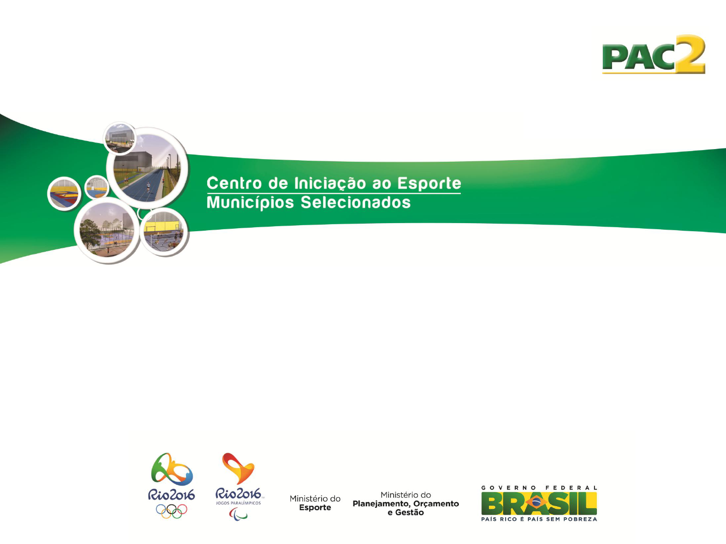 PROJETOS – PADRÃO DO CIE CIEs são projetos padronizados de Ginásio, para implantação em todo território brasileiro, elaborados em dois modelos de Layout. TIPOS DE MODELOS MODELO I – GINÁSIO MODELO II – GINÁSIO + QUADRA POLIESPORTIVA MODELO III – GINÁSIO + PISTA DE ATLETISMO MODELO I – GINÁSIO – 2.500 m2 MODELO I – GINÁSIO – 2.500m2 MODELO II – GINÁSIO + QUADRA – 3.500m2 MODELO II – GINÁSIO + QUADRA – 3.500m2 MODELO III – GINÁSIO + ATLETISMO – 7.000m2 MODELO III – GINÁSIO + ATLETISMO – 7.000m2 TIPOS DE GINÁSIO PELO LEIAUTE S – SIMPLES CARACTERÍSTICA: uma quadra poliesportiva oficial 20m x 40m. A quadra permite o uso longitudinal. Área construída: 1.600 m2. GINÁSIO SIMPLES GINÁSIO SIMPLES TIPOS DE GINÁSIO PELO LEIAUTE R – REVERSÍVEL CARACTERÍSTICA: uma quadra poliesportiva oficial 20m x 40m reversível para duas quadras oficiais de basquete. A quadra permite o uso longitudinal e transversal. Área construída: 1.750 m2. GINÁSIO REVERSÍVEL GINÁSIO REVERSÍVEL EXEMPLOS DE MODALIDADES POSSÍVEIS EXEMPLOS DE MODALIDADES POSSÍVEIS EXEMPLOS DE MODALIDADES POSSÍVEIS TIPOS DE GINÁSIO PELA VELOCIDADE DOS VENTOS Devido as grandes diferenças de condições climáticas e de ventos , projetos de estrutura metálica dos ginásios dimensionados com os seguintes critério: • Região Sul, estado de São Paulo, Mato Grosso do Sul e Sul de Minas - estruturas metálicas projetadas para ventos de 45m/s. • Demais regiões - estruturas metálicas projetadas para ventos de 40 m/s. Obs.: foram utilizados mapas de isopletas constantes das normas técnicas para projetos de estruturas metálicas. MAPA EÓLICO DO BRASIL TIPOS DE GINÁSIO NOMENCLATURA ADOTADA Além da terminologia M1, M2 e M3, já citada, serão seguidos de: Para Ginásio Simples: S40 – Ginásio Simples para vento de 40 m/s S45 – Ginásio Simples para vento de 45 m/s Para Ginásios Quadras reversíveis: R40 – Ginásio Reversível para vento de 40 m/s R45 – Ginásio Reversível para vento de 40 m/s TAREFAS DA PREFEITURA • DEFINIR, PARA O MODELO SELECIONADO, SE UTILIZARÁ O GINÁSIO SIMPLES OU REVERSÍVEL. • VERIFICAR TAMBÉM VELOCIDADE DE VENTO DA SUA REGIÃO. • ANALISAR A COMPATIBILIDADE DO MODELO COM O TERRENO. Caso terreno incompatível – possibilidade de adoção Modelo inferior. “Art. 5° O proponente poderá alterar cada uma das propostas selecionadas para modelo do CIE de dimensão inferior e comunicará a alteração ao Ministério do Esporte pelo e-mail cie@esporte.gov.br em até 30 dias a partir da data da publicação desta portaria. “ TAREFAS DA PREFEITURA Mudança de terreno – não é possível: “Art. 7º Não será admitida a alteração de terreno selecionado.” ESCOLHA DO PROJETO: Atenção para nomenclatura!! Utilize o projeto adequado para a sua região. Para localidades com ventos superiores aos 45 m/s os projetos de estrutura metálica deverão ser refeitos com o acréscimo necessário de peso de aço. Os valores de acréscimo ficarão a cargo dos municípios. IMPORTANTÍSSIMO CARACTERÍSTICAS CONSTRUTIVAS GERAIS • estrutura mista com fundações e estrutura de concreto e fechamentos laterais e cobertura em estrutura metálica e telhas termoacústicas e venezianas. • vedação em alvenaria de tijolos de concreto. • caixilhos de alumínio. • utilização de preceitos de sustentabilidade como equipamentos para uso de energia solar. • acessibilidade universal. • equipamentos esportivos em medidas oficiais e de primeira linha para garantir o desempenho dos atletas. • preocupação com conforto ambiental térmico e acústico. • condições de segurança. CARACTERÍSTICAS CONSTRUTIVAS GERAIS CARACTERÍSTICAS CONSTRUTIVAS GERAIS CARACTERÍSTICAS CONSTRUTIVAS GERAIS Ginásios projetados inicialmente para diversas modalidades esportivas olímpicas e paraolímpicas: Olímpicas .Tênis de mesa; . Judô; . Boxe; .esgrima; .Taekwondo; .Volei; .Basquete; .Futsal; .Handebol; .Badminton; .Ginástica artística e ritmica;e . Levantamento de peso. CARACTERÍSTICAS CONSTRUTIVAS GERAIS Ginásios projetados inicialmente para diversas modalidades esportivas olímpicas e paraolímpicas: Paraolímpicos .Volei sentado; .Goalboll. Atletismo locado na área externa – Modelo III Obs.: para algumas destas modalidades a quadra poderá/deverá ser substituída por equipamentos necessários a configuração e implantação das mesmas. CARACTERÍSTICAS CONSTRUTIVAS GERAIS Premissas do projeto: • fácil adequação para permitir o enquadramento do ginásio em locais que possuem características tão distintas entre si como temperatura, clima, solo, salinidade, entre outros. • materiais de fácil aplicação e acesso em todo o território nacional foram adotados preferencialmente. • Técnicas construtivas simples e de fácil adoção. • materiais de vedação robustos (telhas termoacústicas) para garantir conforto térmico e acústico para um espectro maior em relação a variável de temperatura e clima. • equipamentos esportivos com dimensões oficiais e especificações técnicas que garantam o desempenho dos atletas. CARACTERÍSTICAS CONSTRUTIVAS GERAIS Premissas do projeto: • Alguns quantitativos existentes na planilha orçamentárias serão fixos e outros variáveis. Os itens variáveis serão especificados na planilha e as alterações serão provenientes dos novos projetos de fundações e de implantação. • Custos advindos de implantações ou solos não favoráveis, que acarretem acréscimo de orçamento, ficarão a cargo das respectivas prefeituras. PROJETOS A SEREM DISPONIBILIZADOS PROJETO BÁSICO DE: .Arquitetura; .Hidráulica completa; .Elétrica completa; .Estruturas de concreto . .Fundações (apenas para estimativa de orçamentos)* .Estruturas metálicas, .Incêndio, .SPDA, .Acessibilidade. .Comunicação Visual, .Memoriais, .cronograma de referência e orçamento de obra. Fases de Execução/Implantação Para desenvolvime