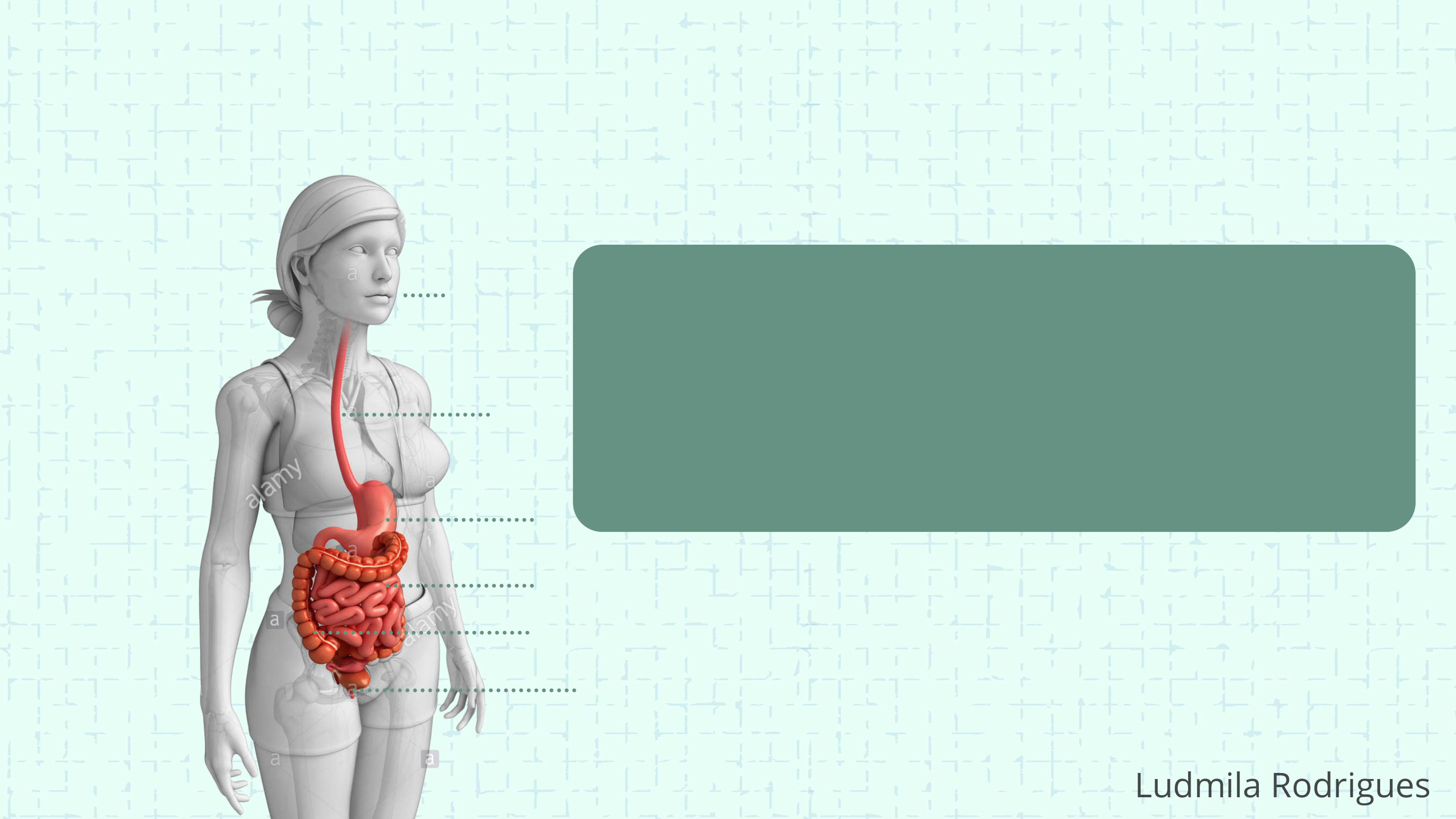 Sua função é de receber o alimento e triturar, dissolver e misturar os alimentos, impulsionando-os pelo trato gastrointestinal. Digerir os alimentos através do processo de degradação química e mecânica, posteriormente absorção de nutrientes e outras substâncias que passam dos alimentos para o sangue e para a linfa. E por último a eliminação das fezes do trato gastrointestinal (processo de defecação), onde são eliminados revestimentos do trato gastrointestinal, células não utilizadas pelo organismo, bactérias e matérias orgânicos não absorvidos. 1 2 3 4 6 5 MAPA MENTAL - SISTEMA DIGESTIVO FUNÇÃO 1.BOCA 2.ESÔFAGO 3.ESTÔMAGO 4.INTESTINO DELGADO 5.INTESTINO GROSSO 6.RETO Ludmila Rodrigues ESÔFAGO: Transporte de alimentos sólidos, pastosos e líquidos (já parcialmente digeridos pela boca), para o estômago. O transporte se dá através de movimentos peristálticos com ondas involuntárias e automáticas de contração. MAPA MENTAL - SISTEMA DIGESTIVO FUNÇÃO ESTÔMAGO: Digestão química e mecânica, absorção, secreção de hormônios. INTESTINO DELGADO E GROSSO: Digestão de alimentos e absorção de nutrientes e água, para manter o corpo nutrido, hidratado e funcionando corretamente. Também permite a eliminação de toxinas e outros produtos que não podem ser absorvidos pelo corpo, que acabam sendo eliminados sob a forma de fezes. Ludmila Rodrigues MAPA MENTAL - SISTEMA DIGESTIVO ESTÔMAGO Ludmila Rodrigues MAPA MENTAL - SISTEMA DIGESTIVO INTESTINO DELGADO E GROSSO Cólon transverso Cólon ascendente Ceco Apêndice Cólon descendente Cólon singmoide Reto Duodeno Jejuno Íleo Ludmila Rodrigues