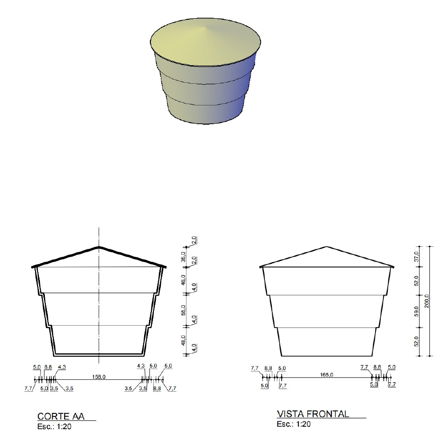 CAPÍTULO 1: TUTORIAL PARA CONSTRUÇÃO DE UMA CAIXA D´ÁGUA Neste capítulo iremos modelar uma caixa d’água em 3D, que posteriormente será utilizada também em outros projetos. Para a realização desse trabalho, um dos comandos mais importantes que utilizaremos é o REVOLVE, no qual rotacionamos uma base em 2D já estabelecida, formando assim um objeto sólido. Veja abaixo como ficará a caixa d’água ao final deste capítulo: Figura 1.1: caixa d’água modelada em 3D. Á seguir, veja a representação em 2D da caixa d´água (vista frontal, corte AA e vista superior): Figura 1.2: vista frontal e corte AA. Figura 1.3: vista superior. Para dar início a modelagem em 3D solicitamos que você desenhe metade da secção, isso é, a metade da caixa d´água representando apenas aquilo que é seccionado pelo plano de corte (sem representar aquilo que é visto ao fundo), a partir das medidas correspondentes, porém não é necessário fazer as cotas, elas estão presentes apenas para lhe auxiliar. Segue abaixo o que você desenhará em 2D, utilizando os comandos com os quais já esteja familiarizado: Figura 1.4: modelo 2D a ser desenhado. Dica: para facilitar seu trabalho, desenhe apenas as linhas externas de acordo com as medidas acima (em formato de polyline), utilize o comando “offset” com distancias de 4.0 para a caixa d’água e 2.0 para a tampa. Ambas com offset para dentro da figura. Caso você tenha feito o desenho acima utilizando linhas, o próximo passo é transformar estas linhas em polylines, que são figuras fechadas. Se você já desenhou em polyline, poderá pular essa etapa. Para transformar as linhas em polylines, utilize o comando “boundary” digitando “BO” na barra de comandos, com a figura toda enquadrada na tela do computador. Abrirá uma janela chamada “Boundary Creation”, clique em “Pick Points” e então, clique em qualquer lugar que esteja dentro das linhas criadas e depois enter. Pronto, está criada a polyline da caixa. Repita o mesmo processo para as linhas da tampa. Por fim, temos as bases prontas para iniciar nosso projeto em 3D. A princípio, vamos trabalhar com a caixa d’água, e depois com a tampa. Você deverá alterar a visualização do AutoCAD para 3D, da seguinte maneira: no canto inferior direito da tela, você verá um botão de uma engrenagem (imagem abaixo), clique nele e altere para a opção “3D Modeling”. Agora, podemos iniciar o processo de modelamento da caixa d’água. Figura 1.5: alteração para 3D. No menu “View”, altere a vista para “sw isometric”, clicando neste botão: . Você verá os desenhos feitos da seguinte maneira: Figura 1.6: vista sw isometric. Obs.: para facilitar o processo, você pode deslocar a tampa da caixa d’água utilizando o comando “move”, como foi feito no exemplo acima. Ao final do capítulo recolocaremos a tampa na posição adequada. Agora, vamos dar forma à caixa d’água: no menu “Surface”, acione o comando “revolve” (ou apenas digite “REV” e em seguida enter). Na barra de comando irá pedir “select object to revolve or”, clique na polyline criada da caixa d’água e em seguida, enter. Na barra de comando irá aparecer: “specify axis start point or define axis by”, clique no ponto que delimita o fim da base inferior da polyline (ponto A da imagem abaixo) e em seguida no ponto logo acima (ponto B) e então, digite 360. Digite enter. Figura 1.7: indicação dos pontos para ser feito o revolve da caixa. Como podemos ver. A caixa d’água está pronta, porém, deitada. Precisamos deixa-la em pé. No menu “Modify”, selecione a ferramenta “3D rotate”. O comando irá pedir “select object”, então, clique na caixa d’água e em seguida, enter. Aparecerão 3 círculos, representando os três eixos de coordenadas (x,y,z). Clique no círculo vermelho, que representa a coordenada x, que é a que queremos rotacionar. Então, digite 90 e em seguida, enter. Pronto, a caixa está na orientação certa, da seguinte maneira: Figura 1.8: rotação da caixa modelada em 3D. Agora, iremos repetir o mesmo processo para a base 2D da tampa da caixa: no menu “Surface”, acione novamente o comando “revolve” (ou apenas digite “REV” e em seguida enter). Na barra de comando irá pedir “select object to revolve or”, clique na polyline criada da tampa da caixa d’água e em seguida, enter. Na barra de comando irá aparecer: “specify axis start point or define axis by”, clique no ponto inferior do topo da tampa (ponto A da imagem abaixo) e em seguida no ponto logo acima (ponto B) e então, digite 360. Digite enter. Figura 1.9: indicação dos pontos para ser feito o revolve da tampa. Novamente, percebemos que a tampa ficará na orientação errada. Precisamos corrigir da mesma forma que fizemos com a caixa: No menu “Modify”, selecione a ferramenta “3D rotate”. O comando irá pedir “select object”, então, clique na tampa e em seguida, enter. Aparecerão 3 círculos, representando as três coordenadas. Clique no círculo vermelho, que representa a coordenada x, que é a que queremos rotacionar. Então, digite 90 e em seguida, enter. Por fim, temos os dois objetos prontos, basta apenas colocar a tampa no seu devido lugar. Primeiramente, vamos movê-la, de modo que fique alinhada ao centro da caixa d’água: no menu “Modify”, acione o comando “Move”. A barra de comando irá pedir para selecionar um objeto. Selecione a tampa e digite enter. Então você precisará selecionar um ponto base (specify base point), selecione o centro da tampa (como mostra a figura a seguir), clique enter. Figura 1.10: ponto central da tampa. Agora, precisamos dar um destino ao objeto: na barra de comandos, irá aparecer “specify second point, or”, selecionaremos então o ponto central da caixa d’água, como mostra a imagem: Figura 1.11: ponto central da caixa. Teremos então, o seguinte resultado: Figura 1.12: tampa movida para o centro da ca