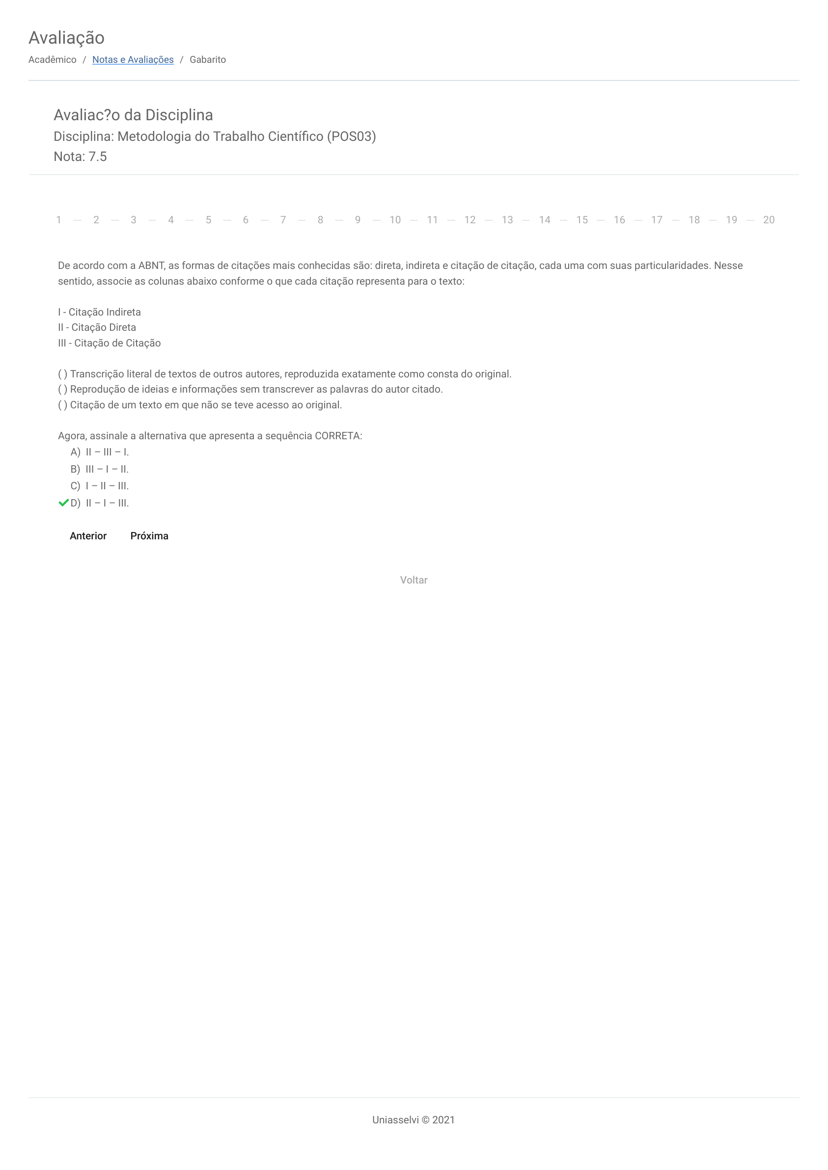 14/04/2021 AVA https://ava.uniasselvi.com.br/academico/notas_e_avaliacaoes/gabarito/642455 1/1 Uniasselvi © 2021 Avaliação Acadêmico / Notas e Avaliações / Gabarito Avaliac?o da Disciplina Disciplina: Metodologia do Trabalho Cientí�co (POS03) Nota: 7.5 De acordo com a ABNT, as formas de citações mais conhecidas são: direta, indireta e citação de citação, cada uma com suas particularidades. Nesse sentido, associe as colunas abaixo conforme o que cada citação representa para o texto: I - Citação Indireta II - Citação Direta III - Citação de Citação ( ) Transcrição literal de textos de outros autores, reproduzida exatamente como consta do original. ( ) Reprodução de ideias e informações sem transcrever as palavras do autor citado. ( ) Citação de um texto em que não se teve acesso ao original. Agora, assinale a alternativa que apresenta a sequência CORRETA: A) II – III – I. B) III – I – II. C) I – II – III. D) II – I – III. 1 2 3 4 5 6 7 8 9 10 11 12 13 14 15 16 17 18 19 20 Anterior Próxima Voltar https://ava.uniasselvi.com.br/academico/notas_e_avaliacaoes