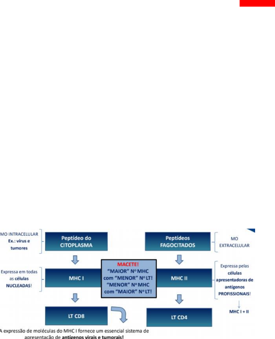 1 LAIANE SOUSA - IMUNOLOGIA Importância do MHC nas respostas imunes 0s TCR dos linfócitos T não reconhecem antígenos na sua forma solúvel e por isso precisam da apresentação pelas moléculas de MHC. Já BCR dos linfócitos B , reconhecem antígenos solúveis, antígenos de superfície microbiana e antígenos associados a células. ➢ O MHC tem uma importância fundamental para apresentação de antígenos peptídicos para reconhecimento por LT CD4 e LT CD8. ➢ Eles estão ligados na membrana celular, ou seja, não estão soltos na corrente sanguínea ➢ E o contato do MHC-peptido com LT é um contato célula-célula. Nos temos dois tipos de MHC, MHC I: está expresso na superfície de todas as células nucleadas. MHC II: são mais restritos a alguns tipos celulares que são as células profissionais apresentadoras de antígenos, que são: células dendríticas, macrófagos e linfócitos B (essas células também possuem MHC I) Fenômeno de restrição do MHC Se eu tiver um peptídeo no citoplasma ou seja dentro da minha célula, ele vai ser apresentado pelo MHC I para o linfócitos TCD8, e o MHC I vai mostrar microrganismo 2 LAIANE SOUSA - IMUNOLOGIA intracelulares como vírus e tumores, então esse é um mecanismo de apresentação essencial para mostrar microrganimos intracelulares. Quando o pepetideos estão em vesículas, ou seja microrganismo que foram fagocitados, ele vai ser apresentado pelo MHC II para o linfócito TCD4, que vai produzir citocinas que vai atuar em outras células, então ele vai atuar nessas células fagocíticas que tem microrganismo depois que foi apresentado pelo MHC II. Nessa imagem tem a interação do TCR com o MHC-peptídeo. Percebe que o peptídeo interage diretamente com vários locais do MHC, então quando o TCR vem se associar ao MHC, ele vai se associar tanto ao peptídeo quando o MHC. Ou seja o TCR reconhece o complexo (tanto o MHC quanto o peptídeo). Os resíduos polimórficos do MHC (região circulada) é a parte mais variável que mais varia os aminoácidos, ai a gente tira de conclusão que o TCR reconhece essas duas partes, então se eu tiver qualquer alteração no meu peptídeo antigênico, vai haver perda da especificidade do meu TCR por esse complexo. EXPRESSAO CODOMINANTE DO MHC Isso significa que tem uma grande variedade de MHC da população. Significa que não vou ter dominância de um gene sobre outro, eu posso ter genes só da minha mãe, posso ter genes misturados, posso ter genes só do meu pai, e isso gera uma alta variabilidade e isso é muito importante. E isso explica também por que meu irmão pode não ter o gene MHC compatível com o meu, pois tem muitas variações. GENÉTICA DO MHC O gene do MHC é determinado por uma região chamada HLA que significa antígeno de leucócitos humano. O HLA é o que vai codificar o nosso MHC e essa região é equivalente a região H2 nos camundongos e isso é importante saber pois muitos dos experimentos foram feitos em linhagem de camundongos, e em muitos artigos pode ta escrito H2. O MHC humano está localizado no braço curto do cromossomo 6 As regiões que vão codificar o MHC: ➢ MHC I: HLA-A, HLA-B e HLA-C ➢ MHC II: HLA-DP, HLA-DQ e HLA-DR 3 LAIANE SOUSA - IMUNOLOGIA A expressão de moléculas do MHC é aumentada pelas citocinas produzidas durante a resposta imune e adaptativas. O MHC I: Expressão aumentada por IFN-α, IFN-β e IFN-γ produzidos durante a resposta imune inata contra vírus: amplifica a apresentação para o LTCD8. (vai ser sempre expressada mas vai aumentar quando tiver uma infecção viral e em resposta isso vai liberar essas citocinas que vai amplificar a resposta do TCD8) O MHC II: Expressão estimulada em APCs, principalmente, pelo IFN-γ, Aumenta a ativação de LT CD4. Tipo de células que secreta IFN-γ: Células NK e LT CD4 É importante eu ter uma expressão mais aumentada de MHC pois quanto mais MHC mais vou mostrar para os linfócitos e mais eficientes vai ser a resposta imune. PROPRIEDADES DO MHC Os dois MHC tem uma região chamada fenda de ligação para peptídeo ou região ligante de peptídeo, e dentro dessa área, a gente vai ter os resíduos polimorficos do MHC que é aquela região que mais varia, bem na base nas adjacência da fenda de ligação para os peptídeos. 4 LAIANE SOUSA - IMUNOLOGIA Eles tem uma região chamada domínios do tipo imunoglobolina (Ig) que é a região mais arredonda e a importância dessa região, é que vai ser o local de ligação da proteína CD4 e CD8 dos meus linfócitos. A região do alfa 3 vai se associar a proteína CD8, é por isso o MHC de classe I vai apresentar pro linfócito CD8. formado por 2 cadeias polipeptídicas: cadeia α longa e cadeia β curta MHC I : região ligante de peptídeos composta pelos domínios α1 e α2. MHC II: região ligante de peptídeos composta pelos domínios α1 e β1. MHC II: formado por 2 cadeias polipeptídicas de tamanho idêntico. MHC II: ligação da proteína CD4 na região β2. MHC I: ligação da proteína CD8 na região α3. 5 LAIANE SOUSA - IMUNOLOGIA Cada molécula de MHC I ou II tem uma única fenda de ligação para peptídeo que se liga a um peptídeo de cada vez, mas cada molécula do MHC pode se ligar a diversos peptídeos diferentes, pois a região de ligação é bastante variável. Diferentes peptídeos que se ligam à mesma molécula do MHC são capazes de inibir competitivamente a apresentação do outro. Existência de uma fenda de ligação de peptídeos que vai da a especificidade a especificidade é o TCR pois tem alta especificidade. Quem vai da a especificidade mesmo é o TCR pois tem muita especificidade. Não esquecer: O reconhecimento do TCR é pelo complexo todo (peptídeo =+ MHC) A associação de peptídeo com a molécula do MHC é uma interação saturável com taxa de dissociação lenta. Isso é importante porque tem uma atuação de diversas enzimas que vão associar o peptídeo com o MHC (vai ver melhor esse processo na aula de proce