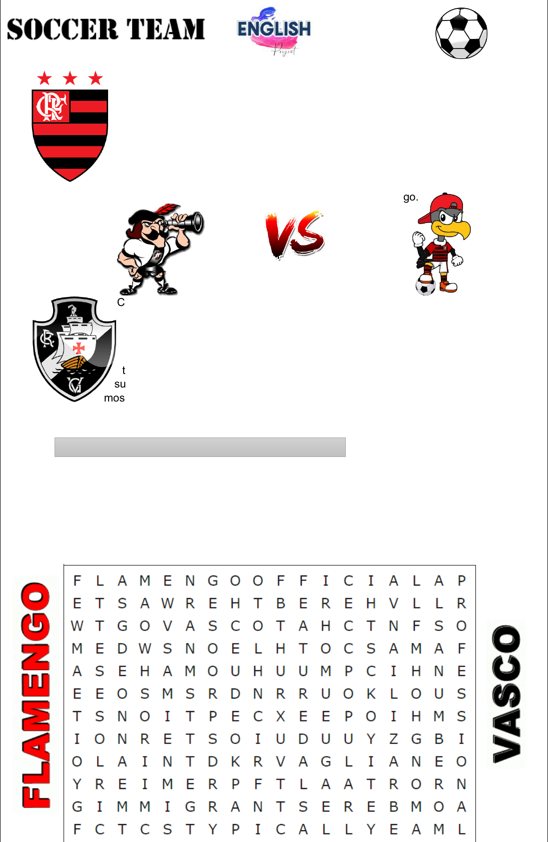 Clube de Regatas do Flamengo (Brazilian Portuguese: [ˈklubi dʒi ʁeˈɡataʒ du flaˈmẽɡu]; English: Flamengo Rowing Club), commonly referred to as Flamengo, is a Brazilian sports club based in Rio de Janeiro best known for their professional football team. The club was first established in 1895 as a rowing club and played their first official match in 1912. Flamengo's traditional uniform featured red and black striped shirts with white shorts, and red and black striped socks. Flamengo had typically played their home matches in the Maracanã, the national stadium of Brazil, since its completion in 1950, with some exceptions in recent years. Since 1969, the vulture (Portuguese: urubu) has been the most recognized mascot of Flamengo. Club de Regatas Vasco da Gama (Brazilian Portuguese: [ˈklubi dʒi ʁɛˈgataʃ ˈvaʃku dɐ ˈgɐ̃mɐ]) is a Brazilian sports club that was founded on August 21, 1898 (although the professional football department started on November 5, 1915), by Portuguese immigrants, and still has a strong fanbase among the Portuguese community of Rio de Janeiro. It is one of the most popular clubs in Brazil, with more than 30 million supporters. Although they compete in a number of different sports, Vasco is mostly known for its football team. It plays in the Campeonato Carioca, the state of Rio de Janeiro's premier state league and in the Campeonato Brasileiro Série A, the first tier of Brazilian football league system. Answer the following questions according to the text. 1- Which team do you prefer above? Why? _____________________________________________________________________ 2- What team do you root for? _____________________________________________________________________ 3- Find the words in Bold of the text in the WordSearch. https://en.wikipedia.org/wiki/Help:IPA/Portuguese https://en.wikipedia.org/wiki/Help:IPA/Portuguese https://en.wikipedia.org/wiki/Rio_de_Janeiro https://en.wikipedia.org/wiki/Association_football https://en.wikipedia.org/wiki/Rowing_(sport) https://en.wikipedia.org/wiki/Maracan%C3%A3_Stadium https://en.wikipedia.org/wiki/Help:IPA/Portuguese https://en.wikipedia.org/wiki/Help:IPA/Portuguese https://en.wikipedia.org/wiki/Association_football https://en.wikipedia.org/wiki/Portuguese-Brazilian https://en.wikipedia.org/wiki/Campeonato_Carioca https://en.wikipedia.org/wiki/States_of_Brazil https://en.wikipedia.org/wiki/States_of_Brazil https://en.wikipedia.org/wiki/Rio_de_Janeiro_(state) https://en.wikipedia.org/wiki/State_football_leagues_in_Brazil https://en.wikipedia.org/wiki/Campeonato_Brasileiro_S%C3%A9rie_A https://en.wikipedia.org/wiki/Brazilian_football_league_system SOLUTION