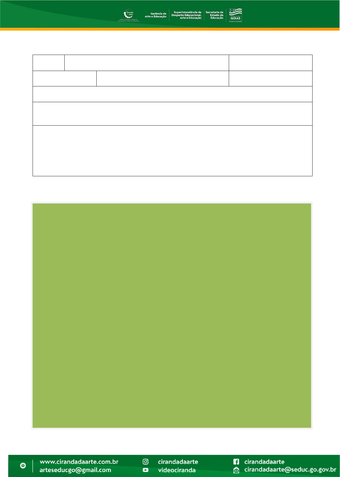 ATIVIDADE ARTE – ARTES VISUAIS Nome: Data: ___/___/2020 Unidade Escolar: Ano: 4º Componente Curricular: ARTE/ARTES VISUAIS Objetos de Conhecimento/Conteúdos: Contextos e Práticas: Patrimônio cultural material e imaterial Habilidades: (GO-EF04AR25) Conhecer e valorizar o patrimônio cultural, material e imaterial, de culturas diversas, em especial da brasileira, incluindo suas matrizes indígenas, africanas e europeias, de diferentes épocas, construir e compreender o vocabulário e repertórios relativos às diferentes linguagens artísticas, respeitando seus contextos pessoais e sociais. ATIVIDADE 007 Você já viu um indígena? Conhece alguém que é de descendência indígena? ARTE INDÍGENA BRASILEIRA É a forma das tribos expressarem a sua cultura. Cada tribo indígena possui comportamentos e costumes próprios que as diferenciam uma da outra. Assim, também produzem a sua arte, que guarda aspectos individuais de cada tribo. Ela está presente na pintura corporal do índio, nas plumagens que eles usam, na arte em cerâmica, nas cestarias feitas de palhas, nas máscaras e até mesmo nas danças e rituais. Para desenvolver a arte, os índios também fazem uso de outros elementos e objetos, como a madeira, miçangas, palmas, sementes, cipó, couros, ossos, casca de coco, dentes, conchas, garras de animais, etc. Os índios brasileiros foram os primeiros habitantes encontrados em nosso país pelos colonizadores portugueses. Os portugueses ficaram deslumbrados com tanta criatividade. Eles admiravam a arte indígena, mas também exploraram os índios além de escravizá-los. São elementos da arte indígena: Cerâmica indígena, Pintura corporal indígena, Plumagem indígena, Máscaras indígenas, Cestaria indígena, Dança indígena... A) Você sabe o que é uma peça de cerâmica? Pergunte aos seus pais ou irmãos qual é o material usado para fazer uma peça de cerâmica. Descreva quais objetos feitos de cerâmica tem na sua casa. ___________________________________________________________________________ ___________________________________________________________________________ ___________________________________________________________________________ Vamos ver algumas imagens de arte indígena brasileira: FIGURA 1 FIGURA 2 Fonte figuras 1 e 2: https://laart.art.br/blog/arte-marajoara/ (Acesso: 05/05/2020) Nas figuras 1 e 2 você pode observar exemplos de CERÂMICA MARAJOARA, desenvolvida por índios que moravam na Ilha de Marajó - PA. A arte marajoara é composta por cerâmica/barro trabalhados de maneira cuidadosa e detalhada. As tribos indígenas combinavam cores que tornavam as peças sofisticadas. Essas cores eram extraídas da natureza local, como: urucum, caulim, sementes, folhas, jenipapo, carvão, fuligem. Mas também existiam peças sem cores, o que variava era o tom do barro. Além de decorativa, a cerâmica marajoara também era funcional, eram úteis. Exemplos de arte marajoara estão: os vasos, potes, urnas funerárias, estátuas, miniaturas e brinquedos. Figura 3 Fonte: https://laart.art.br/blog/arte-marajoara/ (Acesso: 05/05/2020) https://laart.art.br/blog/arte-marajoara/ https://laart.art.br/blog/arte-marajoara/ https://laart.art.br/blog/arte-marajoara/ https://laart.art.br/blog/arte-marajoara/ https://laart.art.br/blog/arte-marajoara/ https://laart.art.br/blog/arte-marajoara/ https://laart.art.br/blog/arte-marajoara/ https://laart.art.br/blog/arte-marajoara/ https://laart.art.br/blog/arte-marajoara/ https://laart.art.br/blog/arte-marajoara/ Você observou que na arte marajoara (figuras 1, 2 e 3), as peças em argila/cerâmica têm ricos detalhes com uso de linhas que formam desenhos e imagens diferentes! Observe as figuras abaixo! Figura 4 Figura 5 Fonte Fig. 4: https://i.pinimg.com/originals/e5/1d/19/e51d19bd78f1108011f0d158d5e90f72.png (Acesso 05/05/2020) Fonte Fig. 5: https://www.arteblog.net/wp-content/uploads/2013/03/Ceramica-533x280.jpg (Acesso 05/05/2020) B) Agora é a sua vez! Preencha os espaços dos objetos abaixo, usando linhas para compor o seu trabalho. Use cores variadas! https://i.pinimg.com/originals/e5/1d/19/e51d19bd78f1108011f0d158d5e90f72.png https://i.pinimg.com/originals/e5/1d/19/e51d19bd78f1108011f0d158d5e90f72.png https://www.arteblog.net/wp-content/uploads/2013/03/Ceramica-533x280.jpg https://www.arteblog.net/wp-content/uploads/2013/03/Ceramica-533x280.jpg https://www.arteblog.net/wp-content/uploads/2013/03/Ceramica-533x280.jpg https://www.arteblog.net/wp-content/uploads/2013/03/Ceramica-533x280.jpg https://www.arteblog.net/wp-content/uploads/2013/03/Ceramica-533x280.jpg https://www.arteblog.net/wp-content/uploads/2013/03/Ceramica-533x280.jpg https://www.arteblog.net/wp-content/uploads/2013/03/Ceramica-533x280.jpg C) Numa folha ou no verso desta, faça um desenho de observação de um objeto da sua casa que você gosta: celular, uma vasilha, uma fruta, sua mochila, seu tênis, relógio, camiseta.... Pronto! Mas agora use a sua criatividade e faça a sua própria tinta com produto natural. Por exemplo: um pouco de pó de café, ou de terra, pó de açafrão, carvão, ou corante de alimentos... Lembre-se de pedir ajuda para alguém da sua família, de preferência um adulto! Pegue copinhos pequenos, coloque um pouco de pó da sua escolha (uma colherinha de café ou outro), acrescente algumas gotas de água e de cola branca. Misture tudo e pronto! Pode usar sua tinta para colorir o seu desenho! Espere secar e guarde suas atividades para levar pra sua escola quando as aulas retornarem! Lembre-se que as tribos indígenas e os povos antigos não tinham as tintas e lápis de cor. Eles mesmos faziam as suas tintas!