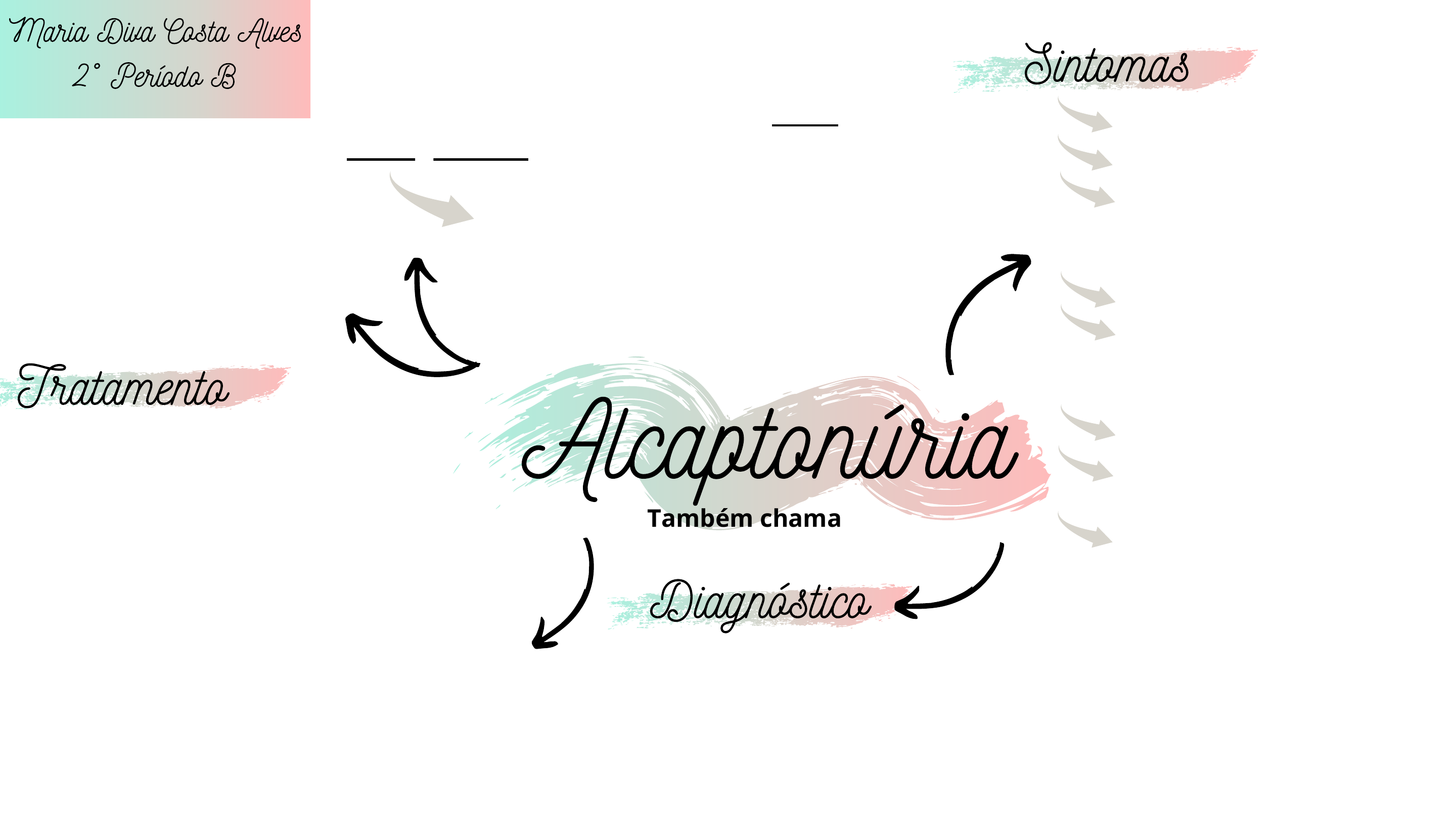 Alcaptonúria Também chamada de ocronose. Acontece devido à falta de uma enzima, a dioxigenase do homogentisato ou homogentisato oxigenase, o que leva ao acúmulo de ácido homogentísico. É um composto intermediário do metabolismo desses aminoácidos e que em condições normais não é detectável no sangue. Ajuda a reduzir os sintomas, pois não tem cura, sendo recomendado seguir uma dieta pobre em alimentos que contenham fenilalanina e tirosina, além do aumento do consumo de alimentos ricos em vitamina C. Pode ser recomendado o uso de analgésicos ou anti-inflamatórios, para aliviar as dores nas articulações e a rigidez das cartilagens, além de sessões de fisioterapia, que pode ser feita com infiltração de corticoides, para melhorar a mobilidade das articulações acometidas. Urina escura, quase negra; Cera dos ouvidos azulada; Manchas negras na parte branca do olho, ao redor da orelha e laringe; Surdez; Artrite que causa dores nas articulações e limitação dos movimentos; Rigidez das cartilagens; Pedra nos rins e na próstata, no caso dos homens; Problemas no coração; Através da análise dos sintomas, principalmente pela coloração escura característica da doença que surge em várias partes do corpo, além de exame laboratorial que têm como objetivo detectar a concentração do ácido homogentísico no sangue, principalmente, ou detectar a mutação por meio de exames moleculares. Doença rara caracterizada por um erro no metabolismo dos aminoácidos fenilalanina e tirosina, devido à uma pequena mutação no DNA. Sintomas Diagnóstico Tratamento Maria Diva Costa Alves 2° Período B