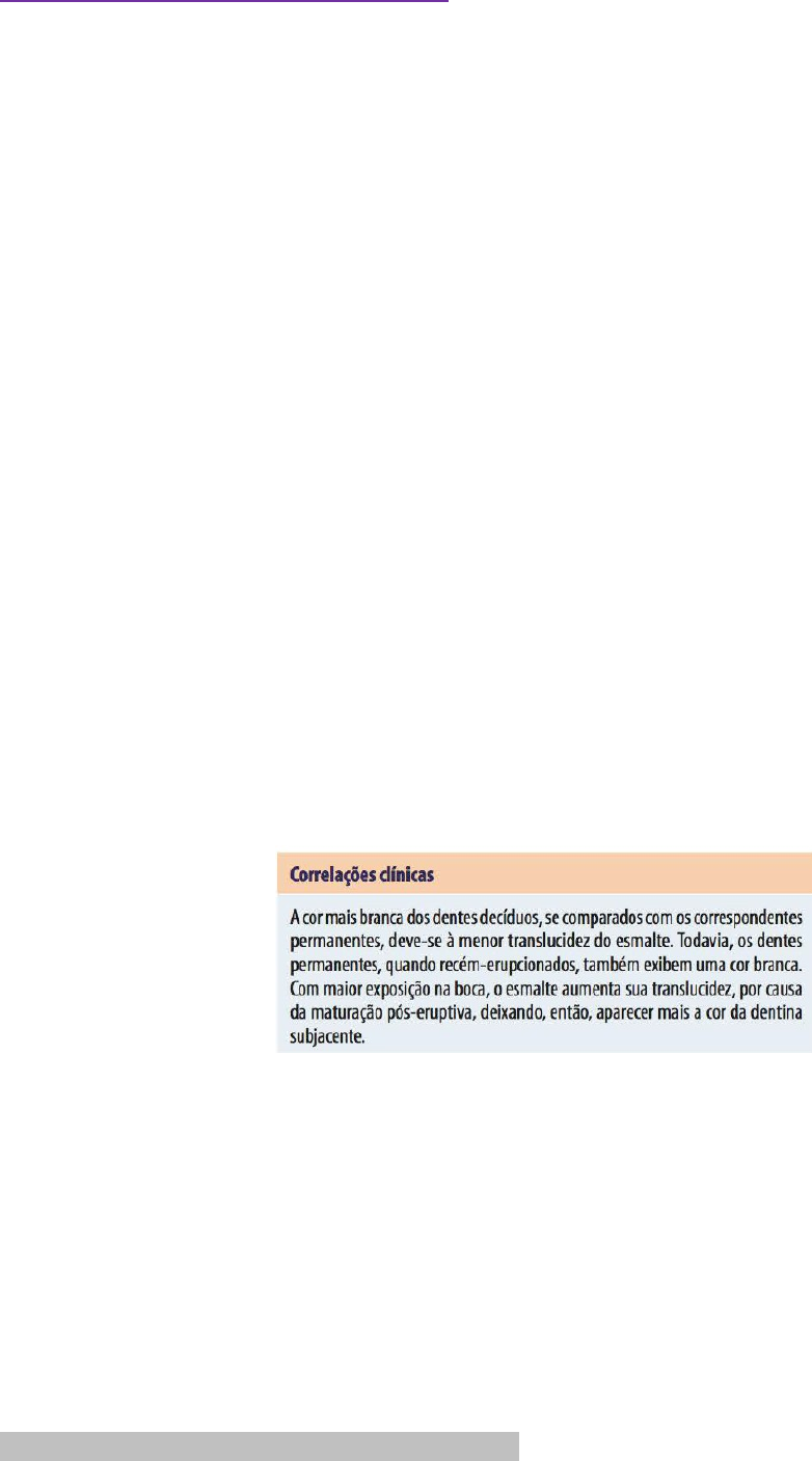 Embora a cor do esmalte varie do branco-acinzentado ao branco amarelado, sua estrutura quase exclusivamente cristalina resulta em uma aparência translúcida. Quanto maior o grau de mineralização do esmalte, maior é sua natureza cristalina e, portanto, sua translucidez. Essa característica influencia na cor do dente, uma vez que a translucidez e a delgada espessura do esmalte (a espessura máxima é de 2,5 mm na região dos vértices das cúspides ou nas bordas incisais) possibilitam ver a cor amarelada da dentina subjacente.