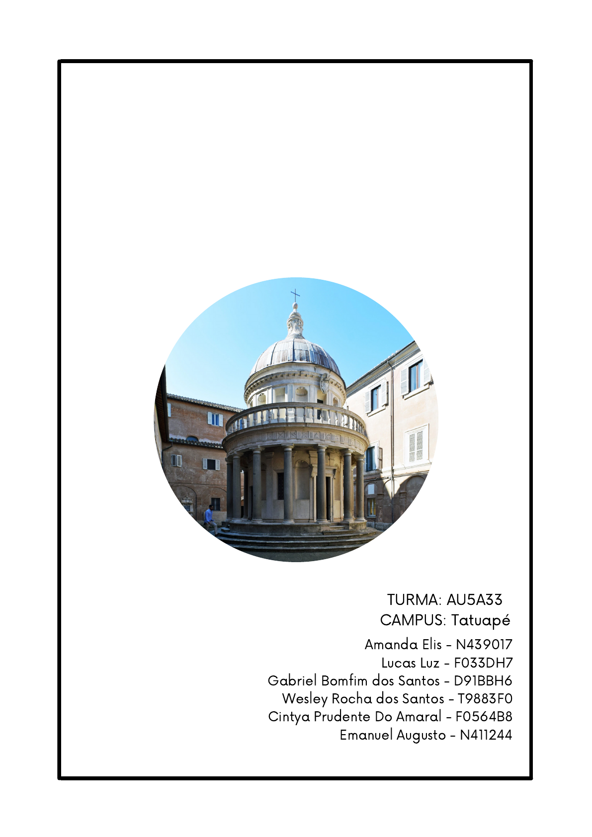São Pedro Montorio THAU III Amanda Elis - N439017 Lucas Luz - F033DH7 Gabriel Bomfim dos Santos - D91BBH6 Wesley Rocha dos Santos - T9883F0 Cintya Prudente Do Amaral - F0564B8 Emanuel Augusto - N411244 TURMA: AU5A33 CAMPUS: Tatuapé São Pedro Montorio Tipo de edificação: Templo Arquiteto: Donato Bramante Estilo: Renascentista Localização: Montorio – Roma – Itália Data: 1502 Elementos Compositivos É um templo circular, assentado numa plataforma de três degraus e cercado por uma colunata em ordem dórica, formada por 16 colunas. A parede do edifício cilíndrico articulada é dinamizada por nichos profundos com janelas retangulares, ritmadas por pilastras. Um forte entablamento separa o nível inferior (que contém o pórtico) do tambor que forma o segundo piso e que contém janelas para iluminação do espaço interior. A balaustrada sobreposta a este entablamento absorve transição volumétrica entre o pórtico circular e a cúpula. Sistema de Medidas e Proporções O edifício foi projetado usando as relações geométricas simples : a altura do Templo até a base da cúpula é igual a sua largura (x), a cúpula do edifício tem um raio igual a sua altura e a altura do tambor em que assenta (y) e o diâmetro da circunferência externa das colunas é igual a 3/2 o diâmetro da cúpula . Relação de proporção estabelecida através da repetição do círculo, uma das formas puras mais usadas Organização por formas geométricas Linhas e Eixos de Organização Presença de um eixo de simetria longitudinal na fachada e de simetria radial na planta. Hierarquia A transição dos espaços ocorre de maneira gradual. Na fachada principal do Covento de São Pedro, existem duas entradas, uma pela igreja e outra pelo convento. Ambas se abrirão para o claustro onde está o Tempietto que está sobre um pódio, que dá acesso ao peristilo, o qual faz a conexão com o interior de onde ainda parte um acesso para a cripta