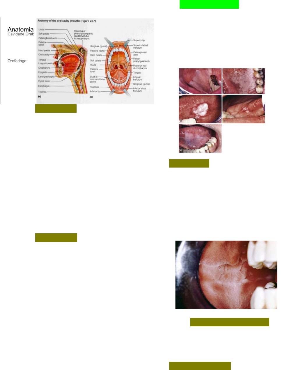 CAVIDADE ORAL E OROFARINGE LIMITE: OROFARINGE EMBRIOLOGIA: • ECTODERMA NÃO QUERATINIZADO • ENDODERMA RICO E COMPONENTE GLANDULAR SALIVAR • MESODERMA QUE VARIA DE TECIDO ÓSSEO A LINFOIDE • ESSA VARIAÇÃO EXPLICA AS MÚLTIPLAS VARIAÇÕES DE LESÕES LEUCOPLASIAS: - Qualquer lesão branca - Não é diagnostico -Dx: leucoedema, líquen plano, candidíase, nevo branco esponjoso -Lesão pré maligna mais comum (maioria é benigna) LEUCOPLASIA: • HOMENS • 50 – 80 ANOS • BRANCOS • TABAGISMO • EXPOSIÇÃO AO SOL • TRAUMA (COME AO SE REVERTER O TRAUMA) • CLINICA • VARIÁVEL • EVOLUTIVA • BX DIAGNOSTICA • TRATAMENTO: BX, BENIGNA: OBSERVAR OU RESSECÇÃO, PRÉ MALIGNA: RESSECÇÃO, MALIGNA: PREVENCAO E ACOMPANHAMENTO DOS GRUPOS DE RISCOS LEUCOEDEMA: • ESBRANQUIÇADA • OPALESCENTE • NEGROS • TABAGISTA • USO DE CANNABIS • VARIAÇÃO NORMALIDADE • ASSINTOMÁTICA LEUCOPLASIA PILOSA ORAL: • IMUNOSSUPRESSÃO SISTÊMICA • SORONEGATIVOS HIV • VÍRUS ESPTEN-BARR LÍQUEN PLANO ORAL: • IMUNOLÓGICA (LINFÓCITOS T) • MEIA IDADE • ASSINTOMÁTICA • DOENCAS SISTÊMICAS CAVIDADE ORAL E OROFARINGE • RISCO DE MALIGNIZACAO CANDIDÍASE ORAL: • INFECÇÃO OPORTUNISRA • CÂNDIDA albicans • FATORES LOCAIS - FUNÇÕES DE BARREIRA DA MUCOSA: TABAGISMO PESADO, CORPOS ESTRANHOS, MUCOSITE INDUZIDA POR RADIAÇÃO, USO DE CORTICOCOSTEROIDES TÓPICOS E INALATORIOS, XEROSTOMIA. FATORES SISTÊMICOS – IMUNOSSUPRESSÃO, IDADE, VÍRUS, RETROVÍRUS, QUIMIOTERAPIA, USO DE CORTICOCOSTEROIDE, DM, IMUNODEFICIÊNCIA INTRÍNSECA, MIELODISPLASIA, LEUCEMIA, USO DE ANTIBIÓTICOS. • CANDIDÍASE AGUDA: PSEUDOMEMBRANOSA, ERITEMATOZA, ATRÓFICA. • CANDIDÍASE CRÔNICA: HIPERPLASIA (LEUCOPLASIA POR CÂNDIDA), RELACIONADA A DENTADURA, GLOSSITE ROMBOIDE MEDIANA. LESÕES VESICOBOLHOSAS E ULCERATIVAS: • PÊNFIGO VULGAR • DOENCAS AUTOIMUNES MUCOCUTANEA • AUTOANTICORPO PROTEÇÃO ADESÃO QUERATINOCITOS • >50 • TRATAMENTO: IMUNOSSUPRESSÃO • HERPES VIRUS SIMPLES • HVS-1 • 90% DA POPULAÇÃO • ARMAZENADO NO NERVO TRIGEMIO (V PAR CRANIANO) • INFECÇÃO POR CONTATO DIRETO • LESAO RECORRENTE • FATORES DESECADEANTES: LESAO TRAUMATUCA E IATROGENICA, DOENCAS, CONDICOES E SÍNDROMES SISTEMICAS ASSOCIADAS, ALIMENTAÇÃO, CICLO MENSTRUAL. ERITEMA MULTIFORME: • HIPERSENSIBILIDADE AUTO LIMITADA • SD STEVENS-JOHNSON • EBV/HEPC/HVS-1 • REAÇÃO MEDICAMENTODA • TRATAMENTO CONFORME A GRAVIDADE CAVIDADE ORAL E OROFARINGE GRANULOMA TRAUMÁTICO: • ULCERA ORAL CRONICA RARA • DX DIFERENCIAL CEC TUMORES BENIGNOS: - CONGÊNITOS: TORUS, CRESCIMENTO ÓSSEO, ASSINTOMATICO TIREOIDE LINGUAL, DORSO DA LÍNGUA, NÃO DESCIDA, ASSINTOMÁTICA NA MAIORIA, HIPOTIREOIDISMO. CISTOS DE DESENVOLVIMENTO: RARO, CISTOS DERMOIDES, DUPLICAÇÃO, NASOALVEOLARES, CONTEÚDOS ANEXOS. FIBROMA: PSEUDOTUMOR, REACIONAL, MULHERES > 40. FIRME – PEDICULADA. ULCERAÇÕES DA MUCOSA: DX DIFERENCIAL LESÕES MALIGNAS, DIVERSAS CAUSAS COMO CROHN E BEHÇET. GRANULOMA PIOGÊNICO: LESAO ELEVADA PEDICULADA, EXCESSO ANASTOMOSES VASCULARES, TRAT EXÉRESE SIALOMETAPLASIA NECROSANTE: • BENIGNO • GLANDULAR SALIVAR • DX DIFERENCIAL • RESOLUTIVO 3-6 SEMANAS AMILOIDOSE: • DEPOSIÇÃO ANORMAL DE PROTREINA • TRATAMENTO: CAUSA E RESSECÇÃO PAPILOMA: • PAPILOMA ESCAMOSO • 4/1000 • PAPILOMA VÍRUS 6-11 • ASSINTOMATICO • RARAMENTE MALIGNIZA • EXCISÃO OU ABLASAO TUMOR DE CELULAS GRANULARES: • ORIGEM NEURAL • DORSO DA LÍNGUA CAVIDADE ORAL E OROFARINGE • 1% MALIGNIZA • EXÉRESE CIRÚRGICA TUMORES BENIGNOS: - NEUROFIBROMA - LIPOMA - HEMANGIOMA - AMELOBLASTOMA - TU ODONTOGENICO - MAXILA E MANDÍBULA - RARAMENTE MALIGNIZA - ADENOMATOSOS PLEOMORFICO NEOPLASIAS MALIGNAS: - ASSOCIADA AO TABAGISMO E ELITISMO - SOL (LÁBIO INFERIOR) - EPIDEMIOLOGIA: HOMENS 60%, BAIXA RENDA HISTOPATOLOGIA: - ESPESSURA DA LÍNGUA - GRAU DE DIFERENCIAÇÃO - INVASÃO VASCULAR - PERINEURAL LESAO PRÉ MALIGNA: • LEUCOPLASIA • ERITROPLASIA > RISCO CAVIDADE ORAL E OROFARINGE • DISPLASIA LEVE, MODERADA E GRAVE CARCINOMA ESPINOCELULAR: • CELULAS ESCAMOSAS • VARIÁVEIS • DIFERENCIAIS: KAPOSI, SARCOMAS, MELANOMA DESMOPLÁSICO • TRIAGEM, EXAME FISICO, ESTADIAMENTO PRÉ OPERATÓRIO, NUTRIÇÃO, AVALIAÇÃO DENTÁRIA, DONO • PROGNOSTICO: PELA ESPESSURA. • TRATAMENTO: ESTÁDIO, CLINICO, PSICOLÓGICO, CIRURGIA, ADJUVANTE • TRATAMENTO:RECONSTRUÇÃO, FUNÇÃO, FORMA, ESTÉTICA, EVITAR A MONSTRECTOMIA COM HORROROPLASTIA. • REABILITAÇÃO: DEGLUTIÇÃO, FALA, DOR, RECIDIVA ELEVADA.. O carcinoma espinocelular, também conhecido como CEC ou carcinoma de células escamosas, é um tipo de câncer de pele que surge, principalmente, na boca, língua e esôfago e provoca sinais e sintomas como feridas que não cicatrizam, que sangram facilmente e manchas ásperas na pele, com bordas irregulares