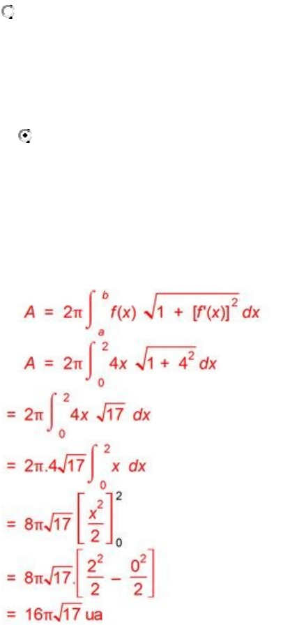 Considerando o texto e os conteúdos do livro-base Cálculo diferencial e integral a várias variáveis, o valor da área de uma superfície cônica gerada pela revolução do segmento de reta dado pela equação y=4x